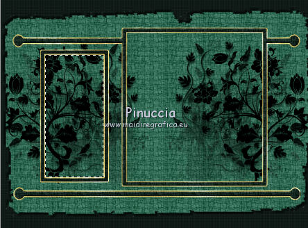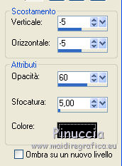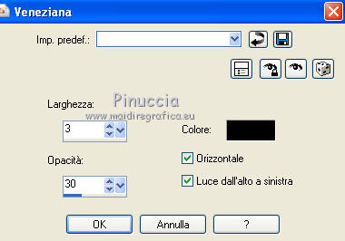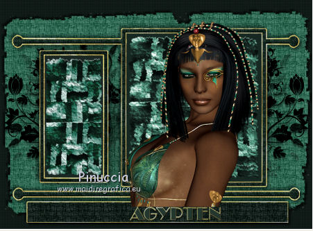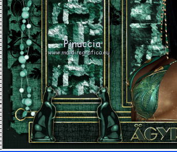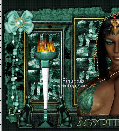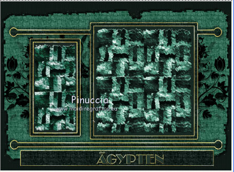qui puoi trovare qualche risposta ai tuoi dubbi. Se l'argomento che ti interessa non è presente, ti prego di segnalarmelo. Per tradurre questo tutorial ho usato PSP X, ma può essere eseguito anche con le altre versioni di PSP. Questo tutorial è una creazione di ©Bluefay e non può essere copiato su altri siti nè essere offerto per il download. Lo stesso vale per la mia traduzione. Il materiale viene da vari gruppi di condivisione. Il copyright appartiene ai rispettivi autori. Grazie ai creatori dei tubes che mettono a disposizione il loro lavoro in vari gruppi di condivisione. Rispetta il lavoro degli autori, non cambiare il nome del file e non cancellare il watermark. Occorrente: Scrap "Agypten" di Bluefay qui ![]() 1. Imposta il colore di primo piano con un colore verde scuro #1b2823. (se vuoi colorare gli elementi scrap, imposta il colore di primo piano con il tuo colore; sul Viraggio vedi qui). 2. Apri una nuova immagine trasparente 750 x 550 pixels, e riempila con il colore di primo piano.3. Effetti>Effetti di trama>Veneziana: ![]() Ripeti l'Effetto Veneziana, selezionando anche Orizzontale. ![]() 4. Apri l'elemento scrap "Paper 1" e vai a Modifica>Copia. Torna al tuo lavoro e vai a Modifica>Incolla come nuovo livello. 5. Effetti>Effetti 3D>Sfalsa ombra: ![]() Ripeti l'Effetto Sfalsa ombra, cambiando verticale e orizzontale con -5. ![]() 6. Apri l'elemento scrap "Doodles" e vai a Modifica>Copia. Torna al tuo lavoro e vai a Modifica>Incolla come nuovo livello. 7. Apri l'elemento scrap "Rahmen" e vai a Modifica>Copia. Torna al tuo lavoro e vai a Modifica>Incolla come nuovo livello. 8. Attiva lo strumento Bacchetta magica ![]() e clicca nella cornice a sinistra per selezionarla. ![]() 9. Livelli>Nuovo livello raster. Livelli>Disponi>Sposta giù. 10. Apri l'elemento scrap "Paper 3" e vai a Modifica>Copia. Torna al tuo lavoro e vai a Modifica>Incolla nella selezione. Selezione>Deseleziona. 11. Attiva il livello superiore. 12. Livelli>Unisci>Unisci giù. 13. Clicca con la bacchetta magica nella cornice destra per selezionarla.14. Livelli>Nuovo livello raster. Livelli>Disponi>Sposta giù. 15. Apri l'elemento scrap "Paper 2" e vai a Modifica>Copia. Torna al tuo lavoro e vai a Modifica>Incolla nella selezione. Selezione>Deseleziona. 16. Attiva il livello superiore. Livelli>Unisci>Unisci giù. 17. Effetti>Effetti 3D>Sfalsa ombra: ![]() Ripeti l'Effetto Sfalsa ombra, cambiando verticale e orizzontale con -5. ![]() 18. Apri l'elemento scrap "Agypten ribbon" e vai a Modifica>Copia. Torna al tuo lavoro e vai a Modifica>Incolla come nuovo livello. Spostalo in basso.![]() 19. Effetti>Effetti 3D>Sfalsa ombra. ![]() Ripeti l'Effetto Sfalsa ombra, cambiando verticale e orizzontale con -5. ![]() 20. Apri il poser "Agypten queen" e vai a Modifica>Copia. Torna al tuo lavoro e vai a Modifica>Incolla come nuovo livello. Sposta il tube a destra.![]() 21. Livelli>Disponi>Sposta giù. 22. Attiva nuovamente il livello superiore. 23. Apri l'elemento scrap "Pearl" e vai a Modifica>Copia. Torna al tuo lavoro e vai a Modifica>Incolla come nuovo livello. Spostalo a sinistra.![]() 24. Apri l'elemento scrap "Bow" e vai a Modifica>Copia. Torna al tuo lavoro e vai a Modifica>Incolla come nuovo livello. Spostalo a sinistra, sopra le perle.![]() 25. Livelli>Unisci>Unisci giù. 26. Effetti>Effetti 3D>Sfalsa ombra: ![]() Ripeti l'Effetto Sfalsa ombra, cambiando verticale e orizzontale con -5. ![]() 27. Livelli>Duplica. Immagine>Rifletti. 28. Apri l'elemento scrap "Agypten cats" e vai a Modifica>Copia. Torna al tuo lavoro e vai a Modifica>Incolla come nuovo livello. Spostalo in basso a sinistra.![]() 29. Apri l'elemento scrap "Agypten brazien" e vai a Modifica>Copia. Torna al tuo lavoro e vai a Modifica>Incolla come nuovo livello. Spostalo in basso tra i gatti.![]() 30. Effetti>Effetti 3D>Sfalsa ombra: ![]() Ripeti l'Effetto Sfalsa ombra, cambiando verticale e orizzontale con -5. 31. Apri l'elemento scrap "Scorpion" e vai a Modifica>Copia. Torna al tuo lavoro e vai a Modifica>Incolla come nuovo livello. Spostalo a sinistra, sopra il tube precedente.![]() 32. Effetti>Effetti 3D>Sfalsa ombra: ![]() Ripeti l'Effetto Sfalsa ombra, cambiando verticale e orizzontale con -5. 33. Apri l'elemento scrap "Agypten urn" e vai a Modifica>Copia. Torna al tuo lavoro e vai a Modifica>Incolla come nuovo livello. Spostalo in basso a destra.![]() 34. Apri l'elemento scrap "date palm" e vai a Modifica>Copia. Torna al tuo lavoro e vai a Modifica>Incolla come nuovo livello. Spostalo in basso a destra, sull'urna.![]() 35. Aggiungi il tuo nome e/o il tuo watermark su un nuovo livello. 36. Livelli>Nuovo livello raster. Riempi il livello con il colore di primo piano.37. Selezione>Seleziona tutto. Selezione>Modifica>Contrai - 2 pixels. Premi sulla tastiera il tasto CANC. Selezione>Deseleziona. 38. Effetti>Effetti di bordo>Aumenta. Livelli>Unisci>Unisci tutto e salva in formato jpg. ![]() Se hai problemi o dubbi, o trovi un link non funzionante, o anche soltanto per un saluto, scrivimi 28 Agosto 2010 |