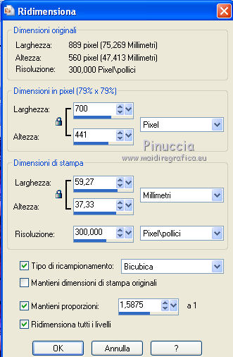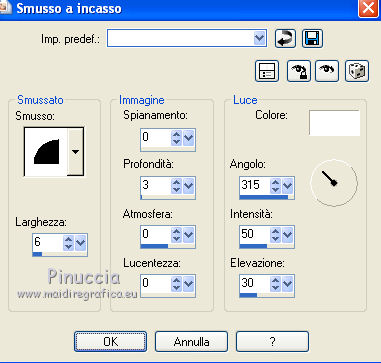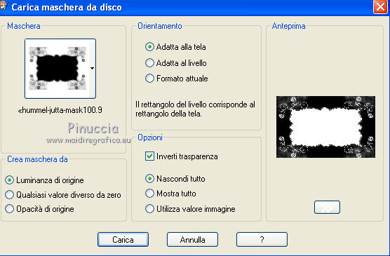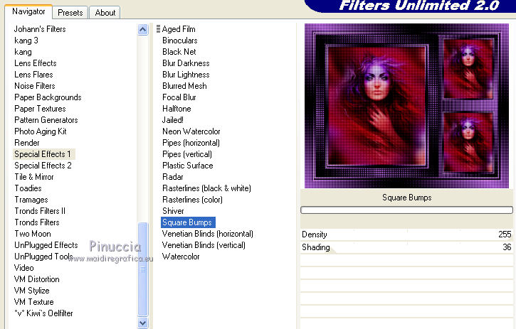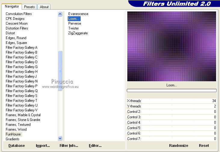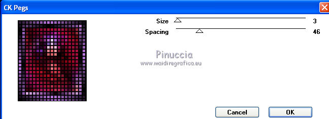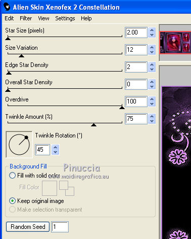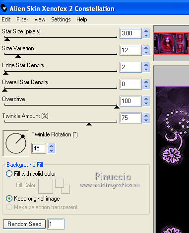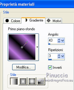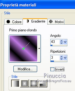 qui puoi trovare qualche risposta ai tuoi dubbi. Se l'argomento che ti interessa non è presente, ti prego di segnalarmelo. Per tradurre questo tutorial ho usato PSP X, ma può essere eseguito anche con le altre versioni di PSP. Questo tutorial è una creazione di ©Bluefay e non può essere copiato su altri siti nè essere offerto per il download. Lo stesso vale per la mia traduzione. Il materiale viene da vari gruppi di condivisione. Il copyright appartiene ai rispettivi autori. Grazie ai creatori dei tubes che mettono a disposizione il loro lavoro in vari gruppi di condivisione. Rispetta il lavoro degli autori, non cambiare il nome del file e non cancellare il watermark. Occorrente: Materiale qui Filtri: FM Tile Tools - Blend Emboss qui Filters Unlimited 2.0 qui Funhouse - Loom qui CPK Design qui Alien Skin Xenofex 2.0 - Constellation qui Ti servirà anche Animation Shop qui ![]() Metti la maschera nella cartella maschere, e apri la tua immagine. Immagine>Ridimensiona, a 400 pixels di altezza. L'immagine fornita con il materiale ha già le corrette dimensioni 2. Scegli un bel colore dalla tua immagine, e impostalo come colore di primo piano (il mio #be78e2). Imposta il colore di sfondo con il nero. 3. Passa il colore di primo piano a Gradiente. ![]() 4. Livelli>Nuovo livello raster. Riempi il livello con il gradiente.5. Selezione>Seleziona tutto. Selezione>Modifica>Contrai - 5 pixels. Premi sulla tastiera il tasto CANC. 6. Selezione>Inverti. Effetti>Effetti 3D>Smusso a incasso. ![]() 7. Effetti>Effetti di bordo>Aumenta. Selezione>Deseleziona. 8. Immagine>Aggiungi bordatura, 2 pixels, simmetriche, con il colore nero. 9. Immagine>Aggiungi bordatura, 5 pixels, simmetriche, con il colore bianco. 10. Seleziona il bordo bianco con la bacchetta magica ![]() 11. Livelli>Nuovo livello raster. Riempi la selezione con il gradiente.12. Effetti>Effetti 3D>Smusso a incasso, con i settaggi precedenti. ![]() 13. Effetti>Effetti di bordo>Aumenta. Selezione>Deseleziona. 14. Immagine>Rifletti. Immagine>Capovolgi. 15. Livelli>Unisci>Unisci tutto. Livelli>Innalza livello di sfondo. 16. Modifica>Copia. se vuoi, duplica l'immagine con maiuscola+D, e mettila da parte. Potrebbe servirti in caso dovessi perderla dalla memoria Selezione>Seleziona tutto. 17. Immagine>Aggiungi bordatura, 30 pixels, simmetriche, con il colore bianco. 18. Selezione>Inverti. 19. Cambia i settaggi del gradiente, selezionando Inverti. ![]() Riempi la selezione con il gradiente.20. Effetti>Plugins>CPK Designs - CK Pegs: ![]() 21. Selezione>Deseleziona. Livelli>Innalza livello di sfondo. 22. Immagine>Dimensione tela. Attenzione: se stai usando un'altra immagine, potresti avere una misura differente come larghezza, mentre l'altezza sarà di 474 pixels. In questo caso, imposta la larghezza aggiungendo 200 pixels alla misura della tua immagine. ![]() 23. Livelli>Nuovo livello raster. Livelli>Disponi>Porta sotto. 24. Riempi il livello con il gradiente.25. Livelli>Duplica. Immagine>Capovolgi. Abbassa l'opacità di questo livello al 50%. 26. Livelli>Unisci>Unisci giù. 27. Effetti>Plugins>Filters Unlimited 2.0 - Funhouse - Loom ![]() 28. Effetti>Plugins>FM Tile Tools - Blend Emboss, con i settaggi standard. ![]() 29. Attiva il livello superiore. 30. Effetti>Effetti 3D>Sfalsa ombra, con il colore nero. ![]() 31. Modifica>Incolla come nuovo livello (dovresti avere ancora in memoria l'immagine copiata al punto 16). 32. Immagine>Ridimensiona, al 50%, tutti i livelli non selezionato. 33. Sposta l'immagine in alto a destra, come nel mio esempio.34. Livelli>Duplica, e sposta questa immagine sotto la precedente.35. Livelli>Unisci>Unisci visibile. Selezione>Seleziona tutto. 36. Immagine>Aggiungi bordatura, 5 pixels, simmetriche, con il colore bianco. 37. Selezione>Inverti. 38. Riempi la selezione con il gradiente.39. Effetti>Effetti 3D>Smusso a incasso, con i settaggi precedenti. ![]() 40. Effetti>Effetti di bordo>Aumenta. Selezione>Deseleziona. 41. Immagine>Aggiungi bordatura, 2 pixels, simmetriche, con il colore nero. 42. Immagine>Aggiungi bordatura, 5 pixels, simmetriche, con il colore bianco. 43. Seleziona questo bordo con la bacchetta magica ![]() 44. Livelli>Nuovo livello raster. Cambia ancora i settaggi del gradiente, togliendo la selezione a Inverti. ![]() Riempi la selezione con il gradiente.45. Effetti>Effetti 3D>Smusso a incasso, con i settaggi precedenti. ![]() 46. Effetti>Effetti di bordo>Aumenta. Selezione>Deseleziona. 47. Immagine>Rifletti. Immagine>Capovolgi. Livelli>Unisci>Unisci visibile. 48. Selezione>Seleziona tutto. 49. Immagine>Aggiungi bordatura, 25 pixels, simmetriche, con il colore nero. 50. Selezione>Inverti. Cambia nuovamente i settaggi del gradiente, mettendo la spunta a Inverti. ![]() Riempi la selezione con il gradiente.51. Effetti>Plugins>Filters Unlimited 2.0 - Special Effects 1 - Square bumps. ![]() 52. Selezione>Deseleziona. 53. Immagine>Aggiungi bordatura, 2 pixels, simmetriche, con il colore nero. 54. Immagine>Aggiungi bordatura, 2 pixels, simmetriche, con il colore di primo piano. 55. Immagine>Aggiungi bordatura, 2 pixels, simmetriche, con il colore nero. 56. Livelli>Innalza livello di sfondo. 57. Immagine>Dimensione tela. Attenzione, vale lo stesso discorso per il precedente ridimensionamento. Calcola un aumento di 200 pixels sulla larghezza della tua immagine. ![]() 58. Livelli>Nuovo livello raster. Livelli>Disponi>Porta sotto. 59. Riempi il livello con il colore nero.60. Livelli>Nuovo livello raster. Riempi il livello coni l colore di primo piano.61. Livelli>Carica/Salva maschera>Carica maschera da disco. Cerca e carica la maschera «hummel-jutta-mask100.9: ![]() 62. Livelli>Unisci>Unisci gruppo. Livelli>Duplica. Livelli>Unisci>Unisci giù. 63. Effetti>Effetti di bordo>Aumenta. Effetti>Effetti 3D>Sfalsa ombra, con il colore nero. ![]() 64. Attiva il livello superiore. 65. Selezione>Seleziona tutto. Selezione>Mobile. Selezione>Immobilizza. Attiva il livello centrale della maschera. Premi sulla tastiera il tasto C