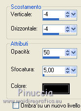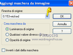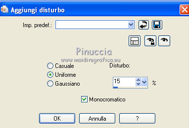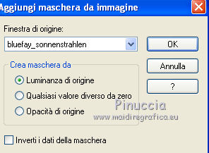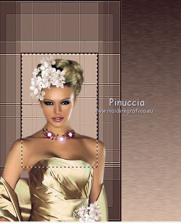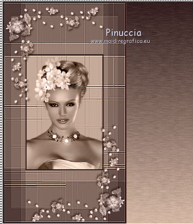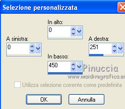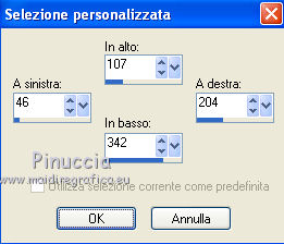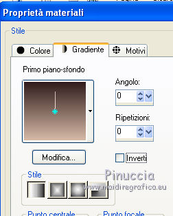qui puoi trovare qualche risposta ai tuoi dubbi. Se l'argomento che ti interessa non è presente, ti prego di segnalarmelo. Per tradurre questo tutorial ho usato PSP X, ma può essere eseguito anche con le altre versioni di PSP. Questo tutorial è una creazione di ©Bluefay e non può essere copiato su altri siti nè essere offerto per il download. Lo stesso vale per la mia traduzione. Il materiale viene da vari gruppi di condivisione. Il copyright appartiene ai rispettivi autori. Grazie ai creatori dei tubes che mettono a disposizione il loro lavoro in vari gruppi di condivisione. Rispetta il lavoro degli autori, non cambiare il nome del file e non cancellare il watermark. Occorrente: Materiale qui Filtri: Filter Factory Gallery N qui I filtri Factory Gallery per essere usati devono prima essere convertiti. Come fare vedi qui Si usano importandoli in Filters Unlimited (come fare vedi qui) ma possono funzionare anche da soli Ti servirà anche Animation Shop qui ![]() Apri tutto il materiale in PSP, comprese le maschere. 1. Scegli due colori dal tube Lady Elegance U17_tube_Colombe. 2. Imposta il colore di primo piano con il colore chiaro (il mio #d6b9a6), e il colore di sfondo con il colore scuro (il mio #311d1d). 3. Passa il colore di primo piano a Gradiente. ![]() 4. Apri una nuova immagine trasparente 600 x 450 pixels, e riempila con il gradiente.5. Effetti>Plugins>Filters Unlimited - Filter Factory Gallery N - Wee Scratches. ![]() 6. Attiva lo strumento Selezione ,clicca sull'icona Selezione personalizzata ![]() e imposta i seguenti settaggi: ![]() 7. Livelli>Nuovo livello raster. Riempi la selezione con il colore scuro di sfondo (tasto destro del mouse).8. Selezione>Modifica>Contrai - 3 pixels. Mantieni selezionato. 9. Apri la maschera 0.153 wicked e minimizzala nella tua area di lavoro. 10. Apri una nuova immagine trasparente 251x450 pixels, e riempila con il colore chiaro di primo piano.11. Livelli>Nuovo livello maschera>Da immagine. Apri il menu sotto la finestra di origine e vedrai la lista dei files aperti. Tra questi la maschera. Seleziona la maschera 0.153wicked con i seguenti settaggi: ![]() 12. Livelli>unisci>Unisci gruppo. Modifica>Copia. 13. Torna al tuo lavoro e vai a Modifica>Incolla nella selezione. Selezione>Deseleziona. 14. Effetti>Effetti di bordo>Aumenta. 15. Selezione personalizzata ![]() ![]() 16. Livelli>Nuovo livello raster. Riempi la selezione con il colore scuro di sfondo.17. Selezione>Modifica>Contrai - 2 pixels. Premi sulla tastiera il tatso CANC. Mantieni selezionato. 18. Livelli>Unisci>Unisci giù. 19. Apri il tube "Lady elegance U17_tube_Colombe" e vai a Modifica>Copia. minimizza il tube, perchè ti servirà ancora 20. Torna al tuo lavoro e vai a Modifica>Incolla come nuovo livello. Posiziona il tube nell'area selezionata.![]() 21. Selezione>Inverti. Premi sulla tastiera il tasto CANC. Selezione>Deseleziona. 22. Cambia la modalità di miscelatura di questo livello in Luminanza (esistente). Livelli>Unisci>Unisci giù. 23. Apri il tube "beads morning glories bam" e vai a Modifica>Copia. 24. Torna al tuo lavoro e vai a Modifica>Incolla come nuovo livello. Sposta il tube in alto a sinistra, come nel mio esempio.25. Effetti>Effetti 3D>Sfalsa ombra, con il colore nero. ![]() 26. Cambia la modalità di miscelatura di questo livello in Luminanza (esistente). 27. Livelli>Duplica. Immagine>Rifletti. Immagine>Capovolgi. Sposta questo tube in basso a destra del riquadro.![]() 28. Livelli>Unisci>Unisci giù. Ripeti Livelli>Unisci>Unisci giù. 29. Effetti>Effetti 3D>sfalsa ombra, con il colore nero. ![]() 30. Immagine>Aggiungi bordatura, 2 pixels, simmetriche, con il colore bianco. Seleziona questo bordo con la bacchetta magica ![]() e riempilo con il colore chiaro di primo piano.Selezione>Deseleziona. 31. Immagine>Aggiungi bordatura, 2 pixels, simmetriche, con il colore nero. Seleziona questo bordo con la bacchetta magica ![]() e riempilo con il colore scuro di sfondo.Selezione>Deseleziona. 32. Immagine>Aggiungi bordatura, 2 pixels, simmetriche, con il colore bianco. Seleziona questo bordo con la bacchetta magica ![]() e riempilo con il colore chiaro di primo piano.33. Selezione>Seleziona tutto. Selezione>modifica>Contrai - 6 pixels. Selezione>Inverti. 34. Effetti>Effetti 3D>Smusso a incasso. ![]() 35. Selezione>Inverti. Livelli>Nuovo livello raster. Riempi la selezione con il colore scuro di sfondo.Selezione>Deseleziona. 36. Livelli>Nuovo livello maschera>Da immagine. Apri il menu sotto la finestra di origine e seleziona la maschera bluefay_sonnenstrahlen, con i seguenti settaggi. ![]() 37. Attiva lo strumento Bacchetta magica (tolleranza tra 15 e 20)e seleziona i raggi della maschera. Mantieni selezionato. 38. Livelli>Unisci>Unisci gruppo. 39. Effetti>Effetti 3D>Smusso a incasso. ![]() 40. Effetti>Effetti 3D>Sfalsa ombra, con il colore nero. ![]() 41. Selezione>Deseleziona. 42. Attiva nuovamente il tube Lady Elegance U17_tube_colombe e vai a Modifica>copia. 43. Torna al tuo lavoro e vai a Modifica>Incolla come nuovo livello. Immagine>Rifletti. Immagine>Ridimensiona, all'85%, tutti i livelli non selezionato. ![]() 44. Sposta il tube a destra, come nel mio esempio.45. Effetti>Effetti 3D>Sfalsa ombra, con il colore nero. ![]() 46. Aggiungi il tuo nome e/o il tuo watermark su un nuovo livello. 47. Attiva il livello della maschera con i raggi. 48. Regola>Aggiungi/Rimuovi disturbo>Aggiungi disturbo. ![]() 49. Modifica>Copia Unione. Se stai usando PSP X2: Modifica>Copia Speciale>Copia Unione 50. Apri Animation Shop e vai a Modifica>Incolla>Incolla come nuova animazione. 51. Torna in PSP. Modifica>Annulla azione Aggiungi disturbo. 52. Regola>Aggiungi/Rimuovi disturbo>Aggiungi disturbo, e porta il disturbo a 20. 53. Modifica>Copia Unione. Torna in Animation Shop e vai a Modifica>Incolla>Incolla dopo il fotogramma corrente. Modifica>Seleziona tutto. Animazione>Proprietà fotogramma e imposta la velocità a 8. ![]() Controlla il risultato cliccando su Visualizza e salva in for