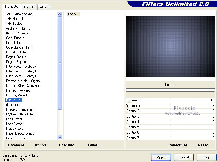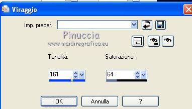 qui puoi trovare qualche risposta ai tuoi dubbi. Se l'argomento che ti interessa non è presente, ti prego di segnalarmelo. Per tradurre questo tutorial ho usato PSP X, ma può essere eseguito anche con le altre versioni di PSP. Questo tutorial è una creazione di ©Bluefay e non può essere copiato su altri siti nè essere offerto per il download. Lo stesso vale per la mia traduzione. Il materiale viene da vari gruppi di condivisione. Il copyright appartiene ai rispettivi autori. Grazie ai creatori dei tubes che mettono a disposizione il loro lavoro in vari gruppi di condivisione. Rispetta il lavoro degli autori, non cambiare il nome del file e non cancellare il watermark. Occorrente: Materiale qui Filtri: Filters Unlimited 2.0 qui Funhouse - Loom qui Ti servirà anche Animation Shop qui ![]() Apri tutto il materiale in PSP, comprese le maschere. 1. Scegli due colori dal tube Love IB33-tube-colombe. 2. Imposta il colore di primo piano con il colore chiaro (il mio #8993b8), e il colore di sfondo con il colore scuro (il mio #010102). 3. Passa il colore di primo piano a Gradiente. ![]() 4. Apri una nuova immagine trasparente 650 x 450 pixels, e riempila con il gradiente.5. Effetti>Plugins>Filters Unlimited - Funhouse - Loom. ![]() 6. Effetti>Effetti di bordo>Aumenta. 7. Apri il tube "bluefay blue balken" e vai a Modifica>Copia. 8. Torna al tuo lavoro e vai a Modifica>Incolla come nuovo livello. 9. Apri il tube "love IB33 tube Colombe" e vai a Modifica>Copia. 10. Torna al tuo lavoro e vai a Modifica>Incolla come nuovo livello. 11. Effetti>Effetti 3D>sfalsa ombra, con il colore nero. ![]() Ripeti l'Effetto Sfalsa ombra, con il colore nero e i seguenti settaggi. ![]() 12. Apri il tube "Amomentsooner" e vai a Modifica>copia. 13. Torna al tuo lavoro e vai a Modifica>Incolla come nuovo livello. Sposta il tube a destra, come nel mio esempio.14. Effetti>Effetti 3D>Sfalsa ombra, con il colore nero. ![]() 15. Regola>Tonalità e saturazione>Viraggio, con i valori corrispondenti al tuo colore chiaro di primo piano. ![]() 16. Livelli>Unisci>Unisci giù. 17. Livelli>Nuovo livello raster. Selezione>Seleziona tutto. Riempi con il colore bianco.18. Selezione>Modifica>Contrai - 1 pixel. Premi sulla tastiera il tasto CANC. 19. Selezione>Deseleziona. 20. Livelli>Unisci>Unisci giù. 21. Apri il tube "bluefay bluelinien" e vai a Modifica>copia. 22. Torna al tuo lavoro e vai a Modifica>Incolla come nuovo livello. 23. Livelli>Disponi>Sposta giù. 24. Aggiungi il tuo nome e/o il tuo watermark su un nuovo livello. 24. Attiva il livello del tube "bluefay bluelinien". Regola>Aggiungi/Rimuovi disturbo>Aggiungi disturbo. ![]() 25. Modifica>Copia Unione. Se stai usando PSP X2: Modifica>Copia Speciale>Copia Unione 26. Apri Animation Shop e vai a Modifica>Incolla>Incolla come nuova animazione. 27. Torna in PSP. Modifica>Annulla azione Aggiungi disturbo. 28. Regola>Aggiungi/Rimuovi disturbo>Aggiungi disturbo, e porta il disturbo a 30. 53. Modifica>Copia Unione. Torna in Animation Shop e vai a Modifica>Incolla>Incolla dopo il fotogramma corrente. Modifica>Seleziona tutto. Animazione>Proprietà fotogramma e imposta la velocità a 8. ![]() Controlla il risultato cliccando su Visualizza e salva in formato gif.![]() Se hai problemi o dubbi, o trovi un link non funzionante, o anche soltanto per un saluto, scrivimi 19 Luglio 2010 |