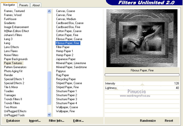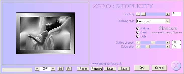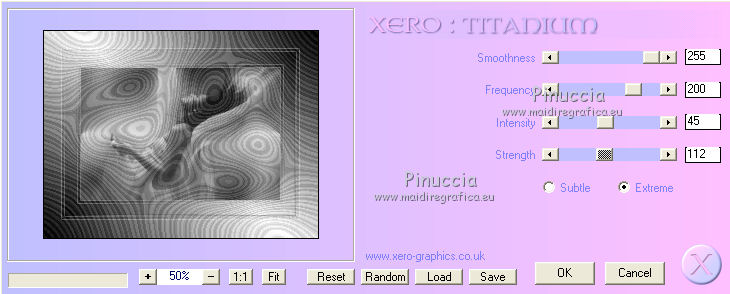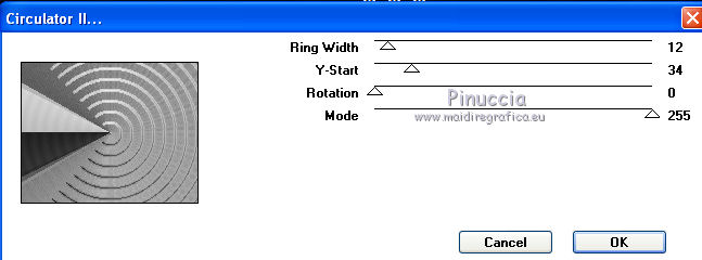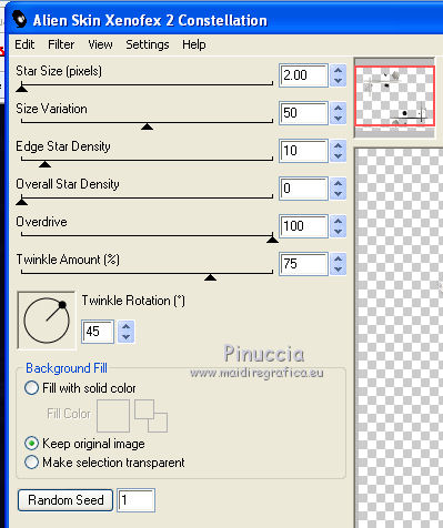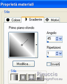 qui puoi trovare qualche risposta ai tuoi dubbi. Se l'argomento che ti interessa non è presente, ti prego di segnalarmelo. Per tradurre questo tutorial ho usato PSP X, ma può essere eseguito anche con le altre versioni di PSP. Questo tutorial è una creazione di ©Bluefay e non può essere copiato su altri siti nè essere offerto per il download. Lo stesso vale per la mia traduzione. Il materiale viene da vari gruppi di condivisione. Il copyright appartiene ai rispettivi autori. Grazie ai creatori dei tubes che mettono a disposizione il loro lavoro in vari gruppi di condivisione. Rispetta il lavoro degli autori, non cambiare il nome del file e non cancellare il watermark. Occorrente: Materiale qui Filtri: Xero - Simplicity e Titaniumqui VM Distortion qui Filters Unlimited 2.0 qui Alien Skin Xenofex 2.0 - Constellation qui Ti servirà anche Animation Shop qui ![]() Apri la tua immagine. Immagine>Ridimensiona, a 400 pixels di larghezza. L'immagine fornita con il materiale ha già le corrette dimensioni 2. Regola>Tonalità e saturazione>Viraggio: ![]() 3. Imposta il colore di primo piano con il nero, e il colore di sfondo con il bianco. 4. Passa il colore di primo piano a Gradiente. ![]() 5. Immagine>Aggiungi bordatura, 1 pixel, simmetriche, con il colore bianco. 6. Immagine>Aggiungi bordatura, 5 pixels, simmetriche, con il colore nero. 7. Seleziona il bordo nero con la bacchetta magica .8. Riempi la selezione con il gradiente.9. Regola>Aggiungi/Rimuovi disturbo>Aggiungi disturbo. ![]() 10. Effetti>Effetti di bordo>Aumenta. Selezione>Deseleziona. 11.Immagine>Aggiungi bordatura, 1 pixel, simmetriche, con il colore bianco. 12. Immagine>Aggiungi bordatura, 25 pixels, simmetriche, con il colore nero. 13. Seleziona questo bordo con la bacchetta magica .14. Riempi la selezione con il gradiente.15. Effetti>Plugins>Xero - Simplicity: ![]() 16. Effetti>Effetti di bordo>Aumenta. Selezione>Deseleziona. 17. Immagine>Aggiungi bordatura, 1 pixel, simmetriche, con il colore bianco. 18. Immagine>Aggiungi bordatura, 5 pixels, simmetriche, con il colore nero. 19. Seleziona il bordo nero con la bacchetta magica .20. Riempi la selezione con il gradiente.21. Regola>Aggiungi/Rimuovi disturbo>Aggiungi disturbo. ![]() 22. Effetti>Effetti di bordo>Aumenta. Selezione>Deseleziona. 23. Immagine>Aggiungi bordatura, 1 pixel, simmetriche, con il colore bianco. 24. Immagine>Aggiungi bordatura, 35 pixels, simmetriche, con il colore nero. 25. Seleziona il bordo nero con la bacchetta magica .26. Riempi la selezione con il gradiente.27. Effetti>Plugins>Xero - Titanium: ![]() 28. Modifica>Copia. Livelli>Nuovo livello raster. Modifica>Incolla nella selezione. Selezione>Deseleziona. 29. Immagine>Rifletti. Abbassa l'opacità di questo livello al 60%. 30. Regola>Messa a fuoco>Metti a fuoco. Livelli>Unisci>Unisci tutto. 31. Immagine>Aggiungi bordatura, 1 pixel, simmetriche, con il colore bianco. 32. Immagine>Aggiungi bordatura, 50 pixels, simmetriche, con il colore nero. 33. Seleziona il bordo nero con la bacchetta magica .34. Riempi la selezione con il gradiente.35. Effetti>Plugins>VM Distortion - Circulator II. ![]() 36. Modifica>Copia. Livelli>Nuovo livello raster. Modifica>Incolla nella selezione. Selezione>Deseleziona. 37. Immagine>Rifletti. Abbassa l'opacità di questo livello al 50%. 38. Regola>Messa a fuoco>Metti a fuoco. Livelli>Unisci>Unisci tutto. 39. Immagine>Aggiungi bordatura, 1 pixel, simmetriche, con il colore bianco. 40. Immagine>Aggiungi bordatura, 5 pixels, simmetriche, con il colore nero. 41. Seleziona il bordo nero con la bacchetta magica .42. Riempi la selezione con il gradiente.43. Regola>Aggiungi/Rimuovi disturbo>Aggiungi disturbo. ![]() 44. Effetti>Effetti di bordo>Aumenta. Selezione>Deseleziona. 45. Immagine>Aggiungi bordatura, 1 pixel, simmetriche, con il colore bianco. 46. Immagine>Aggiungi bordatura, 36 pixels, simmetriche, con il colore nero. 47. Seleziona il bordo nero con la bacchetta magica .48. Riempi la selezione con il gradiente.49. Effetti>Plugins>Filters Unlimited 2.0 - Paper Textures - Fibrous Paper,Fine. ![]() 50. Selezione>Inverti. Effetti>Effetti 3D>Sfalsa ombra, con il colore nero. ![]() 51. Regola>Messa a fuoco>Metti a fuoco. Selezione>Modifica>Contrai - 56 pixels. 52. Effetti>Effetti 3D>Sfalsa ombra, con i settaggi precedenti. ![]() 53. Selezione>Deseleziona. 54. Immagine>Ridimensiona, a 700 pixels di larghezza, tutti i livelli selezionato. 55. Aggiungi il tuo nome e/o il tuo watermark su un nuovo livello. 56. Livelli>unisci>Unisci tutto. 57. Apri il tube deco e vai a Modifica>copia. Torna al tuo lavoro e vai a Modifica>Incolla come nuovo livello. Spostalo nell'angolo in alto a sinistra della cornice interna - vedi il mio esempio.58. Effetti>Effetti 3D>Sfalsa ombra, con il colore nero. ![]() Ripeti l'Effetto Sfalsa ombra, cambiando verticale e orizzontale con -2. 59. Livelli>Duplica. Immagine>Rifletti. Immagine>Capovolgi. 60. Livelli>Unisci>Unisci giù. 61. Effetti>Plugins>Alien Skin Xenofex 2.0 - Constellation. ![]() Modifica>Copia Unione. 62. Apri Animation Shop e vai a Modifica>Incolla>Incolla come nuova animazione. 63. Torna in PSP. Modifica>Annulla azione Constellation. 64. Ripeti l'Effetto Constellation cambiando soltanto Star Size con 3,00. ![]() Modifica>Copia Unione. 65. Torna in Animation Shop e vai a Modifica>Incolla>Incolla dopo il fotogramma corrente. 66. Controlla il risultato cliccando su Visualizza e salva in formato gif.Variante di colore. ![]() I tubes usati per questi esempi sono di Nettis e Joyce. ![]() ![]() ![]() Se hai problemi o dubbi, o trovi un link non funzionante, o anche soltanto per un saluto, scrivimi 4 Luglio 2010 |