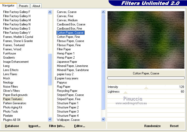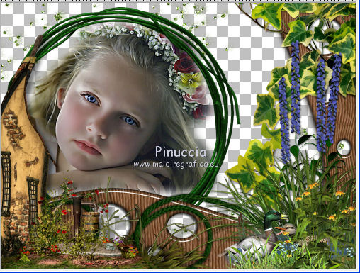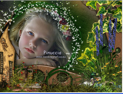 qui puoi trovare qualche risposta ai tuoi dubbi. Se l'argomento che ti interessa non è presente, ti prego di segnalarmelo. Per tradurre questo tutorial ho usato PSP X, ma può essere eseguito anche con le altre versioni di PSP. Questo tutorial è una creazione di ©Bluefay e non può essere copiato su altri siti nè essere offerto per il download. Lo stesso vale per la mia traduzione. Il materiale viene da vari gruppi di condivisione. Il copyright appartiene ai rispettivi autori. Grazie ai creatori dei tubes che mettono a disposizione il loro lavoro in vari gruppi di condivisione. Rispetta il lavoro degli autori, non cambiare il nome del file e non cancellare il watermark. Occorrente: Materiale qui Filtri: Filters Unlimited 2.0 qui ![]() 1. Apri "BluefayTubes WonderlandRahmen", che sarà la base del tuo lavoro. 2. Apri "BluefayTubes Glitter" e vai a Modifica>Copia. Torna al tuo lavoro e vai a Modifica>Incolla come nuovo livello. 3. Livelli>Disponi>Sposta giù. 4. Apri il tube "LittleGirl3" e vai a Modifica>Copia. Torna al tuo lavoro e vai a Modifica>Incolla come nuovo livello. 5. Spostalo un po' più a sinistra nell'area della cornice, come nel mio esempio.![]() 6. Attiva il livello superiore con la cornice. 7. Apri il tube "Efeu" e vai a Modifica>Copia. Torna al tuo lavoro e vai a Modifica>Incolla come nuovo livello. Sposta questo tube in alto a destra.![]() 8. Effetti>Effetti 3D>Sfalsa ombra, con il colore nero. ![]() 9. Apri il tube "Botanicals1" e vai a Modifica>Copia. Torna al tuo lavoro e vai a Modifica>Incolla come nuovo livello. Sposta questo tube in basso a destra.![]() 10. Effetti>Effetti 3D>Sfalsa ombra, con il colore nero. ![]() 11. Apri il tube "Botanicals2" e vai a Modifica>Copia. Torna al tuo lavoro e vai a Modifica>Incolla come nuovo livello. Sposta anche questo tube in basso a destra.![]() 12. Effetti>Effetti 3D>Sfalsa ombra, con il colore nero. ![]() 13. Apri il tube "Flowers and the birds-1-2" e vai a Modifica>Copia. Torna al tuo lavoro e vai a Modifica>Incolla come nuovo livello. Sposta il tube in basso a destra.![]() 14. Effetti>Effetti 3D>Sfalsa ombra, con il colore nero. ![]() 15. Apri il tube "grass-9" e vai a Modifica>Copia. Torna al tuo lavoro e vai a Modifica>Incolla come nuovo livello. Sposta questo tube in basso, come nell'esempio.![]() 16. Effetti>Effetti 3D>Sfalsa ombra, con il colore nero. ![]() 17. Livelli>Unisci>Unisci visibile. 18. Ripeti l'Effetto Sfalsa ombra con gli stessi settaggi. ![]() 19. Livelli>Duplica. 20. Scegli un colore non troppo chiaro dalla tua immagine, e impostalo come colore di primo piano; il mio #12340e. 21. Livelli>Nuovo livello raster. Riempi il livello con il colore di primo piano.Livelli>Disponi>Porta sotto. 22. Attiva il secondo livello dal basso. 23. Livelli>Unisci>Unisci giù. 24. Effetti>Effetti di immagine>Motivo unico. ![]() 25. Regola>Sfocatura>Sfocatura gaussiana - raggio 45. ![]() 26. Effetti>Plugins>Filters Unlimited 2.0 - Paper Textures - Cotton Paper,Fine. ![]() 27. Attiva il livello superiore. 28. Apri "BluefayTubes Fairy Dust" e vai a Modifica>Copia. Torna al tuo lavoro e vai a Modifica>Incolla come nuovo livello. Spostalo a sinistra, come nel mio esempio.![]() 29. Cambia la modalità di miscelatura di questo livello in Indebolisci. 30. Livelli>Unisci>Unisci visibile. 31. Selezione>Seleziona tutto. Selezione>Modifica>Contrai - 10 pixels. Selezione>Inverti. 32. Regola>Sfocatura>Sfocatura gaussiana - raggio 25. ![]() 33. Effetti>Effetti 3D>Sfalsa ombra, con il colore nero. ![]() Ripeti l'Effetto Sfalsa ombra, cambiando verticale e orizzontale con -5. 34. Selezione>Deseleziona. 35. Regola>Tonalità e saturazione>Tonalità/Saturazione/Luminosità. ![]() 36. Aggiungi il tuo nome e/o il tuo watermark su un nuovo livello. 37. Livelli>Unisci>Unisci tutto e salva in formato jpg.