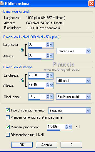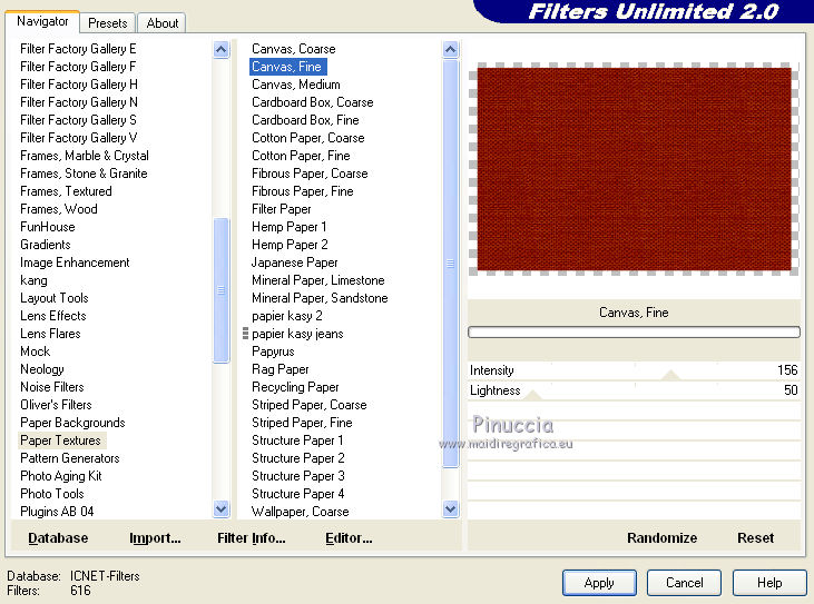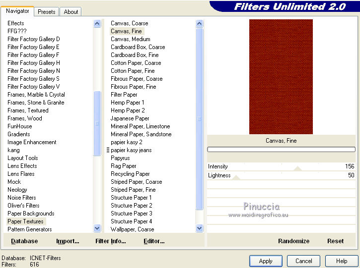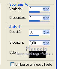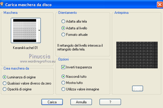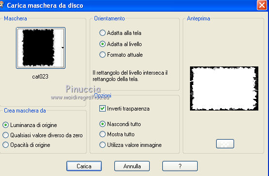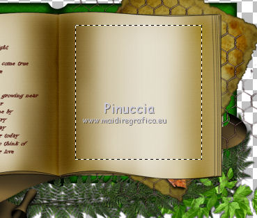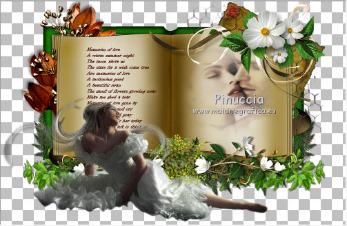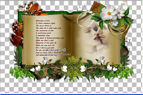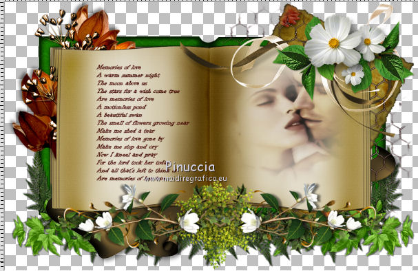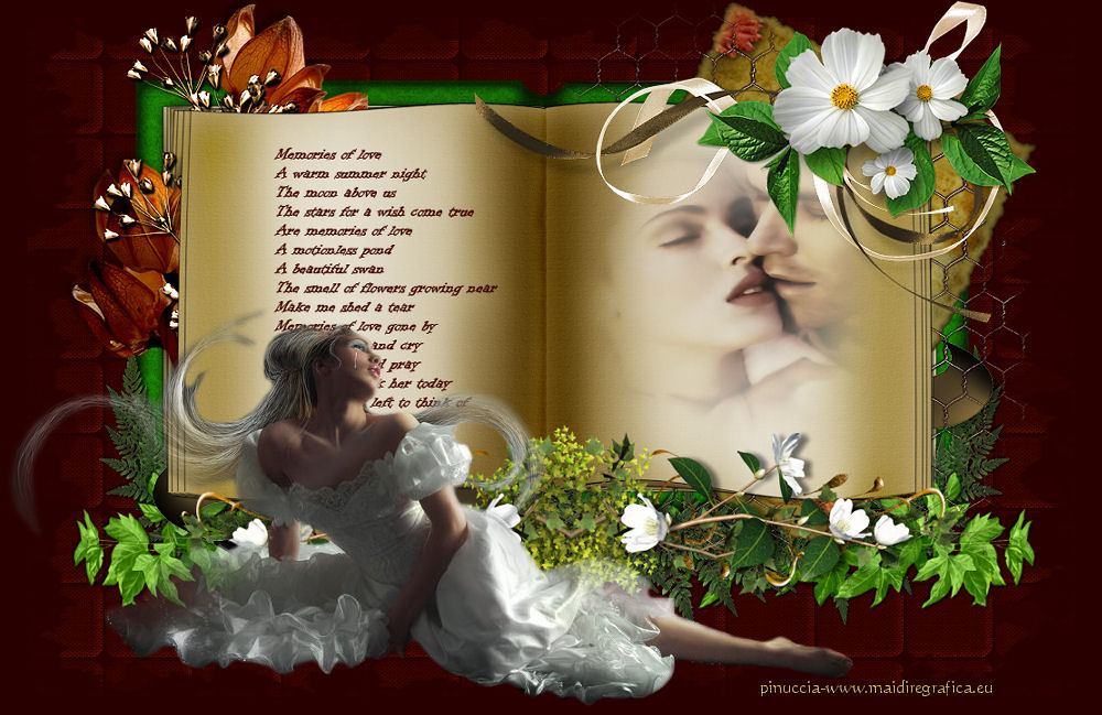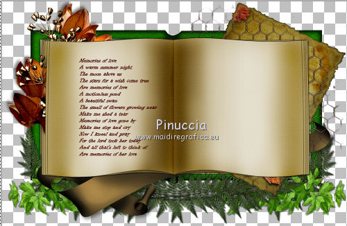 qui puoi trovare qualche risposta ai tuoi dubbi. Se l'argomento che ti interessa non è presente, ti prego di segnalarmelo. Per tradurre questo tutorial ho usato PSP X, ma può essere eseguito anche con le altre versioni di PSP. Questo tutorial è una creazione di ©Bluefay e non può essere copiato su altri siti nè essere offerto per il download. Lo stesso vale per la mia traduzione. Il materiale viene da vari gruppi di condivisione. Il copyright appartiene ai rispettivi autori. Grazie ai creatori dei tubes che mettono a disposizione il loro lavoro in vari gruppi di condivisione. Rispetta il lavoro degli autori, non cambiare il nome del file e non cancellare il watermark. Occorrente: Materiale qui Filtri: In caso di problemi, consulta la mia sezione filtri qui Filters Unlimited 2.0 qui ![]() Metti le maschere cat023 e Keramikkachel01 nella cartella Maschere, e apri il resto del materiale in PSP. 1. Apri il tube "BluefayBuch". Questa sarà la base del tuo lavoro. Attiva il livello "buch". 2. Apri il tube "Memories of love Text" e vai a Modifica>Copia. Torna al tuo lavoro e vai a Modifica>Incolla come nuovo livello. 3. Sposta il testo a sinistra.![]() 4. Attiva lo strumento Selezione , rettangolo,e traccia una selezione sulla pagina destra del libro. ![]() 5. Livelli>Nuovo livello raster. 6. Apri il tube "calguismisted1029" e vai a Modifica>Copia. Torna al tuo lavoro e vai a Modifica>Incolla nella selezione. Selezione>Deseleziona. 7. Attiva il livello inferiore "BuchCover". Colorizza, se vuoi, con i valori corrispondenti a un colore della tua immagine. 8. Livelli>Unisci>Unisci visibile. 9. Apri il tube "Flower" e vai a Modifica>Copia. Torna al tuo lavoro e vai a Modifica>Incolla come nuovo livello. 10. Sposta il tube in alto a destra.![]() 11. Apri il tube "Flower 2" e vai a Modifica>Copia. Torna al tuo lavoro e vai a Modifica>Incolla come nuovo livello. 12. Sposta questo tube in basso.![]() 13. Livelli>Unisci>Unisci visibile. 14. Immagine>Ridimensiona, al 90%, tutti i livelli non selezionato. ![]() 15. Sposta l'immagine un po' più in alto.![]() 16. Apri il tube "f0187©Lea" e vai a Modifica>Copia. Torna al tuo lavoro e vai a Modifica>Incolla come nuovo livello. 17. Sposta questo tube in basso a sinistra.![]() 18. Scegli due colori dalla tua immagine. Imposta il colore di primo piano con il colore chiaro (il mio #9b2700), e il colore di sfondo con il colore scuro (il mio #290000). 19. Livelli>Nuovo livello raster. Riempi con il colore scuro di sfondo.20. Livelli>Disponi>Porta sotto. 21. Livelli>Nuovo livello raster. Riempi con il colore chiaro di primo piano.22. Immagine>Ridimensiona, al 95%, tutti i livelli non selezionato. 23. Effetti>Plugins>Filters Unlimited 2.0 - Paper Texture - Canvas,Fine. ![]() 24. Livelli>Carica/Salva maschera>Carica maschera da disco. Cerca e carica la maschera "keramikkachel01". ![]() Livelli>Unisci>Unisci gruppo. 25. Livelli>Carica/Salva maschera>Carica maschera da disco. Cerca e carica la maschera "cat023". ![]() Livelli>Unisci>Unisci gruppo. 26. Effetti>Effetti 3D>Sfalsa ombra, con il colore nero. ![]() 27. Attiva il livello superiore. 28. Aggiungi il tuo nome e/o il tuo watermark su un nuovo livello. 29. Livelli>Unisci>Unisci tutto ed è pronta l'immagine principale per la tua Lettera. Salva in formato jpg. ![]() Sfondo per la Lettera 1. Apri una nuova immagine trasparente 2000 x 450 pixels, e riempila con il colore scuro di sfondo.2. Livelli>Nuovo livello raster. 3. Attiva lo strumento Selezione ,clicca sull'icona Selezione personalizzata ![]() e imposta i seguenti settaggi. ![]() 4. Riempi la selezione con il colore di primo piano.5. Effetti>Plugins>Filters Unlimited 2.0 - Paper Texture - Canvas,Fine, con i settaggi precedenti. ![]() 6. Livelli>Carica/Salva maschera>Carica maschera da disco. Cerca e carica la maschera "keramikkachel01". ![]() 7. Livelli>Unisci>Unisci gruppo. Selezione>Deseleziona. 8. Effetti>Effetti di immagine>Motivo unico. ![]() 9. Effetti>Effetti 3D>Sfalsa ombra, con il colore nero. ![]() 10. Effetti>Effetti di bordo>Aumenta. 11. Apri il tube "Flower 3" e vai a Modifica>Copia. Torna al tuo lavoro e vai a Modifica>Incolla come nuovo livello. 12. Sposta il tube a sinistra.![]() Livelli>Unisci>Unisci tutto ed è pronto lo sfondo per la tua lettera. Salva in formato jpg. ![]() ho soltanto tradotto questa parte del tutorial. Non uso Incredimail nè Letter creator; per questo non sono in grado di fornire ulteriori spiegazioni. ![]() Se hai problemi o dubbi, o trovi un link non funzionante, o anche soltanto per un saluto, scrivimi 18 Ottobre 2010 |