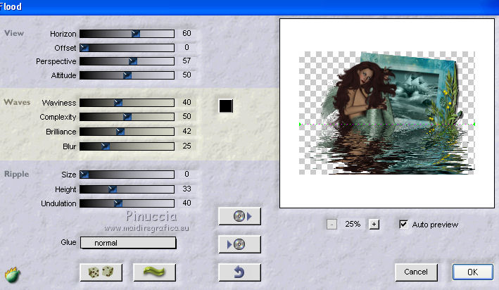 qui puoi trovare qualche risposta ai tuoi dubbi. Se l'argomento che ti interessa non è presente, ti prego di segnalarmelo. Per tradurre questo tutorial ho usato PSP X, ma può essere eseguito anche con le altre versioni di PSP. Questo tutorial è una creazione di ©Bluefay e non può essere copiato su altri siti nè essere offerto per il download. Lo stesso vale per la mia traduzione. Il materiale viene da vari gruppi di condivisione. Il copyright appartiene ai rispettivi autori. Grazie ai creatori dei tubes che mettono a disposizione il loro lavoro in vari gruppi di condivisione. Rispetta il lavoro degli autori, non cambiare il nome del file e non cancellare il watermark. Occorrente: Materiale qui Il copyrigh del minikit RR EK CelestialBliss cluster03 appartiene a http://raspberryroaddesigns.blogspot.com/Raspbeery Road Designs Filtri: In caso di problemi, consulta la mia sezione filtri qui Flaming Pear - Flood qui ![]() Metti la maschera nella cartella Maschere, e apri il resto del materiale in PSP. 1. Apri una nuova immagine trasparente 1000 x 700 pixels, e riempila con il colore bianco.2. Scegli due colori dal tube "RR EK CelestialBliss Cluster03". Imposta il colore di primo piano con il colore chiaro (#adc5be), e il colore di sfondo con il colore scuro (#1e5252). 3. Passa il colore di primo piano a Gradiente. ![]() 4. Attiva lo strumento Selezione ,clicca sull'icona Selezione personalizzata ![]() e imposta i seguenti settaggi: ![]() 5. Livelli>Nuovo livello raster. Riempi la selezione con il gradiente.6. Livelli>Carica/Salva maschera>Carica maschera da disco. Cerca e carica la maschera Fyzebr. ![]() Selezione>Deseleziona. Livelli>Unisci>Unisci gruppo. 7. Apri il tube "RR EK CelestialBliss Cluster03" e vai a Modifica>Copia. Torna al tuo lavoro e vai a Modifica>Incolla come nuovo livello. 8. Attiva lo strumento Selezione a mano libera , da punto a punto,e seleziona la cornice come nell'esempio. ![]() 9. Livelli>Nuovo livello raster. Livelli>Disponi>Sposta giù. Riempi la selezione con il gradiente.Mantieni selezionato. 10. Livelli>Nuovo livello raster. 11. Apri il tube "31mububc" e vai a Modifica>Copia. Torna al tuo lavoro e vai a Modifica>Incolla nella selezione. Selezione>Deseleziona. 12. Apri il tube "9sz9m9e5" e vai a Modifica>Copia. Torna al tuo lavoro e vai a Modifica>Incolla come nuovo livello. 13. Posiziona il tube come nell'esempio.![]() 14. Livelli>Unisci>Unisci giù. 15. Apri il tube "ge9rfxqu" e vai a Modifica>Copia. Torna al tuo lavoro e vai a Modifica>Incolla come nuovo livello. 16. Sposta il tube come nel mio esempio.![]() 17. Livelli>Unisci>Unisci giù. Cambia la modalità di miscelatura di questo livello in Luminanza (Esistente). 18. Attiva il livello superiore. 19. Apri il tube "BluefayPoser Tubes Mermaid Princess 3" e vai a Modifica>Copia. Torna al tuo lavoro e vai a Modifica>Incolla come nuovo livello. Immagine>Ridimensiona, al 65%, tutti i livelli non selezionato. 20. Sposta il tube a sinistra, come nel mio esempio.21. Chiudi il primo e il secondo livello dal basso. ![]() 22. Livelli>Unisci>Unisci visibile. Riapri i livelli chiusi. 23. Livelli>Duplica. Effetti>Plugins>Flaming Pear - Flood. ![]() 24. Sposta il livello un po' più in alto.![]() 25. Selezione personalizzata ![]() ![]() 26. Selezione>Modifica>Sfuma - 35 pixels. 27. Selezione>Inverti. Premi sulla tastiera il tasto CANC. Selezione>Deseleziona. Livelli>Disponi>Sposta giù. 28. Attiva il livello superiore. 29. Aggiungi il tuo nome e/o il tuo watermark su un nuovo livello. 30. Livelli>Unisci>Unisci tutto ed è pronta l'immagine principale per la tua Lettera. Salva in formato jpg. ![]() Sfondo per la Lettera 1. Apri l'immagine di sfondo "Bluefay Hintergrundbild-Weiss". 2. Apri il tube "RR EK CelestialBliss Cluster03". 3. Modifica>Copia. 4. Modifica>Incolla come nuovo livello. Sposta la cornice a sinistra, come nell'esempio.![]() 5. Attiva lo strumento Selezione , rettangolo,e traccia una selezione come nell'esempio. ![]() 6. Livelli>Nuovo livello raster. Riempi la selezione con il gradiente.7. Selezione>Deseleziona. Livelli>Disponi>Sposta giù. 8. Chiudi il livello inferiore. 9. Livelli>Unisci>Unisci visibile. Riapri il livello inferiore. 10. Effetti>Effetti di immagine>Motivo unico. ![]() 11. Livelli>Unisci>Unisci tutto ed è pronto lo sfondo per la tua lettera. Salva in formato jpg. ![]() ho soltanto tradotto questa parte del tutorial. Non uso Incredimail nè Letter creator; per questo non sono in grado di fornire ulteriori spiegazioni. ![]() Se hai problemi o dubbi, o trovi un link non funzionante, o anche soltanto per un saluto, scrivimi 21 Settembre 2010 |