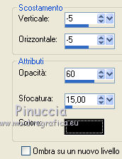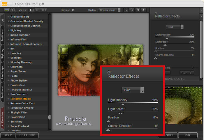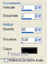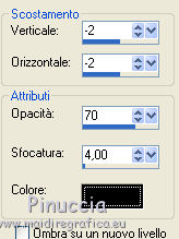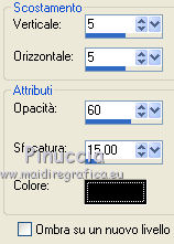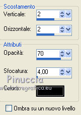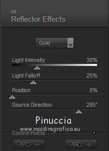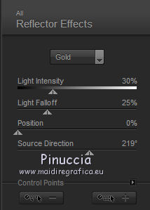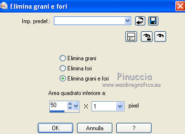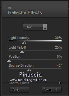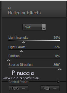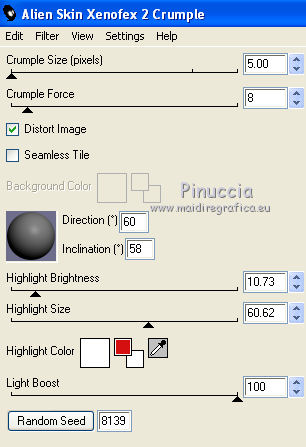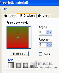 qui puoi trovare qualche risposta ai tuoi dubbi. Se l'argomento che ti interessa non è presente, ti prego di segnalarmelo. Per tradurre questo tutorial ho usato PSP X, ma può essere eseguito anche con le altre versioni di PSP. Questo tutorial è una creazione di ©Bluefay e non può essere copiato su altri siti nè essere offerto per il download. Lo stesso vale per la mia traduzione. Il materiale viene da vari gruppi di condivisione. Il copyright appartiene ai rispettivi autori. Grazie ai creatori dei tubes che mettono a disposizione il loro lavoro in vari gruppi di condivisione. Rispetta il lavoro degli autori, non cambiare il nome del file e non cancellare il watermark. Occorrente: Materiale qui La bella trama è di http://princess-of-shadows.deviantart.com/ Princess-of-shadow Filtri: FM Tile Tools - Blend Emboss qui Alien Skin Xenofex 2.0 - Crumple qui Nik Software - Color Efex Pro qui Ti servirà anche Animation Shop qui ![]() Metti le maschere nella cartella Maschere, e apri il resto del materiale in PSP. 1. Apri una nuova immagine trasparente 750 x 450 pixels. 2. Scegli due colori dal tube Soni-tuben-blatter-01.2008. Imposta il colore di primo piano con un bel colore (il mio il rosso #d50f10), e il colore di sfondo con un colore contrastante (il mio il verde #537711). Attenzione, i colori non devono essere troppo brillanti. 3. Passa il colore di primo piano a Gradiente lineare, con i seguenti settaggi. ![]() 4. Riempi l'immagine trasparente con il gradiente.5. Effetti>Effetti di trama>Veneziana. ![]() Ripeti l'Effetto Veneziana, togliendo la selezione a Orizzontale. ![]() 6. Apri il tube Sonja-tuben-blatter-01-2008 e vai a Modifica>Copia. Torna al tuo lavoro e vai a Modifica>Incolla come nuovo livello. Sposta il tube in alto a destra, come nel mio esempio.![]() 7. Livelli>Duplica. Immagine>Rifletti. Livelli>Duplica. Immagine>Capovolgi. 8. Apri il tube "Anewyearwithnoregrets mistedbyGini12-28-06" e vai a Modifica>Copia. Torna al tuo lavoro e vai a Modifica>Incolla come nuovo livello. Sposta questo tube in basso a destra, come nel mio esempio.![]() 9. Apri il tube Devilinside 378-2009 e vai a Modifica>Copia. Torna al tuo lavoro e vai a Modifica>Incolla come nuovo livello. Sposta il tube a sinistra.![]() 10. Chiudi il livello di sfondo. Livelli>Unisci>Unisci visibile. Riapri il livello di sfondo. Cambia la modalità di miscelatura del livello Uniti in Luminanza (esistente). 11. Livelli>Nuovo livello raster. Riempi con il gradiente.12. Livelli>Nuovo livello raster. Selezione>Seleziona tutto. 13. Apri la trama "Texture 3" e vai a Modifica>Copia. Torna al tuo lavoro e vai a Modifica>Incolla nella selezione. Selezione>Deseleziona. 14. Cambia la modalità di miscelatura di questo livello in Luce diffusa. 15. Livelli>Unisci>Unisci giù. 16. Effetti>Plugins>FM Tile Tools - Blend Emboss, con i settaggi standard. ![]() 17. Livelli>Carica/Salva maschera>Carica maschera da disco. Cerca e carica la maschera BMZZ3AY2: ![]() Livelli>Unisci>Unisci gruppo. 18. Effetti>Effetti 3D>Sfalsa ombra: ![]() Ripeti l'Effetto Sfalsa ombra, cambiando verticale e orizzontale con -2. ![]() 19. Effetti>Effetti di bordo>Aumenta. 20. Abbassa l'opacità di questo livello al 60%. 21. Livelli>Nuovo livello raster. Imposta il colore di primo piano con il bianco, e riempi il nuovo livello con questo colore.22. Livelli>Carica/Salva maschera>Carica maschera da disco. Cerca e carica la maschera bluefay_moments_mask. ![]() Livelli>Unisci>Unisci gruppo. 23. Selezione>Seleziona tutto. Selezione>Mobile. Selezione>Immobilizza. Premi sulla tastiera il tasto CANC. 24. Selezione>Modifica>Elimina grani e fori: ![]() 25. Livelli>Unisci>Unisci tutto. Mantieni ancora selezionato. 26. Effetti>Effetti 3D>Sfalsa ombra: ![]() Ripeti l'Effetto Sfalsa ombra, cambiando verticale e orizzontale con -5. ![]() 27. Selezione>Modifica>Contrai - 2 pixels. 28. Effetti>Plugins>Alien Skin Xenofex 2.0 - Crumple. ![]() 29. Selezione>Deseleziona. 30. Aggiungi il tuo nome e/o il tuo watermark su un nuovo livello. 31. Livelli>Unisci>Unisci tutto. 32. Selezione>Seleziona tutto. Selezione>Modifica>Contrai - 4 pixels. Selezione>Inverti. 33. Effetti>Effetti 3D>sfalsa ombra: ![]() Ripeti l'Effetto Sfalsa ombra, cambiando verticale e orizzontale con -2. ![]() 34. Regola>Aggiungi/Rimuovi disturbo>Aggiungi disturbo: ![]() 35. Effetti>Effetti di bordo>Aumenta. Selezione>Deseleziona. 36. Livelli>Unisci>Unisci tutto. Regola>Messa a fuoco>Metti a fuoco. 37. Effetti>Plugins>Nik Software - Color Efex Pro: Reflectors Effects con i seguenti settaggi. ![]() 38. Modifica>Copia. Apri Animation Shop e vai a Modifica>Incolla>Incolla come nuova animazione. 39. Torna in PSP. Modifica>Annulla azione Color Efex. Ripeti l'Effetto Color Efex con i seguenti settaggi. ![]() Modifica>Copia. Torna in Animation Shop e vai a Modifica>Incolla>Incolla dopo il fotogramma corrente. 40. In PSP. Modifica>Annulla azione Color Efex. Ripeti l'Effetto Color Efex con i seguenti settaggi. ![]() Modifica>Copia. Torna in Animation Shop e vai a Modifica>Incolla>Incolla dopo il fotogramma corrente. 41. In PSP. Modifica>Annulla azione Color Efex. Ripeti l'Effetto Color Efex con i seguenti settaggi. ![]() Modifica>Copia. Torna in Animation Shop e vai a Modifica>Incolla>Incolla dopo il fotogramma corrente. 42. Torna in PSP. Modifica>Annulla azione Color Efex. Ripeti l'Effetto Color Efex con i seguenti settaggi. ![]() Modifica>Copia. Torna in Animation Shop e vai a Modifica>Incolla>Incolla dopo il fotogramma corrente. 43. Torna in PSP. Modifica>Annulla azione Color Efex. Ripeti l'Effetto Color Efex con i seguenti settaggi. ![]() Modifica>Copia. Torna in Animation Shop e vai a Modifica>Incolla>Incolla dopo il fotogramma corrente. 44. Ed ecco la tua animazione composta da 6 fotogrammi. 45. Modifica>Seleziona tutto. Animazione>Proprietà fotogramma e imposta la velocità a 25. ![]() Controlla il risultato cliccando su Visualizza e salva in formato gif.![]() Se hai problemi o dubbi, o trovi un link non funzionan