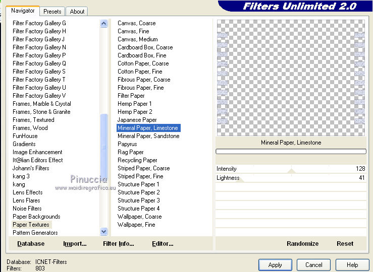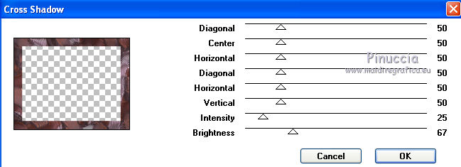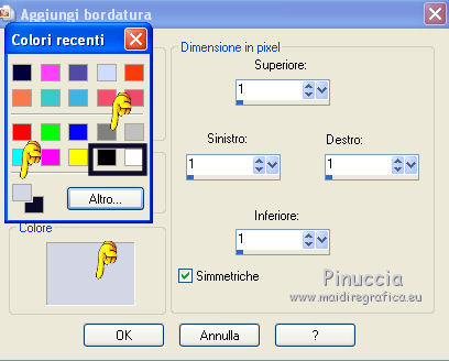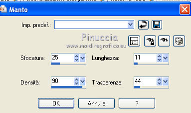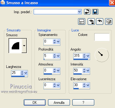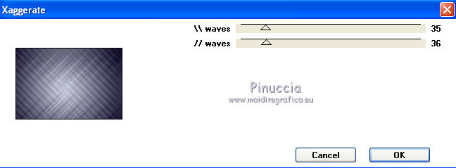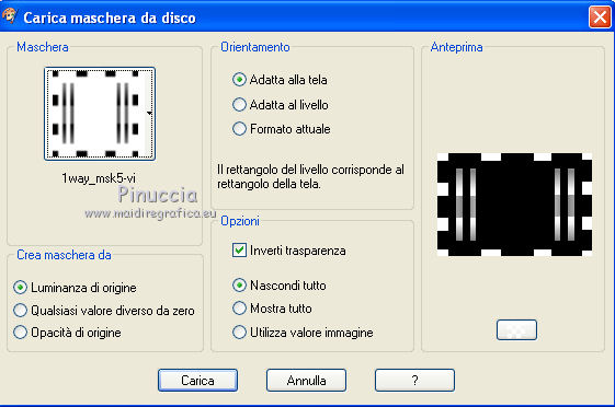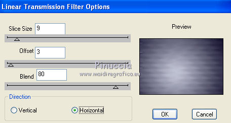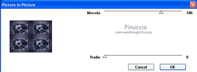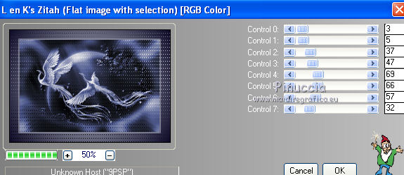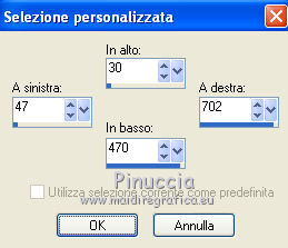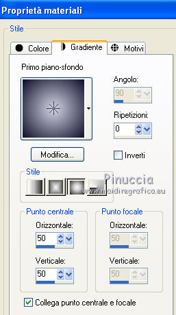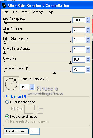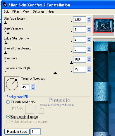 qui puoi trovare qualche risposta ai tuoi dubbi. Se l'argomento che ti interessa non è presente, ti prego di segnalarmelo. Per tradurre questo tutorial ho usato PSP X, ma può essere eseguito anche con le altre versioni di PSP. Questo tutorial è una creazione di ©Bluefay e non può essere copiato su altri siti nè essere offerto per il download. Lo stesso vale per la mia traduzione. Il materiale viene da vari gruppi di condivisione. Il copyright appartiene ai rispettivi autori. Grazie ai creatori dei tubes che mettono a disposizione il loro lavoro in vari gruppi di condivisione. Rispetta il lavoro degli autori, non cambiare il nome del file e non cancellare il watermark. Occorrente: Materiale qui Filtri: FM Tile Tools - Blend Emboss qui L&K - L&K Zitah qui Italian Editors Effect - Picture in picture qui Graphics Plus - Cross Shadow qui Funhouse - Xaggerate qui DSB FLUX - Linear Transmission qui Nik Color Efex Pro!1.03 - Graduated user defined qui Filters Unlimited 2.0 qui Alien Skin Xenofex 2.0 - Constellation qui Ti servirà anche Animation Shop qui ![]() Metti la maschera nella cartella Maschere. Apri la tua immagine. Immagine>Ridimensiona, a 400 pixels di larghezza. ![]() 2. Scegli due colori dalla tua immagine, e imposta il colore chiaro come colore di primo piano (il mio #d3d6e5). e il colore scuro come colore di sfondo (il mio #0f0c29. 3. Passa il colore di primo piano a Gradiente. ![]() 4. Effetti>Plugins>FM Tile Tools - Blend Emboss, con i settaggi standard. ![]() 5. Immagine>Aggiungi bordatura, 1 pixel, simmetriche, con il colore chiaro di primo piano. Ti ricordo che puoi richiamare i colori impostati nella tua paletta dei materiali. Cliccando con il tasto destro del mouse sulla paletta, ti apparirà la finestra con gli ultimi colori utilizzati. Tra questi, sono fissi il bianco e il nero alla fine della lista e - in basso a sinistra - i colori di primo piano e sfondo che hai impostato prima di eseguire il tutorial. ![]() 6. Immagine>Aggiungi bordatura, 1 pixel, simmetriche, con il colore scuro di sfondo. 7. Immagine>Aggiungi bordatura, 1 pixel, simmetriche, con il colore chiaro di primo piano. 8. Immagine>Aggiungi bordatura, 25 pixels, simmetriche, con il colore nero. 9. Seleziona il bordo nero con la bacchetta magica ,e riempi la selezione con il gradiente.10. Effetti>Plugins>L & K Landksiteofwonders - L & K Zitah. ![]() 11. Effetti>Effetti 3D>Smusso a incasso. ![]() 12. Selezione>Deseleziona. 13. Immagine>Aggiungi bordatura, 1 pixel, simmetriche, con il colore chiaro di primo piano. 14. Immagine>Aggiungi bordatura, 1 pixel, simmetriche, con il colore scuro di sfondo. 15. Immagine>Aggiungi bordatura, 1 pixel, simmetriche, con il colore chiaro di primo piano. 16. Immagine>Aggiungi bordatura, 45 pixels, simmetriche, con il colore nero. 17. Seleziona il bordo nero con la bacchetta magica ,e riempi la selezione con il gradiente.18. Effetti>Effetti di trama>Manto. ![]() 19. Effetti>Plugins>FM Tile Tools - Blend Emboss, con i settaggi standard. ![]() 20. Effetti>Plugins>Italian Editors Effect - Picture in picture. ![]() 21. Selezione>Deseleziona. 22. Immagine>Aggiungi bordatura, 1 pixel, simmetriche, con il colore chiaro di primo piano. 23. Immagine>Aggiungi bordatura, 1 pixel, simmetriche, con il colore scuro di sfondo. 24. Immagine>Aggiungi bordatura, 1 pixel, simmetriche, con il colore chiaro di primo piano. 25. Immagine>Aggiungi bordatura, 45 pixels, simmetriche, con il colore nero. 26. Seleziona il bordo nero con la bacchetta magica ,e riempi la selezione con il gradiente.27. Livelli>Nuovo livello raster. 28. Apri "bluefay tube - alien metal rahmen" e vai a Modifica>Copia. 29. Torna al tuo lavoro e vai a Modifica>Incolla nella selezione. 30. Selezione>Deseleziona. 31. Cambia la modalità di miscelatura di questo livello in Luminanza (esistente). 32. Effetti>Plugins>Graphics Plus - Cross Shadow. ![]() 33. Apri "bluefay tube-vorlage" e vai a Modifica>Copia. 34. Torna al tuo lavoro e vai a Modifica>Incolla come nuovo livello. 35. Selezione>Seleziona tutto. Selezione>mobile. Selezione>Immobilizza. 36. Riempi la selezione con il colore chiaro di primo piano.37. Selezione>Deseleziona. 38. Effetti>Plugins>Filters Unlimited 2.0 - Paper Textures - Mineral Paper,Limestone. ![]() 39. Effetti>Plugins>FM Tile Tools - Blend Emboss, con i settaggi standard. 40. Effetti>Effetti 3D>Sfalsa ombra, con il colore nero. ![]() 41. Immagine>Aggiungi bordatura, 1 pixel, simmetriche, con il colore scuro di sfondo. 42. Immagine>Aggiungi bordatura, 2 pixels, simmetriche, con il colore chiaro di primo piano. 43. Immagine>Ridimensiona, all'80%, tutti i livelli selezionato. 44. Modifica>Copia e minimizza l'immagine. 45. Apri una nuova immagine trasparente 750 x 500 pixels, e riempila con il gradiente.46. Effetti>Plugins>Funhouse - Xaggerate: ![]() 47. Modifica>Incolla come nuovo livello. 48. Regola>Messa a fuoco>Metti a fuoco. 49. Attiva il livello inferiore. 50. Livelli>Nuovo livello raster. Riempi con il colore chiaro di primo piano.51. Livelli>Carica/Salva maschera>Carica maschera da disco. Cerca e carica la maschera "1Way msk5": ![]() Livelli>Unisci>Unisci gruppo. 52. Effetti>Plugins>Filters Unlimited 2.0 - Paper Textures - Mineral Paper,Limestone. ![]() 53. Effetti>Plugins>FM Tile Tools - Blend Emboss, con i settaggi standard. 54. Effetti>Effetti 3D>Sfalsa ombra, con i settaggi precedenti. 55. Attiva il livello inferiore. 56. Attiva lo strumento Selezione ,clicca sull'icona Selezione personalizzata ![]() e imposta i seguenti settaggi: ![]() 57. Regola>Sfocatura>Sfocatura gaussiana - raggio 8. ![]() 58. Effetti>Plugins>DSB Flux - Linear Transmission. ![]() 59. Selezione>Modifica>Contrai - 2 pixels. Livelli>Unisci>Unisci tutto. Livelli>Nuovo livello raster. 60. Riempi la selezione con il colore chiaro di primo piano.61. Selezoine>Modifica>Contrai - 1 pixel. Premi sulla tastiera il tasto CANC. 62. Selezione>Modifica>Espandi - 2 pixels. 63. Selezione>Inverti. Livelli>Nuovo livello raster. 64. Effetti>Effe