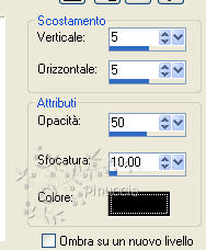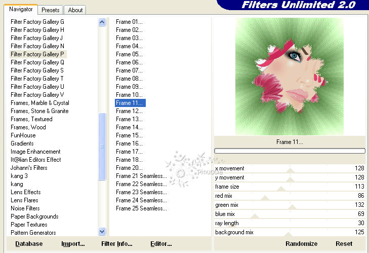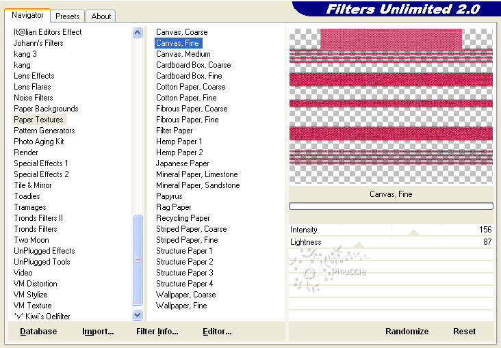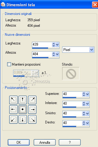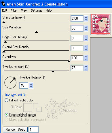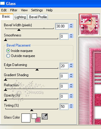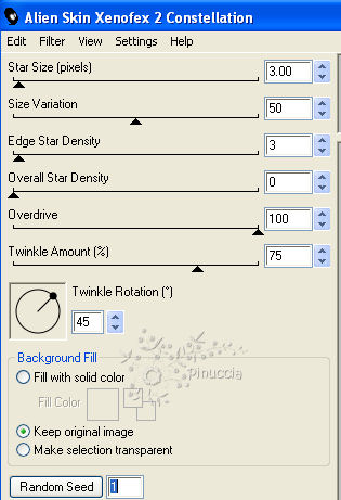 qui puoi trovare qualche risposta ai tuoi dubbi. Se l'argomento che ti interessa non è presente, ti prego di segnalarmelo. Per tradurre questo tutorial ho usato PSP X, ma può essere eseguito anche con le altre versioni di PSP. Questo tutorial è una creazione di ©Bluefay e non può essere copiato su altri siti nè essere offerto per il download. Lo stesso vale per la mia traduzione. Il materiale viene da vari gruppi di condivisione. Il copyright appartiene ai rispettivi autori. Grazie ai creatori dei tubes che mettono a disposizione il loro lavoro in vari gruppi di condivisione. Rispetta il lavoro degli autori, non cambiare il nome del file e non cancellare il watermark. Occorrente: Materiale qui Filtri: FM Tile Tools - Blend Emboss qui Eye Candy 4000 qui Alien Skin Xenofex 2.0 qui Filters Unlimited 2.0 qui Filter Factory Gallery P qui I filtri Factory Gallery per essere usati devono prima essere convertiti. Come fare vedi qui Si usano importandoli in Filters Unlimited (come fare vedi qui) ma possono funzionare anche da soli. Ti servirà anche Animation Shop qui ![]() 1. Scegli due colori dalla tua immagine, e imposta il colore di primo piano con il colore chiaro (il mio #ffffff bianco), e il colore di sfondo con un colore contrastante (il mio rosa). 2. Apri la tua immagine, e ridimensionala a 400 pixels di altezza. ![]() l'immagine fornita con il materiale ha la dimensione corretta 3. Immagine>Aggiungi bordatura, 1 pixel, simmetriche, con il colore chiaro di primo piano. Ricorda che puoi richiamare i colori impostati nella tua paletta dei materiali. Cliccando con il tasto destro del mouse sulla paletta, ti apparirà la finestra con gli ultimi colori utilizzati. Tra questi, sono fissi il bianco e il nero alla fine della lista e - in basso a sinistra - i colori di primo piano e sfondo che hai impostato prima di eseguire il tutorial. ![]() 4. Immagine>Aggiungi bordatura, 1 pixel, simmetriche, con il colore di sfondo. 5. Livelli>Innalza livello di sfondo. 6. Livelli>Nuovo livello raster. Livelli>Disponi>Sposta giù. 7. Immagine>Dimensione tela. ![]() 8. Riempi il livello con il colore di primo piano.9. Apri il tube "bluefay pink linien" e vai a Modifica>Copia. 10. Torna al tuo lavoro e vai a Modifica>Incolla come nuovo livello. 11. Regola>Aggiungi/Rimuovi disturbo>Aggiungi disturbo. ![]() 12. Effetti>Plugins>FM Tile Tools - Blend Emboss, con i settaggi standard. ![]() 13. Effetti>Effetti 3D>Sfalsa ombra, con il colore nero. ![]() 14. Ripeti l'Effetto Sfalsa ombra, cambiando verticale e orizzontale con -2. 15. Livelli>Nuovo livello raster. Attiva lo strumento Selezione ,clicca sull'icona Selezione personalizzata ![]() e imposta i seguenti settaggi: ![]() Riempi la selezione con il colore di sfondo.Selezione>Deseleziona. 17. Effetti>Plugins>Filters Unlimited - Paper Textures - Canvas fine. ![]() 18. Livelli>Disponi>Sposta giù. Livelli>Duplica. Immagine>Capovolgi. 19. Attiva il livello superiore. Effetti>Effetti 3D>Sfalsa ombra, con il colore nero. ![]() Ripeti l'Effetto Sfalsa ombra, cambiando verticale e orizzontale con -5. 20. Immagine>Aggiungi bordatura, 1 pixel, simmetriche, con il colore chiaro di primo piano. 21. Immagine>Aggiungi bordatura, 2 pixels, simmetriche, con il colore scuro di sfondo. 22. Immagine>Aggiungi bordatura, 1 pixel, simmetriche, con il colore chiaro di primo piano. 23. Selezione>Seleziona tutto. Selezione>Modifica>Contrai - 4 pixels. 24. Effetti>Effetti 3D>Ritaglio. ![]() Ripeti l'Effetto Ritaglio cambiando verticale e orizzontale con -1. 25. Selezione>Deseleziona. 26. Immagine>Aggiungi bordatura, 10 pixels, simmetriche, con il colore di sfondo. 27. Seleziona questo bordo con la bacchetta magica ![]() 28. Regola>Aggiungi/Rimuovi disturbo>Aggiungi disturbo. ![]() Mantieni selezionato. 29. Effetti>Effetti 3D>Smusso a incasso. ![]() 30. Selezione>Deseleziona. 31. Immagine>Aggiungi bordatura, 1 pixel, simmetriche, con il colore chiaro di primo piano. 32. Immagine>Aggiungi bordatura, 2 pixels, simmetriche, con il colore di sfondo. 33. Immagine>Aggiungi bordatura, 1 pixel, simmetriche, con il colore chiaro di primo piano. 34. Immagine>Aggiungi bordatura, 35 pixels, simmetriche, con il colore nero. 35. Seleziona questo bordo con la bacchetta magica ![]() 36. Effetti>Plugins>Filters Unlimited - Filter Factory Gallery P - Frame 11. ![]() 37. Mantieni ancora selezionato. 38. Regola>Tonalità e saturazione>Viraggio, con i valori corrispondenti al tuo colore di sfondo. ![]() 39. Mantieni ancora selezionato. Effetti>Plugins>Eye Candy 4000 - Glass: ![]() 40. Selezione>Deseleziona. Apri il tube "deco corner" e vai a Modifica>Copia. Torna al tuo lavoro e vai a Modifica>Incolla come nuovo livello. Spostalo nell'angolo in basso a destra.41. Livelli>Duplica. Immagine>Rifletti. Immagine>Capovolgi. 42. Immagine>Aggiungi bordatura, 1 pixel, simmetriche, con il colore chiaro di primo piano. 43. Immagine>Ridimensiona - a 550 pixels di altezza. ![]() 44. Aggiungi il tuo nome e/o il tuo watermark su un nuovo livello. 45. Livelli>Unisci>Unisci tutto. 46. Effetti>Plugins>Alien Skin Xenofex 2.0 - Constellation. ![]() 47. Modifica>Copia. Apri Animation Shop e vai a Modifica>Incolla>Incolla come nuova animazione. 48. Torna in PSP. Modifica>Annulla azione Constellation. Ripeti l'Effetto Constellation cambiando soltanto Star size con 3,00. ![]() Modifica>Copia. Torna in Animation Shop e vai a Modifica>Incolla>Incolla dopo il fotogramma corrente. Modifica>Seleziona tutto. Animazione>Proprietà fotogramma e imposta la velocità a 8. Controlla il risultato cliccando su Visualizza e salva in formato jpg.![]() ![]() Se hai problemi o dubbi, o trovi un link non funzionante, o anche soltanto per un saluto, scrivimi 1 Luglio 2010 |