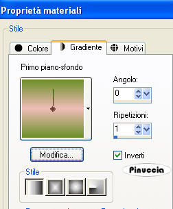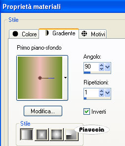 qui puoi trovare qualche risposta ai tuoi dubbi. Se l'argomento che ti interessa non è presente, ti prego di segnalarmelo. Per tradurre questo tutorial ho usato PSP X, ma può essere eseguito anche con le altre versioni di PSP. Questo tutorial è una creazione di ©Bluefay e non può essere copiato su altri siti nè essere offerto per il download. Lo stesso vale per la mia traduzione. Il materiale viene da vari gruppi di condivisione. Il copyright appartiene ai rispettivi autori. Grazie ai creatori dei tubes che mettono a disposizione il loro lavoro in vari gruppi di condivisione. Rispetta il lavoro degli autori, non cambiare il nome del file e non cancellare il watermark. Occorrente: Materiale qui Il copyright dell'immagine di sfondo appartiene a Thinkdesignblog (blog chiuso) Filtri: Mura's Meister - Perspective Tiling qui FM Tile Tools - Blend Emboss qui ![]() Metti le maschere nella cartella Maschere, e apri il resto del materiale in PSP. 1. Apri l'immagine di sfondo "TD MotionColorBand 4". Questa sarà la base del tuo lavoro. 2. Effetti>Effetti di immagine>Motivo unico. ![]() 3. Imposta il colore di primo piano con un colore dell'immagine (per il mio esempio ho scelto il colore rosa #efbdb8), imposta il colore di sfondo con un colore contrastante (il mio il colore verde #6b8f27). 4. Passa il colore di primo piano a Gradiente. ![]() 5. Livelli>Nuovo livello raster. Riempi il livello con il gradiente.6. Selezione>Seleziona tutto. Selezione>Modifica>Contrai - 3 pixels. Premi sulla tastiera il tasto CANC. Mantieni selezionato. 7. Cambia i settaggi del gradiente. ![]() 8. Riempi la selezione con il gradiente.9. Selezione>Modifica>Contrai - 3 pixels. Premi sulla tastiera il tasto CANC. 10. Selezione>Inverti. Effetti>Effetti di bordo>Aumenta. Selezione>Inverti. 11. Riporta i settaggi del Gradiente come al punto 2. ![]() 12. Riempi con il gradiente.Mantieni ancora selezionato. 13. Livelli>Nuovo livello raster. 14. Effetti>Effetti 3D>Ritaglio: ![]() 15. Selezione>Deseleziona. Livelli>Unisci>Unisci giù. 16. Immagine>Ridimensiona, a 213 x 174 pixels, mantieni proporzioni e tutti i livelli non selezionato. ![]() 17. Regola>Messa a fuoco>Metti a fuoco. 18. Effetti>Plugins>Mura's Meister - Perspective Tiling. ![]() 19. Chiudi il livello inferiore. Livelli>Unisci>Unisci visibile. 20. Sei sempre posizionato sul livello superiore (per chiudere un livello non è necessario spostarsi su questo livello). 21. Sposta il livello in alto,pressappoco come nel mio esempio. ![]() 22. Sempre rimanendo posizionato sul livello superiore, riapri il livello di sfondo, e cambia la modalità di miscelatura del livello superiore in Luce diffusa. 23. Effetti>Effetti di bordo>Aumenta di più. 24. Livelli>Duplica. Immagine>Capovolgi. Livelli>Unisci>Unisci visibile. 25. Livelli>Nuovo livello raster. Riempi il livello con il colore di sfondo (tasto destro del mouse).26. Selezione>Seleziona tutto. Selezione>Modifica>Contrai - 2 pixels. Premi sulla tastiera il tasto canc. Riempi la selezione con il colore di primo piano.27. Selezione>Modifica>Contrai - 2 pixels. Premi sulla tastiera il tasto CANC. 28. Mantieni ancora selezionato. 29. Cambia i settaggi del gradiente. ![]() 30. Riempi la selezione con il gradiente.Mantieni ancora selezionato. 31. Livelli>Carica/Salva maschera>Carica maschera da disco. Cerca e carica la maschera @hummel_jutta mask 100.5": ![]() Selezione>Deseleziona. Livelli>Unisci>Unisci gruppo. 32. Clicca con la bacchetta magica al centro della cornice per selezionarla.![]() 33. Selezione>Modifica>Espandi - 1 pixel. 34. Livelli>Nuovo livello raster. Livelli>Disponi>Sposta giù. Riempi la selezione con il colore di sfondo.35. Mantieni ancora selezionato. Livelli>Nuovo livello raster. 36. Apri il tube "FeelingRoseArte10" e vai a Modifica>Copia. torna al tuo lavoro e vai a Modifica>Incolla come nuovo livello. 37. Selezione>Inverti. Premi sulla tastiera il tasto CANC. Selezione>Deseleziona. 38. Cambia la modalità di miscelatura di questo livello in Luminanza (esistente). 39. Chiudi il livello inferiore. 40. Livelli>Unisci>Unisci visibile. Riapri il livello inferiore. 41. Immagine>Ridimensiona, a 239 x 252 pixels, mantieni proporzioni e tutti i livelli non selezionato. ![]() 42. Sposta l'immagine a sinistra, come nel mio esempio.![]() 43. Effetti>Effetti di bordo>Aumenta. 44. Livelli>Duplica. Immagine>Rifletti. Livelli>Unisci>Unisci giù. 45. Apri il tube "Visage7 MAI2009 Creativeloves" e vai a Modifica>Copia. Torna al tuo lavoro e vai a Modifica>Incolla come nuovo livello. 46. Livelli>Carica/Salva maschera>Carica maschera da disco. Cerca e carica la maschera 20-20; ![]() Livelli>Unisci>Unisci gruppo. 47. Livelli>Unisci>Unisci visibile. 48. Livelli>Duplica. Regola>Sfocatura>sfocatura gaussiana - raggio 15. ![]() 49. Apri il tube "Mariel 2006 09Septembre smoke22t" e e vai a Modifica>Copia. Torna al tuo lavoro e vai a Modifica>Incolla come nuovo livello. Spostalo in alto, come nell'esempio.![]() 50. Regola>Tonalità e saturazione>Viraggio, con valori corrispondenti al tuo colore di sfondo (la saturazione non deve superare 98). ![]() 51. Livelli>Duplica. Immagine>Rifletti. Immagine>Capovolgi. 52. Livelli>Unisci>Unisci giù. 53. Effetti>Effetti di immagine>Motivo unico. ![]() 54. Cambia la modalità di miscelatura di questo livello in Sovrapponi. 55. Effetti>Plugins>FM Tile Tools - Blend Emboss, con i settaggi standard. ![]() 56. Livelli>Unisci>Unisci giù. 57. Livelli>Nuovo livello raster. Riempi il livello con il colore bianco.58. Selezione>Seleziona tutto. Selezione>Modifica>Contrai - 2 pixels. Premi sulla tastiera il tasto CANC. Selezione>Deseleziona. 59. Livelli>Unisci>Unisci giù. Livelli>Disponi>Porta sotto. Attiva il livello superiore. 60. Livelli>Nuovo livello raster. Riempi il livello con il colore bianco.61. Selezione>Seleziona tutto. Selezione>Modifica>Contrai - 2 pixels. Premi sulla tastiera il tasto CANC. Selezione>Deseleziona. 62. Livelli>Unisci>Unisci giù. 63. Immagine>Ridimensiona, al 90%, tutti i