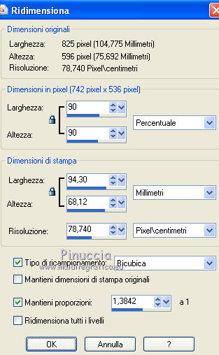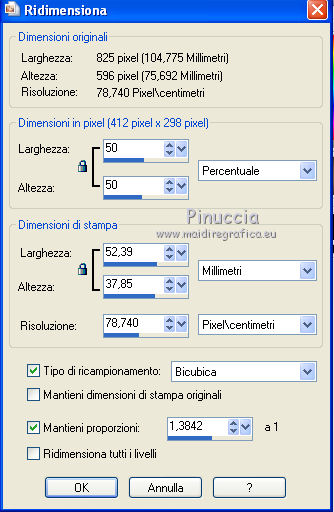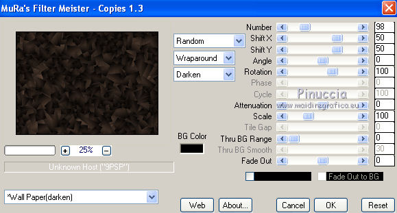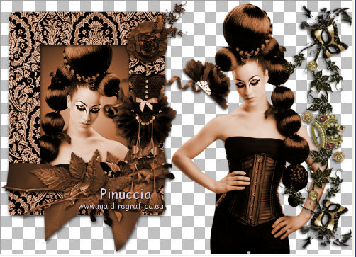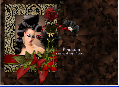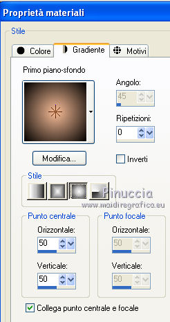 qui puoi trovare qualche risposta ai tuoi dubbi. Se l'argomento che ti interessa non è presente, ti prego di segnalarmelo. Per tradurre questo tutorial ho usato PSP X, ma può essere eseguito anche con le altre versioni di PSP. Questo tutorial è una creazione di ©Bluefay e non può essere copiato su altri siti nè essere offerto per il download. Lo stesso vale per la mia traduzione. Il materiale viene da vari gruppi di condivisione. Il copyright appartiene ai rispettivi autori. Grazie ai creatori dei tubes che mettono a disposizione il loro lavoro in vari gruppi di condivisione. Rispetta il lavoro degli autori, non cambiare il nome del file e non cancellare il watermark. Occorrente: Materiale qui Il © del materiale scrap è di http://raspberryroaddesigns.blogspot.com/ Raspberry Road Designs Filtri: Mura's Meister - Copies qui FM Tile Tools - Blend Emboss qui Ti servirà anche Animation Shop qui ![]() 1. Scegli un colore dal tube "tube femme 557". e impostalo come colore di primo piano (il mio #fabe98), Imposta il colore di sfondo con il nero. 2. Passa il colore di primo piano a Gradiente. ![]() 3. Apri una nuova immagine trasparente 825 x 596 pixels. 4. Riempi l'immagine trasparente con il gradiente.5. Livelli>Duplica. 6. Immagine>Ridimensiona, al 50%, tutti i livelli non selezionato. ![]() 7. Effetti>Plugins>Mura's Meister - Copies. ![]() ti ricordo che "random" significa "casuale". Per questo, il risultato non potrà essere uguale al mio esempio 8. Cambia la modalità di miscelatura di questo livello in luce netta. 9. Livelli>Unisci>Unisci visibile. 10. Effetti>Plugins>FM Tile Tools - Blend Emboss, con i settaggi standard. ![]() 11. Effetti>Effetti di immagine>Motivo unico. ![]() 12. Apri il tube "RR EK Renaissance cluster (3) e vai a Modifica>Copia. 13. Torna al tuo lavoro e vai a Modifica>Incolla come nuovo livello. 14. Spostalo a sinistra.![]() 15. Attiva lo strumento Selezione , rettangolo,e traccia una selezione come nell'esempio. ![]() 16. Livelli>Nuovo livello raster. 17. Riempi la selezione con il gradiente.18. Livelli>Disponi>Sposta giù. Mantieni selezionato. 19. Apri il tube "tube femme 557" e vai a Modifica>Copia. minimizza il tube perchè ti servirà ancora 20. Torna al tuo lavoro e vai a Modifica>Incolla come nuovo livello. 21. Posiziona il tube a sinistra, come nel mio esempio.![]() 22. Selezione>Inverti. Premi sulla tastiera il tasto CANC. Selezione>Deseleziona. 23. Attiva il livello superiore. ![]() 24. Apri il tube "RR EK Renaissance oooolala" e vai a Modifica>Copia. 25. Torna al tuo lavoro e vai a Modifica>Incolla come nuovo livello. 26. Immagine>Rifletti. Sposta il tube come nell'esempio.![]() 27. Chiudi il livello inferiore. 28. Livelli>Unisci>Unisci visibile. 29. Regola>Messa a fuoco>Metti a fuoco. 30. Rimani posizionato sul livello superiore. 31. Regola>Tonalità e saturazione>Viraggio, con i valori corrispondenti al tuo colore di primo piano. attenzione però: il valore massimo della saturazione dovrà essere 120 ![]() 32. Attiva nuovamente il tube "tube femme 557" e vai a Modifica>Copia. 33. Torna al tuo lavoro e vai a Modifica>Incolla come nuovo livello. Immagine>Rifletti. 34. Sposta il tube a destra, come nel mio esempio.![]() 35. Regola>Tonalità e saturazione>Viraggio, con i settaggi precedenti. ![]() 36. Apri il tube "RR EK Renaissance Bordercluster" e vai a Modifica>Copia. 37. Torna al tuo lavoro e vai a Modifica>Incolla come nuovo livello. 38. Immagine>Ruota per gradi - 90 gradi a destra. ![]() 39. Sposta il tube a destra.![]() 40. Regola>Tonalità e saturazione>Viraggio, con i settaggi precedenti. ![]() 41. Regola>Messa a fuoco>Metti a fuoco. 42. Rimanendo sempre posizionato sul livello Uniti, riapri il livello inferiore. ![]() 43. Immagine>Ridimensiona, al 90%, tutti i livelli non selezionato. ![]() 44. Attiva il livello inferiore. 45. Immagine>Ridimensiona, al 90%, tutti i livelli non selezionato. ![]() 46. Dovresti avere questo. ![]() 48. Assicurati di essere posizionato sul livello inferiore. 49. Selezione>Seleziona tutto. Selezione>Mobile. Selezione>immobilizza. 50. Livelli>nuovo livello raster. 51. Apri "bluefay tube - animation" e vai a Modifica>Copia. 52. Torna al tuo lavoro e vai a Modifica>Incolla nella selezione. Mantieni selezionato. 53. Regola>Tonalità e saturazione>Viraggio, con i settaggi precedenti. ![]() 54. Rinomina questo livello "animazione". 55. Livelli>Nuovo livello raster. Riempi con il colore di primo piano.56. Selezione>Modifica>Contrai - 2 pixels. Premi sulla tastiera il tasto CANC. Selezione>Deseleziona. 57. Livelli>Disponi>Porta in alto. 58. Livelli>Nuovo livello raster. Riempi con il colore di primo piano.56. Selezione>Modifica>Contrai - 1 pixel. Premi sulla tastiera il tasto CANC. Selezione>Deseleziona. 57. Apri "bluefay tube - hintergrundbild" e vai a Modifica>Copia. 58. Torna al tuo lavoro e vai a Modifica>Incolla come nuovo livello. 59. Regola>Tonalità e saturazione>Viraggio, con i settaggi precedenti. ![]() 60. Livelli>Disponi>Porta sotto. 61. Cambia la modalità di miscelatura di questo livello in Moltiplica. non stupirti, se ti sembrerà di non vedere alcuna differenza 62. Effetti>Plugins>FM Tile Tools - Blend Emboss, con i settaggi standard. ![]() 63. Livelli>Nuovo livello raster. Riempi con il gradiente.64. Livelli>Disponi>Porta sotto. 65. Attiva il livello superiore. 66. Aggiungi il tuo nome e/o il tuo watermark su un nuovo livello. 67. Attiva il livello "animazione". 68. Regola>Aggiungi/Rimuovi disturbo>Aggiungi disturbo. ![]() Modifica>Copia Unione. 69. Apri Animation Shop e vai a Modifica>Incolla>Incolla come nuova animazione. 70. Torna in PSP. Modifica>Annulla azione Aggiungi disturbo. 71. Ripeti Aggiungi disturbo portando il disturbo a 55. ![]() Modifica>Copia Unione. 72. Torna in Animation Shop e vai a Modifica>Incolla>Incolla dopo il fotogramma corrente. 73. Controlla il risultato cliccando su Visualizza e salva in formato gif.![]() Se hai problemi o dubbi, o trovi un link non funzionante, o anche solt