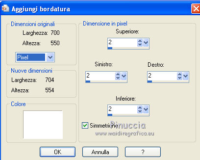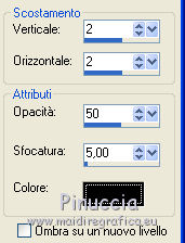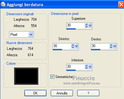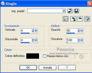 qui puoi trovare qualche risposta ai tuoi dubbi. Se l'argomento che ti interessa non è presente, ti prego di segnalarmelo. Per tradurre questo tutorial ho usato PSP X, ma può essere eseguito anche con le altre versioni di PSP. Questo tutorial è una creazione di ©Bluefay e non può essere copiato su altri siti nè essere offerto per il download. Lo stesso vale per la mia traduzione. Il materiale viene da vari gruppi di condivisione. Il copyright appartiene ai rispettivi autori. Grazie ai creatori dei tubes che mettono a disposizione il loro lavoro in vari gruppi di condivisione. Rispetta il lavoro degli autori, non cambiare il nome del file e non cancellare il watermark. Occorrente: Scrapkit di Bluefay "Romantic Butterfly" qui Tubes qui ![]() 1. Apri una nuova immagine trasparente 700 x 550 pixels. 2. Selezione>Seleziona tutto. 3. Apri l'elemento scrap "Paper 3" e vai a Modifica>Copia. Torna al tuo lavoro e vai a Modifica>Incolla nella selezione. 4. Regola>Messa a fuoco>Metti a fuoco. Selezione>Deseleziona. 5. Apri l'elemento scrap "Deco Ribbon" e vai a Modifica>Copia. Torna al tuo lavoro e vai a Modifica>Incolla come nuovo livello. 6. Immagine>Ruota per gradi - 90 gradi a destra. ![]() 7. Sposta l'elemento a sinistra, come nel mio esempio.8. Effetti>Effetti 3D>Sfalsa ombra, con il colore nero. ![]() 9. Livelli>Duplica. Immagine>Rifletti. 10. Livelli>Unisci>Unisci giù. 11. Regola>Messa a fuoco>Metti a fuoco. 12. Livelli>Unisci>Unisci visibile. 13. Apri l'elemento scrap "Rahmen" e vai a Modifica>Copia. Torna al tuo lavoro e vai a Modifica>Incolla come nuovo livello. 14. Attiva lo strumento Bacchetta magica ![]() e clicca all'interno della cornice per selezionarla. 15. Selezione>Espandi - 3 pixels. 16. Mantieni selezionato. Livelli>Nuovo livello raster. 17. Apri l'elemento scrap "Paper 2" e vai a Modifica>Copia. Torna al tuo lavoro e vai a Modifica>Incolla nella selezione. 18. Mantieni ancora selezionato. Regola>Messa a fuoco>Metti a fuoco. 19. Livelli>Nuovo livello raster. Apri il tube "A Pretty Face N Butterfly 2 Lizztish" e vai a Modifica>Copia. Torna al tuo lavoro e vai a Modifica>Incolla nella selezione. Selezione>Deseleziona. 20. Cambia la modalità di miscelatura di questo livello in Luminanza (esistente). 21. Regola>Messa a fuoco>Accentua messa a fuoco. 22. Livelli>Unisci>Unisci giù. 23. Livelli>Disponi>Sposta giù. 24. Attiva il livello superiore. Livelli>Unisci>Unisci giù. 25. Effetti>Effetti 3D>Sfalsa ombra, con il colore nero. ![]() Ripeti l'Effetto Sfalsa ombra, cambiando verticale e orizzontale con -8. 26. Apri l'elemento scrap "Fantasy Doodle" e vai a Modifica>Copia. Torna al tuo lavoro e vai a Modifica>Incolla come nuovo livello. 27. Spostalo in basso a sinistra, come nel mio esempio.28. Livelli>Disponi>Sposta giù. 29. Effetti>Effetti 3D>Sfalsa ombra, con il colore nero. ![]() 30. Livelli>Duplica. Immagine>Rifletti. Immagine>Capovolgi. 31. Livelli>Unisci>Unisci visibile. 32. Apri l'elemento scrap "Flower 1" e vai a Modifica>Copia. Torna al tuo lavoro e vai a Modifica>Incolla come nuovo livello. 33. Sposta l'elemento in basso a destra, come nel mio esempio. 34. Regola>Messa a fuoco>Accentua messa a fuoco. 35. Apri l'elemento scrap "Butterfly" e vai a Modifica>Copia. Torna al tuo lavoro e vai a Modifica>Incolla come nuovo livello. 36. Sposta la farfalla sul fiore, come nel mio esempio.37. Apri l'elemento scrap "Flower 2" e vai a Modifica>Copia. Torna al tuo lavoro e vai a Modifica>Incolla come nuovo livello. 38. Spostalo in alto a sinistra, come nel mio esempio.![]() 39. Regola>Messa a fuoco>Accentua messa a fuoco. 40. Immagine>Aggiungi brodatura, 2 pixels, simmetriche, con il colore bianco. ![]() 41. Selezione>Seleziona tutto. Selezione>Modifica>Contrai - 2 pixels. 42. Effetti>Effetti 3D>Ritaglio. ![]() 43. Ripeti l'Effetto Ritaglio cambiando verticale e orizzontale con -4. 44. Selezione>Deseleziona. 45. Immagine>Aggiungi bordatura, 30 pixels, simmetriche, con il colore nero. ![]() 46. Seleziona questo bordo con la bacchetta magica ![]() 47. Apri l'elemento scrap "Paper 1" e vai a Modifica>Copia. Torna al tuo lavoro e vai a Modifica>Incolla nella selezione. 48. Mantieni selezionato. Effetti>Effetti 3D>Smusso a incasso. ![]() Selezione>Deseleziona. 49. Immagine>Aggiungi bordatura, 2 pixels, simmetriche, con il colore bianco. 50. Immagine>Ridimensiona, a 630 pixels di larghezza, tutti i livelli selezionato. ![]() Firma il tuo lavoro e salva in formato jpg. ![]() Se hai problemi o dubbi, o trovi un link non funzionante, o anche soltanto per un saluto, scrivimi 9 Settembre 2010 |