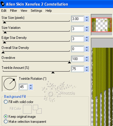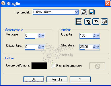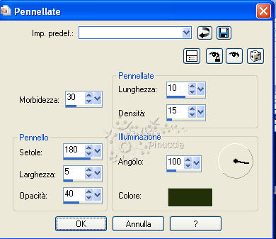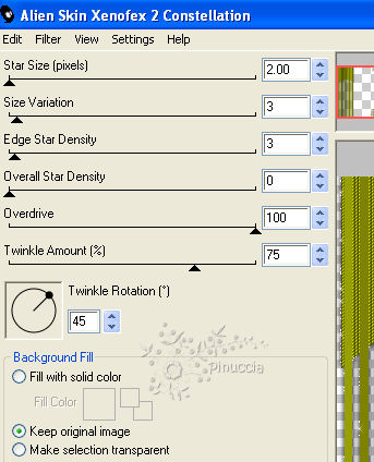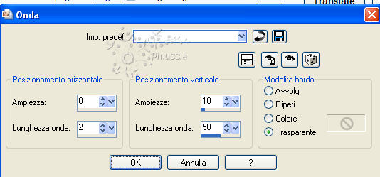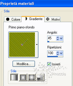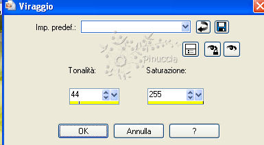 qui puoi trovare qualche risposta ai tuoi dubbi. Se l'argomento che ti interessa non è presente, ti prego di segnalarmelo. Per tradurre questo tutorial ho usato PSP X, ma può essere eseguito anche con le altre versioni di PSP. Questo tutorial è una creazione di ©Bluefay e non può essere copiato su altri siti nè essere offerto per il download. Lo stesso vale per la mia traduzione. Il materiale viene da vari gruppi di condivisione. Il copyright appartiene ai rispettivi autori. Grazie ai creatori dei tubes che mettono a disposizione il loro lavoro in vari gruppi di condivisione. Rispetta il lavoro degli autori, non cambiare il nome del file e non cancellare il watermark. Occorrente: Materiale qui il tube "Bluefay Spring by AO-Photography" è stato creato da un'immagine trovata in rete. il copyright appartiene all'artista originale: ao photography - abi oshodi www.ao-photography.co.uk Filtri: FM Tile Tools - Blend Emboss qui Mura's Seamless - Tile Rotate qui Alien Skin Xenofex 2.0 - Constellation qui Ti servirà anche Animation Shop qui ![]() 1. Scegli due colori dal tube Bluefay Spring by AO-Photography. 2. Imposta il colore di primo piano con il colore chiaro (il mio #d8e200), e il colore di sfondo con il colore scuro (il mio #23300a). 3. Apri una nuova immagine trasparente 750 x 500 pixels. 4. Selezione>Seleziona tutto. 5. Apri l'immagine di sfondo "bluefay hintergrundbild spring" e vai a Modifica>Copia. 6. Torna al tuo lavoro e vai a Modifica>Incolla nella selezione. Selezione>Deseleziona. 7. Regola>Tonalità e saturazione>Viraggio, con i valori corrispondenti al tuo colore chiaro di primo piano. vedi sul Viraggio qui 8. Livelli>Nuovo livello raster. Selezione>Seleziona tutto. 9. Apri il tube "firstasteofspring" e vai a Modifica>Copia. non chiuderlo perchè ti servirà ancora 10. Torna al tuo lavoro e vai a Modifica>Incolla nella selezione. Selezione>Deseleziona. 11. Effetti>Effetti di immagine>Motivo unico. ![]() 12. Cambia la modalità di miscelatura di questo livello in Luce diffusa. 13. Livelli>Unisci>Unisci visibile. 14. Livelli>Duplica, e attiva il livello sottostante. 15. Effetti>Effetti tecniche di disegno>Pennellate. ![]() 16. Attiva il livello superiore. 17. Attiva nuovamente il tube "firstasteofspring sjs" e vai a Modifica>Copia. puoi chiuderlo perchè non ti servirà più 18. Torna al tuo lavoro e vai a Modifica>Incolla come nuovo livello. Sposta il tube a sinistra.![]() 19. Apri il tube "Bluefay Spring by AO-Photography" e vai a Modifica>Copia. non chiuderlo perchè ti servirà ancora 20. Torna al tuo lavoro e vai a Modifica>Incolla come nuovo livello. Sposta il tube a destra.![]() 21. Livelli>Unisci>Unisci giù. 22. Cambia la modalità di miscelatura di questo livello in Luce netta, e abbassa l'opacità al 70%. 23. Passa il colore di primo piano a Gradiente. ![]() 24. Livelli>Nuovo livello raster. Selezione>Seleziona tutto. Riempi la selezione con il gradiente.25. Selezione>Modifica>Contrai - 2 pixels. Premi sulla tastiera il tasto CANC. Selezione>Deseleziona. 26. Chiudi il livello inferiore. 27. Livelli>Unisci>Unisci visibile. 28. Riapri il livello inferiore e rimani posizionato sul livello superiore. 29. Immagine>Ridimensiona, all'85%, tutti i livelli non selezionato. ![]() 30. Livelli>Unisci>Unisci visibile. 31. Livelli>Nuovo livello raster. 32. Attiva lo strumento Selezione ![]() clicca sull'icona Selezione personalizzata ![]() e imposta i seguenti settaggi. ![]() 33. Riempi la selezione con il colore chiaro di primo piano.34. Effetti>Effetti di trama>Veneziana. ![]() Ripeti l'Effetto Veneziana, togliendo la selezione a Orizzontale. ![]() 35. Selezione>Deseleziona. 36. Effetti>Effetti di distorsione>Onda. ![]() 37. Effetti>Plugins>Mura's Seamless - Tile Rotate. ![]() 38. Livelli>Duplica. Immagine>Rifletti. Immagine>Capovolgi. 39. Livelli>Unisci>Unisci giù. 40. Effetti>Effetti 3D>Sfalsa ombra: ![]() Ripeti l'Effetto Sfalsa ombra, cambiando verticale e orizzontale con -2. 41. Apri il tube "CJ_Floral corner" e vai a Modifica>Copia. 42. Torna al tuo lavoro e vai a Modifica>Incolla come nuovo livello. Sposta il tube a destra.43. Regola>Tonalità e saturazione>Viraggio, con i valori corrispondenti al tuo colore chiaro di primo piano. ![]() 44. Effetti>Plugins>FM Tile Tools - Blend Emboss, con i settaggi standard. ![]() 45. Livelli>Unisci>Unisci giù. ![]() 46. Rinomina questo livello "animazione". 47. Apri il tube "Bluefay Spring by AO-Photography". 48. Immagine>Rifletti. 49. Modifica>Copia. puoi chiuderlo perchè non ti servirà più 50. Torna al tuo lavoro e vai a Modifica>Incolla come nuovo livello. Sposta il tube a sinistra.![]() 51. Livelli>Nuovo livello raster. Selezione>Seleziona tutto. Riempi la selezione con il gradiente.52. Selezione>Modifica>Contrai - 2 pixels. Premi sulla tastiera il tasto CANC. 53. Effetti>Effetti 3D>Ritaglio. ![]() 54. Selezione>Deseleziona. 55. Aggiungi il tuo nome e/o il tuo watermark su un nuovo livello. 56. Attiva il livello "animazione". 57. Effetti>Plugins>Alien Skin Xenofex 2.0 - Constellation. ![]() 58. Modifica>Copia Unione. Se stai usando PSP X2: Modifica>Copia Speciale>Copia Unione 59. Apri Animation Shop e vai a Modifica>Incolla>Incolla come nuova animazione. 60. Torna in PSP. Modifica>Annulla azione Constellation. Ripeti l'Effetto Constellation, cambiando soltanto Star Size con 3,00. ![]() 61. Modifica>Copia Unione. Torna in Animation Shop e vai a Modifica>Incolla>Incolla dopo il fotogramma corrente. Controlla il risultato cliccando su Visualizza e salva in formato gif.![]() Se hai problemi o dubbi, o trovi un link non funzionante, o anche soltanto per un saluto, scrivimi 27 Giugno 2010 |