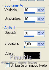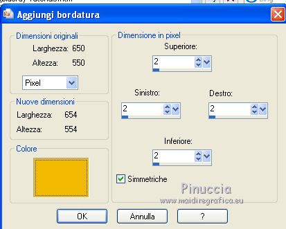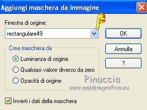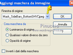 qui puoi trovare qualche risposta ai tuoi dubbi. Se l'argomento che ti interessa non è presente, ti prego di segnalarmelo. Per tradurre questo tutorial ho usato PSP X, ma può essere eseguito anche con le altre versioni di PSP. Questo tutorial è una creazione di ©Bluefay e non può essere copiato su altri siti nè essere offerto per il download. Lo stesso vale per la mia traduzione. Il materiale viene da vari gruppi di condivisione. Il copyright appartiene ai rispettivi autori. Grazie ai creatori dei tubes che mettono a disposizione il loro lavoro in vari gruppi di condivisione. Rispetta il lavoro degli autori, non cambiare il nome del file e non cancellare il watermark. Occorrente: Materiale qui Ti servirà anche Animation Shop qui ![]() Apri tutto il materiale in PSP, comprese le due maschere. 1. Scegli un colore chiaro dal tube Mulhernegra tube sil&tan, e impostalo come colore di primo piano (il mio #f1ba00). Imposta il colore di sfondo con il nero #000000. 2. Apri una nuova immagine trasparente 650 x 550 pixels, e riempila con il colore nero.3. Livelli>Nuovo livello raster. Riempi il livello con il colore chiaro di primo piano.4. Livelli>Nuovo livello maschera>Da immagine. Apri il menu sotto la finestra di origine e vedrai la lista dei files aperti. Seleziona la maschera mask sidebars bottom shvc. ![]() Livelli>Unisci>Unisci gruppo. 5. Livelli>Duplica. Immagine>Capovolgi. 6. Livelli>Unisci>Unisci giù. 7. Regola>Aggiungi/Rimuovi disturbo>Aggiungi disturbo. ![]() 8. Immagine>Aggiungi bordatura, 2 pixels, simmetriche, con il colore chiaro di primo piano. ![]() 9. Selezione>Seleziona tutto. Selezione>Modifica>Contrai - 2 pixels. Livelli>nuovo livello raster. Riempi con il colore chiaro di primo piano.10. Selezione>Modifica>Contrai - 2 pixels. Premi sulla tastiera il tasto CANC. Riempi la selezione con il colore nero.Selezione>Deseleziona. 11. Immagine>Ridimensiona, al 75%, tutti i livelli non selezionato. ![]() 12. Immagine>Ruota per gradi - 15 gradi a destra. ![]() 13. Effetti>Effetti 3D>sfalsa ombra, con il colore nero. ![]() Ripeti l'Effetto Sfalsa ombra, cambiando verticale e orizzontale con -10. 14. Livelli>Duplica. Immagine>Rifletti. Livelli>unisci>Unisci visibile. 15. Livelli>nuovo livello raster. Riempi con il colore chiaro di primo piano.16. Selezione>Seleziona tutto. Selezione>Modifica>Contrai - 2 pixels. Premi sulla tastiera il tasto CANC. Riempi la selezione con il colore nero.Selezione>Deseleziona. 17. Immagine>Ridimensiona, all'80%, tutti i livelli non selezionato. ![]() 18. Livelli>Unisci>Unisci visibile. 19. Livelli>Nuovo livello raster. Riempi con il colore chiaro di primo piano.20. Livelli>Nuovo livello maschera>Da immagine. Seleziona la maschera rectangulare49. ![]() Livelli>Unisci>Unisci gruppo. 21. Immagine>Ruota per gradi - 90 gradi a destra. ![]() 22. Immagine>Ridimensiona, al 50%, tutti i livelli non selezionato. Sposta l'immagine un po' più a sinistra, come nel mio esempio.![]() 23. Livelli>Duplica. Immagine>Rifletti. Livelli>Unisci>Unisci giù. 25. Apri il tube mulhernegra tube sil&tan e vai a Modifica>Copia. Torna al tuo lavoro e vai a Modifica>Incolla come nuovo livello. 26. Immagine>Ridimensiona, al 70%, tutti i livelli non selezionato. 27. Aggiungi il tuo nome e/o il tuo watermark su un nuovo livello. 28. Attiva il livello della maschera. ![]() 29. Regola>Aggiungi/Rimuovi disturbo>Aggiungi disturbo. ![]() 30. Modifica>Copia Unione. Se stai usando PSP X2: Modifica>Copia Speciale>Copia Unione 31. Apri Animation Shop e vai a Modifica>Incolla>Incolla come nuova animazione. 32. Torna in PSP. Modifica>Annulla azione Aggiungi disturbo. Ripeti Aggiungi disturbo portando il disturbo a 40. 33. Modifica>Copia Unione. Torna in Animation Shop e vai a Modifica>Incolla>Incolla dopo il fotogramma corrente. 34. Modifica>Seleziona tutto. Animazione>Proprietà fotogramma e imposta la velocità a 8. ![]() Controlla il risultato cliccando su Visualizza e salva in formato gif.![]() Se hai problemi o dubbi, o trovi un link non funzionante, o anche soltanto per un saluto, scrivimi 20 Luglio 2010 |