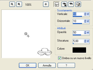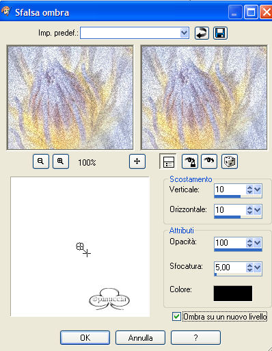 4. Selezione>Nessuna selezione. 5. Effetti>Effetti 3D>Sfalsa ombra, con questi settaggi, Ombra su un nuovo livello selezionato.