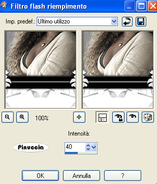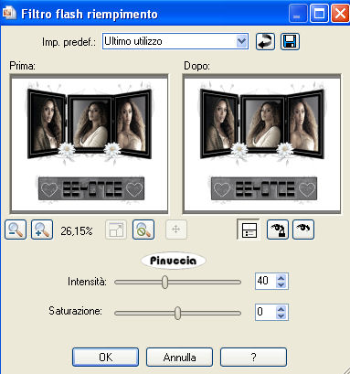 qui puoi trovare qualche risposta ai tuoi dubbi. Se l'argomento che ti interessa non è presente, ti prego di segnalarmelo. Le cornici sono una creazione di http://www.ccountry.net/~gmimlost/JosDZigns.html JosDZigns Questo tutorial è nato da una richiesta di Eliene, per questo è dedicato a lei. E' stato creato con PSP 9, ma può essere eseguito anche con le altre versioni di PSP. Nel tutorial c'è un passaggio che usa un filtro che non funziona con le versioni precedenti di PSP. Puoi continuare il tutorial, saltando questo passaggio. Occorrente: Materiale qui Filtro Flaming Pear - Kyoto Color qui Il fiore, il cuore di diamanti e le immagini di Beyonce vengono da gruppi yahoo; se sono vostre creazioni o conoscete gli autori, per favore, fatemelo sapere perchè possa dare credito ai creatori. 1. Apri il tuo materiale in PSP e minimizzalo tutto, tranne il tube delle cornici "Trifold frame set". Sul tube della cornice, nascondi tutti i livelli eccetto i livelli "right silver frame layer", "center silver frame layer" e "left silver frame". Attiva il livello "right silver frame" ![]() e vai a Modifica>Copia unione. Apri una nuova immagine trasparente 650 x 550 pixels. Modifica>Incolla>Incolla come nuovo livello. 2. Attiva lo strumento Bacchetta magica , con i seguenti settaggi:![]() 3. Clicca all'interno della prima cornice a sinistra per selezionarla. Selezione>modifica>Espandi, di 3 pixels. ![]() Livelli>Nuovo livello raster. Attiva l'immagine Beyonce1 e vai a Modifica>Copia. Torna alla tua tag e vai a Modifica>Incolla>Incolla nella selezione. Regola>Messa a fuoco>Metti a fuoco. Selezione>nessuna selezione. Livelli>Disponi>Sposta giù. 4. Attiva il livello della cornice e clicca sulla cornice al centro con la Bacchetta magica per selezionarla. Selezione>Modifica>Espandi, di 3 pixels. Livelli>Nuovo livello raster. Attiva l'immagica Beyonce2 e vai a Modifica>Copia. Torna al tuo lavoro e vai a Modifica>Incolla>Incolla nella selezione. Regola>Messa a fuoco>Metti a fuoco. Selezione>Nessuna selezione. Livelli>Disponi>Sposta giù. 5. Attiva nuovamente il livello della cornice e clicca all'interno della cornice a destra con la Bacchetta magica. Selezione>Modifica>Espandi, di 3 pixels. Livelli>Nuovo livello raster. Attiva l'immagine Beyonce3 e vai a Modifica>Copia. Torna al tuo lavoro e vai a Modifica>Incolla>Incolla nella selezione. Regola>Messa a fuoco>Metti a fuoco. Selezione>Nessuna selezione. Livelli>Disponi>Sposta giù. 6. Attiva il livello della cornice. Effetti>Effetti 3D>Sfalsa ombra, con i seguenti settaggi, colore nero: ![]() 7. Livelli>Unisci>Unisci visibile. Immagine>Ridimensiona, all'85%, bicubica, tutti i livelli non selezionato. ![]() Sposta la cornice in alto in modo che lo spazio trasparente sia tutto in basso.Livelli>Nuovo livello raster. Riempi il nuovo livello con il colore #FFFFFF.Livelli>Disponi>Porta sotto. 8. Attiva il tube beyoncetag_butterflybkg e vai a Modifica>Copia. Torna al tuo lavoro e vai a Modifica>Incolla>Incolla come nuovo livello. Sposta questo tube come mostrato nella schermata sotto.![]() 9. Livelli>Duplica (stai duplicando il livello Butterflybkg). Immagine>Rifletti. ![]() Attiva il tube daisy flower, e vai a Modifica>Copia. Torna al tuo lavoro e vai a Modifica>Incolla>Incolla come nuovo livello. Immagine>Ridimensiona. Ridimensiona l'immagine del fiore una volta al 55%, e due volte al 75%, bicubica, tutti i livelli non selezionato. Regola>Messa a fuoco>Metti a fuoco, se necessario. Effetti>Effetti 3D>Sfalsa ombra, con i settaggi usati al passo 6. Livelli>Duplica. Immagine>Rifletti. ![]() 10. Livelli>Nuovo livello raster. Attiva lo strumento Selezione , rettangolo, sfumatura 0,e clicca su Selezione personalizzata , con i seguenti settaggi:![]() 11. Riempi la selezione con il colore #000000.Selezione>Modifica>Contrai, di 2 pixels. ![]() Riempi la selezione con il colore #646770.Livelli>Nuovo livello raster. Attiva il tube "beyonce tag_rectangleoverlay" e vai a Modifica>copia. Torna al tuo lavoro e vai a Modifica>Incolla>Incolla nella selezione. Cambia la modalità di miscelatura di questo livello in Filtra, e abbassa l'opacità al 52%. Selezione>Nessuna selezione. Livelli>Unisci>Unisci giù. Effetti>Effetti 3D>Sfalsa ombra, con i settaggi usati al passo 6. 12. Attiva il tube "beyoncetag_minioverlay" e vai a Modifica>Copia. Torna al tuo lavoro e vai a Modifica>Incolla>Incolla come nuovo livello. Porta questo livello sotto il livello del rettangolo. Attiva il tube "Diamond Heart" e vai a Modifica>Copia. Torna al tuo lavoro e vai a Modifica>Incolla>Incolla come nuovo livello. Sposta questo tube sul lato destro del rettangolo (vedi l'esempio finale).Livelli>Duplica. Immagine>Rifletti. 13. Attiva il tube "beyoncetag_text" e vai a Modifica>Copia. Torna al tuo lavoro e vai a Modifica>Incolla>Incolla come nuovo livello. Posiziona il testo tra i cuori nel rettangolo (vedi l'esempio finale).(se vuoi, nel rettangolo puoi scrivere un testo a tua scelta). 14. Livelli>Unisci>Unisci visibile. Il prossimo passaggio è opzionale (soltanto il passo 14). Effetti>Plugins>Filters - Flaming Pear - Kyoto Color, con i seguenti settaggi: ![]() 15. Regola>Luminosità e contrasto>Luminosità e contrasto, con i seguenti settaggi: ![]() 16. Regola>Correzione fotografica>Flash riempimento, intensità 40: ![]() Se stai usando PSP X: Regola>Flash riempimento: ![]() imposta l'intensità a 40 e lascia la saturazione a 0: ![]() 17. Aggiungi il tuo nome e/o il tuo watermark. Livelli>Unisci>Unisci tutto (appiattisci). Attiva lo strumento Ritaglio e ritaglia lo spazio in eccesso intorno alla tagRidimensiona, se necessario, e salva nel formato che preferisci. Ecco il risultato senza il passo 14. ![]() ![]() Se hai problemi o dubbi, o trovi un link non funzionante, o anche soltanto per un saluto, scrivimi 14 Agosto 2007 |