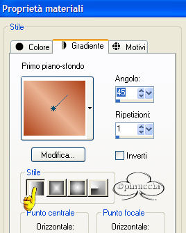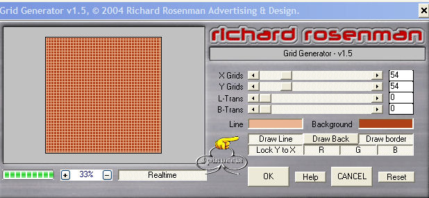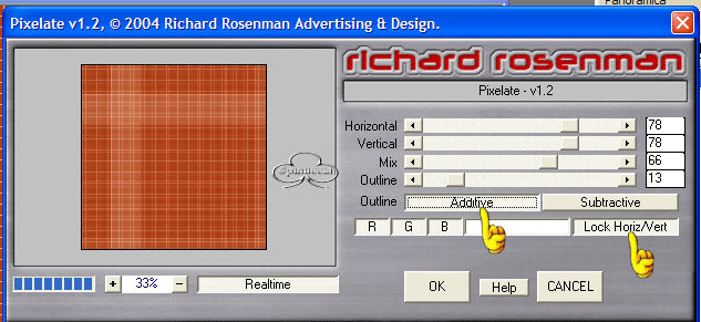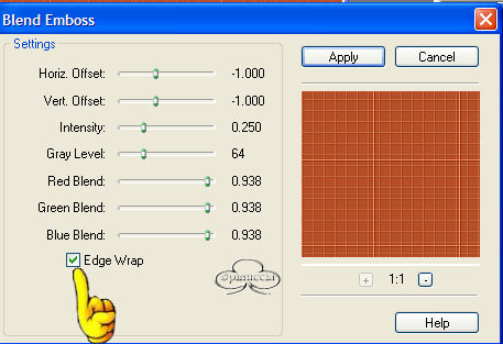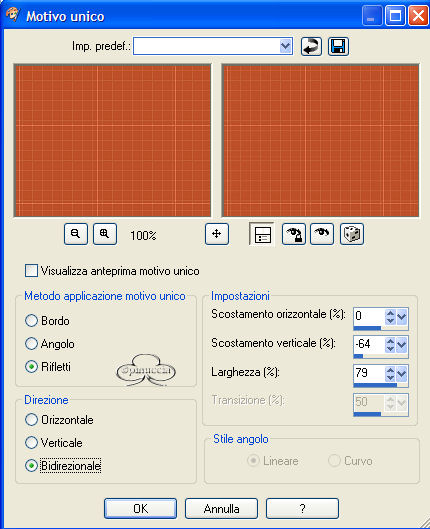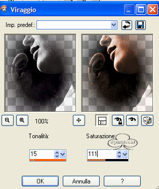 qui puoi trovare qualche risposta ai tuoi dubbi. Se l'argomento che ti interessa non è presente, ti prego di segnalarmelo. Questo tutorial è stato creato con PSP versione 8. Per tradurlo, l'ho eseguito con la versione 9. Occorrente: Paint Shop Pro. Filtri: Richard Rosenman's Grid Generator qui Richard Rosenman's Pixelate qui FM Tile Tools - Blend Emboss qui Materiale qui Font a scelta. 1. Apri i tubes in PSP e minimizzali per il momento. Apri una nuova immagine trasparente 500 x 500 pixels. Scegli due colori dal tuo tube principale (quello della donna). Seleziona un colore scuro per il primo piano io ho usato #AE4118, e un colore medio chiaro per lo sfondo io ho usato #EBB493. 2. Riempi l'immagine con il colore scuro di primo piano.Effetti>PluginS>Richard Rosenman/Grid Generator, usando i seguenti settaggi: ![]() 3. Effetti>Plugins>Richard Rosenman/Pixelate, usando i seguenti settaggi: ![]() APPLICA QUESTO FILTRO DUE VOLTE! Regola>Messa a fuoco>Metti a fuoco. 4. Effetti>Effetti di immagine>Motivo unico, usando i seguenti settaggi: ![]() 5. Effetti>Plugins>FM Tile Tools/Blend Emboss, usando i settaggi standard. ![]() 6. Apri il tube Misted Roses e vai a Modifica>Copia. Adesso puoi chiudere il tube. Torna al tuo lavoro e vai a Modifica>Incolla>Incolla come nuovo livello. Spostalo in basso sul lato sinistro.Nella paletta dei livelli cambia la modalità di miscelatura in Luce diffusa. 7. Apri il tuber Lady's Profile tube e vai a Modifica>copia. Adesso puoi chiuderlo. Torna al tuo lavoro e vai a Modifica>Incolla>Incolla come nuovo livello. Immagine>Ridimensiona dell'85% per un totale di due volte: bicubica e tutti i livelli non selezionato: ![]() Sposta l'immagine sul lato destro (vedi tag finale come esempio).8. Regola>Morbidezza>Fuoco diffuso, usando i seguenti settaggi: NOTA: Se stai usando una versione di PSP che non ha il Fuoco diffuso, puoi usare il filtro Xero>Porcelain per dare al tube un effetto morbido. ![]() 9. Apri il tube della coppia e vai a Modifica>Copia. Adesso puoi chiudere il tube. Torna al tuo lavoro e vai a Modifica>Incolla>Incolla come nuovo livello. Regola>Saturazione e tonalità>Viraggio, usando i seguenti settaggi: ![]() 10. Regola>Morbidezza>Fuoco diffuso con i settaggi usati al passo 8. Sposta il tube sull'angolo superiore sinistro (vedi tag finale come esempio).Nella paletta dei livelli cambia la modalità di miscelatura in Luce diffusa e abbassa l'opacità al 70%. 11. Apri il file di testo bittersweet memories e vai a Modifica>Copia. Puoi chiudere il tube adesso. Ritorna al tuo lavoro e vai a Modifica>Incolla>Incolla come nuovo livello. Immagine>Ridimensiona questo tube all'85% o una dimensione a tua scelta. Nella paletta dei livelli cambia la modalità di miscelatura in Filtra e abbassa l'opacità tra il 70 e il 75%, Posiziona il testo come mostrato nella tag finale o nella posizione che preferisci.12. Livelli>Nuovo livello raster. Riempi questo livello con il colore #87280F.Selezione>Seleziona tutto. Selezione>Modifica>Contrai - 2 pixels. ![]() Sulla tastiera premi il tasto CANC. Selezione>Nessuna selezione. Livelli>Unisci>Unisci tutto (appiattisci). 13. Attiva lo strumento Testo .Io ho usato Scrap Cursive, con i seguenti settaggi: ![]() Imposta il colore di sfondo su gradiente, usando gli stessi colori scelti per il tutorial: ![]() Immagine>Ruota>Ruota per gradi, 90 gradi a sinistra ![]() e posiziona il testo sul lato sinistro della tag.Aggiungi il tube della farfalla. Scegli se duplicarla, ruotarla, ridimensionarla... Usala a tuo piacimento. Livelli>Unisci>Unisci tutto (Appiattisci). Se necessario, riduci la tag (Immagine>Ridimensiona...) e salva nel formato che preferisci. ![]() Se hai problemi o dubbi, o trovi un link non funzionante, o anche soltanto per un saluto, scrivimi. Maggio 2006 |
