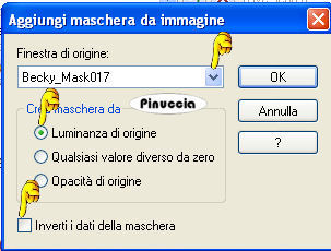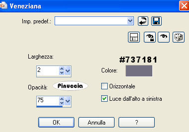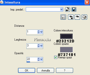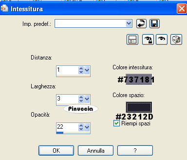 qui puoi trovare qualche risposta ai tuoi dubbi. Se l'argomento che ti interessa non è presente, ti prego di segnalarmelo. Questo tutorial è stato creato con PSP 9, ma può essere eseguito anche con le altre versioni di PSP. Occorrente: Materiale qui Il tube della donna è di Terry il tube Heart charm di Melissa; la maschera è di Becky (sito chiuso). Font Full Tilt Boogie 1. Apri tutto il materiale in PSP e minimizzalo nella tua area di lavoro. Imposta il colore di primo piano con #23212d, e il colore di sfondo con il bianco: #737181. 2. Apri una nuova immagine trasparente 500 x 560 pixels, e riempila con il colore di primo piano.Livelli>Nuovo livello raster>da immagine. Apri il menu sotto la finestra di origine e troverai tutti i files aperti in PSP. Seleziona la maschera Becky_Mask017, con i seguenti settaggi: ![]() 3. Livelli>Unisci>Unisci gruppo. Effetti>Effetti di trama>Veneziana, con i seguenti settaggi: ![]() 4. Effetti>Effetti 3D>Sfalsa ombra, con i seguenti settaggi, colore nero: ![]() 5. Livelli>Nuovo livello raster. Riempi questo livello con il colore di sfondo.ricorda che, per riempire con il colore di sfondo, devi cliccare con il tasto destro del mouse Livelli>Nuovo livello maschera>Da immagine. Seleziona nuovamente la maschera Becky_Mask017, con i settaggi usati al punto2. Livelli>Unisci>Unisci gruppo. Immagine>Ridimensiona, al 95%, tutti i livelli non selezionato, ricampionamento bicubica. ![]() 6. Effetti>Effetti di trama>Intessitura, con i seguenti settaggi. ![]() 7. Effetti>Effetti 3D>Sfalsa ombra, con i settaggi usati al punto 4. Io ho applicato l'Effetto Sfalsa ombra due volte. Immagine>Dimensione tela, 560 x 640, e clicca sulla freccia al centro. ![]() 8. Attiva il tube Terry_Just_A_Cowgirl, e vai a Modifica>copia. Torna al tuo lavoro e vai a Modifica>Incolla>Incolla come nuovo livello. Effetti>Effetti 3D>Sfalsa ombra, con i seguenti settaggi, colore nero ![]() Sposta il tube come nell'esempio finale.Attiva il tube SE_Charms_Heart, e vai a Modifica>Copia. Torna al tuo lavoro e vai a Modifica>Incolla>Incolla come nuovo livello. Immagine>Ridimensiona, al 50%, tutti i livelli non selezionato, bicubica. 9. Posiziona il tube con il cuore nell'angolo in alto a destra della forma.Effetti>Effetti 3D>Sfalsa ombra, con i settaggi usati al punto 4. Livelli>Nuovo livello raster. Riempi questo livello con il bianco #FFFFFF.Attiva checkedslats_overlay, e vai a Modifica>Copia. Torna al tuo lavoro e vai a Modifica>Incolla>Incolla come nuovo livello. Sposta l'immagine in alto, come mostrato nella schermata sotto:![]() 10. Aggiungi decorazioni o effetti pennello a tua scelta. Io ho aggiunto alcune stelle e alcuni pennelli di testo. Adesso è il momento di aggiungere un testo o il tuo nome alla tag. Questi i settaggi che ho usato per scrivere il mio nome. Font Full Tilt Boogie; dimensione 56, vettore, antialias, pennellata 1; colore di primo piano #737187; colore di sfondo #23212D. Dovrai regolare il settaggio della dimensione a seconda della lunghezza del testo e della versione di PSP che stai usando. Scrivi il testo e posizionalo come ti sembra meglio. 11. Livelli>Converti in livello raster. Effetti>Effetti di trama>Intessitura, con i settaggi precedenti, ma con i colori invertiti: ![]() Effetti>Effetti 3D>Sfalsa ombra, con i seguenti settaggi, colore nero. ![]() 12. Livelli>Unisci>Unisci tutto (appiattisci). Ritaglia lo spazio bianco in eccesso, ridimensiona se necessario, e salva nel formato che preferisci.![]() Se hai problemi o dubbi, o trovi un link non funzionante, o anche soltanto per un saluto, scrivimi 1 Gennaio 2008 |