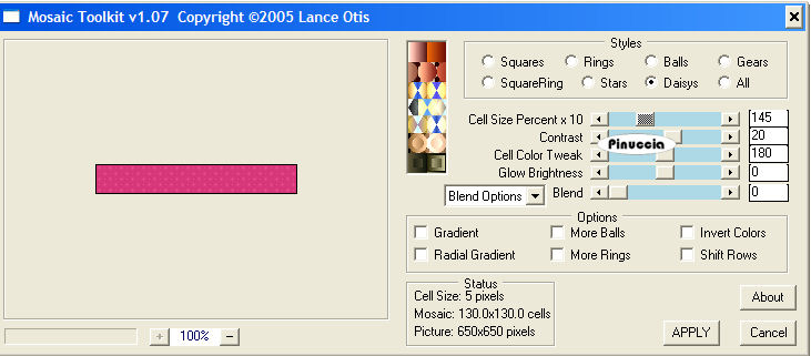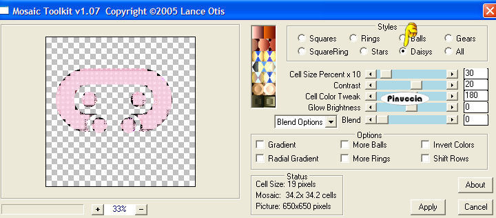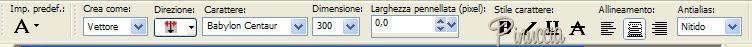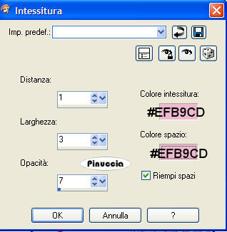 qui puoi trovare qualche risposta ai tuoi dubbi. Se l'argomento che ti interessa non è presente, ti prego di segnalarmelo. Questo tutorial è stato creato con PSP 9, ma può essere eseguito anche con le altre versioni di PSP. Occorrente: Materiale qui Pennelli e font a scelta. Babylon Centaur dingbat qui Filtro: Mosaic Toolkits qui 1. Apri tutto il tuo materiale in PSP e minimizzalo nella tua area di lavoro. Imposta il colore di primo piano con #C63064, e il colore di sfondo con #EFB9CD. Se stai usando un tube diverso da quello fornito con il materiale, seleziona dal tuo tube un colore scuro e un colore mediochiaro. 2. Apri una nuova immagine trasparente 650 x 650 pixels. Attiva lo strumento Testo , con i seguenti settaggi.![]() Chiudi il colore di primo piano. 3. Scrivi la lettera maiuscola K e clicca ok. Livelli>Converti in livello raster. Livelli>Duplica. Immagine>Rifletti. Sposta le due forme una contro l'altra, senza lasciare spazi al centro:![]() Livelli>Unisci>Unisci visibile. 4. Effetti>Plugins>Lotis Filter - Mosaic Toolkit, con i seguenti settaggi: ![]() 5. Immagine>Ridimensiona, al 90%, tutti i livelli non selezionato, ricampionamento bicubica. ![]() Effetti>Effetti 3D>Sfalsa ombra, con i seguenti settaggi, colore nero. ![]() Sposta la forma in alto, in modo da lasciare spazio per le catene e i cuori.6. Livelli>Nuovo livello raster. Attiva lo strumento Selezione , rettangolo, sfumatura 0,e disegna un sottile rettangolo tra i due cerchi all'interno della forma. Riempi la forma con il colore di primo piano.![]() 7. Effetti>Plugins>Lotis Filter - Mosaic Toolkit ![]() Selezione>Nessuna selezione. Effetti>Effetti 3D>Sfalsa ombra, con i seguenti settaggi, colore nero ![]() Livelli>Disponi>Sposta giù. 8. Attiva il livello superiore. Livelli>Nuovo livello raster. Attiva lo strumento Selezione , cerchio, sfumatura 0,e disegna un piccolo cerchio sopra uno dei cerchi che si trovano sotto la forma. Riempi la selezione con il colore di primo piano.![]() Effetti>Plugins>Mosaic Tookit, con i settaggi del passo 7. Selezione>Nessuna selezione. Effetti>Effetti 3D>Sfalsa ombra, con i settaggi usati al passo 7. ![]() Livelli>Duplica. Sposta il cerchio al centro dell'altro.![]() 9. Attiva il tube daisiesandchain_colored hearts, e vai a Modifica>Copia. Torna al tuo lavoro e vai a Modifica>Incolla>Incolla come nuovo livello. Posiziona i cuori in alto, al centro della forma, vedi l'esempio finale.Attiva il tube daisiesandchain_chain, e vai a Modifica>Copia. Torna al tuo lavoro e vai a Modifica>Incolla>Incolla come nuovo livello. Posiziona la catena in modo che sembri appena a uno dei cerchi inferiori.Nella paletta dei livelli, sposta il livello della catena sotto il livello della forma. Effetti>Effetti 3D>Sfalsa ombra, con i seguenti settaggi, colore nero. ![]() 10. Livelli>Duplica. Sposta la catena duplicata sotto il cerchio opposto.Attiva il tube daisiesandchain_single, e vai a Modifica>Copia. Torna al tuo lavoro e vai a Modifica>Incolla>Incolla come nuovo livello. Sposta il cuore in fondo alla catena,in modo che sembri appesa. Livelli>Duplica. Sposta questo duplicato nella catena opposta.11. Livelli>Nuovo livello raster. Riempi questo livello con il colore bianco.Livelli>Disponi>Porta sotto. Livelli>Nuovo livello raster. Attiva lo strumento Pennello ![]() e applica dei pennelli a scelta usando sia il colore di primo piano che il colore di sfondo. Quando hai finito di aggiungere i tuoi pennelli, chiudi il livello di sfondo bianco, posizionati su uno degli altri livelli e vai a Livelli>Unisci>Unisci visibile. Rendi nuovamente visibile il livello di sfondo, rimuovendo la x dall'occhio. 12. Sposta il livello uniti in alto a sinistra.Attiva il tube Kirsty06 e vai a Modifica>Copia. Torna al tuo lavoro e vai a Modifica>Incolla>Incolla come nuovo livello. Sposta il tube sul lato destro della tag.Effetti>Effetti 3D>Sfalsa ombra, con i seguenti settaggi, colore nero. ![]() 13. Aggiungi il tuo nome o un testo alla tag. Sotto i settaggi che ho usato per il mio testo: Font Pajama, dimensione 90, pennellata 2, vettore, antialias, colore di primo piano #EFB9CD; colore di sfondo #C63064. ![]() 14. Livelli>Converti in livello raster. Attiva lo strumento Bacchetta magica ![]() ![]() e seleziona l'interno delle lettere. se il tuo nome ha le "i" non dimenticare di selezionare anche i puntini. Effetti>Effetti di trama>Intessitura, con i seguenti settaggi: ![]() 15. Con il testo ancora selezionato: Effetti>Effetti 3D>Smusso a incasso, con i seguenti settaggi: ![]() Selezione>Nessuna selezione. 16. Effetti>Effetti 3D>Sfalsa ombra, con i seguenti settaggi, colore nero. ![]() 17. Posiziona il testo come nel mio esempio.Livelli>Unisci>Unisci tutto (appiattisci). Attiva lo strumento Ritaglio , ed elimina lo spazio bianco in eccesso.Ridimensiona, se necessario, la tua tag e salva nel formato che preferisci. ![]() I tubes che ho usato per gli esempi qui sotto sono di Jet e di Alejandra Rosales.