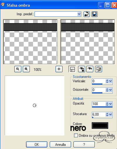 intorno alla parte di alfabeto che si trova sopra la striscia![]() e premi sulla tastiera una volta il tasto CANC. Selezione>Nessuna selezione. 13. Attiva il livello della striscia rettangolare. Effetti>Effetti 3D>Sfalsa ombra, con i seguenti settaggi, colore nero: ![]() 14. Livelli>Duplica, per duplicare il livello della striscia rettangolare. Immagine>Capovolgi. Livelli>Unisci>Unisci visibile. Apri il tube di testo "Ready for" e vai a Modifica>Copia; puoi chiudere il tube. Torna alla tua tag e vai a Modifica>Incolla>Incolla come nuovo livello. Sposta il testo tra il braccio e il corpo sul lato sinistro della tag.vedi come esempio la tag finale. 15. Apri il secondo tube di testo e vai a Modifica>Copia; puoi chiudere il tube adesso. Torna alla tua tag e vai a Modifica>Incolla>Incolla come nuovo livello. Posiziona questo testo sotto il braccio della bionda vicino al fondo della tag sul lato sinistro.vedi come esempio la tag finale. 16. Livelli>Unisci>Unisci tutto (appiattisci). Regola>Luminosità e contrasto>Nitidezza, settando a 2. ![]() Immagine>Aggiungi bordatura, 2 pixels, simmetriche, con il colore #101010. Aggiungi qualsiasi altro testo tu voglia e unisci tutti i livelli (appiattisci). Ridimensiona, se necessario e salva nel formato che preferisci. Per la firma ho usato il font Nebullium, dimensione 48. Ecco altri esempi: ![]() ![]() ![]() Se hai problemi o dubbi, o trovi un link non funzionante, o anche soltanto per un saluto, scrivimi. Luglio 2006 |