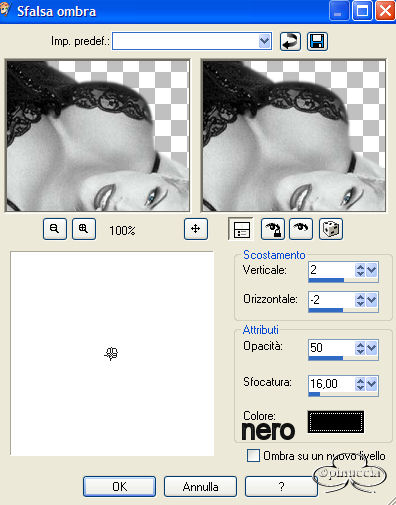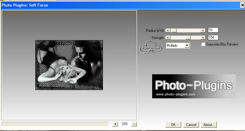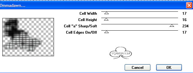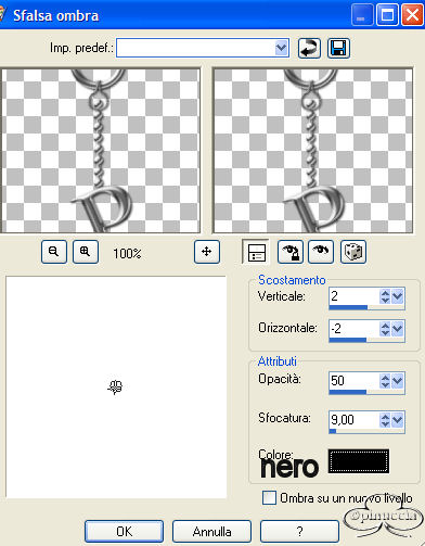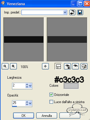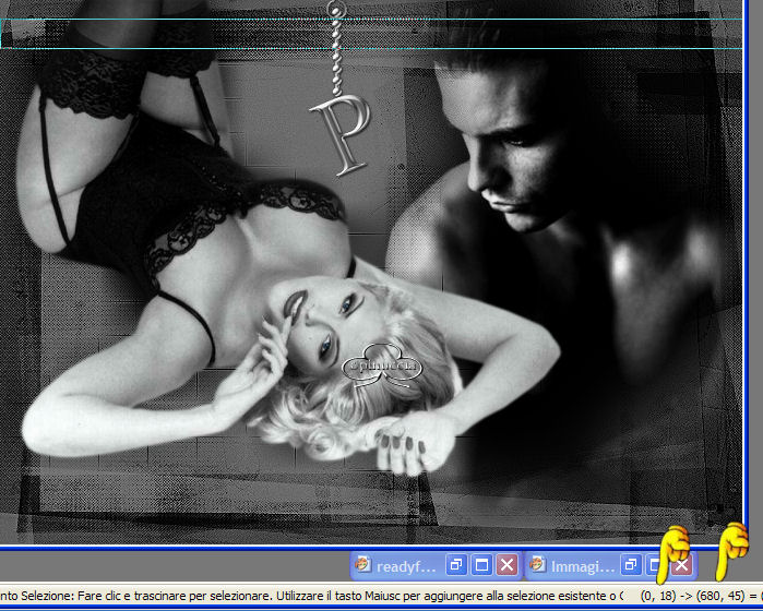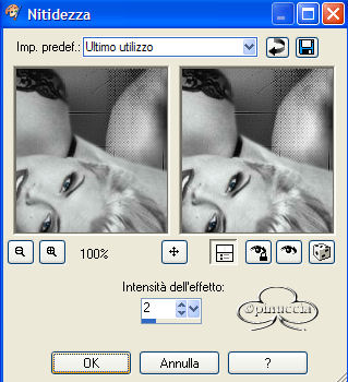 qui puoi trovare qualche risposta ai tuoi dubbi. Se l'argomento che ti interessa non è presente, ti prego di segnalarmelo. I tubes della bionda e dell'uomo sono di Sassy Illusions L'alfabeto a ciondolo è di Katzerl; lo puoi trovare http://www.dozibaer.com/eigenesweb5-scrap/alphas2/katzerl's-alphas2-page-04.htm qui I tubes di testo "Hugs kisses" e "hot sex" sono stati creati usando un pennello di Lexalicious. Questo tutorial è stato creato usando la versione 8 di PSP. Per tradurlo ho usato la versione 9. Occorrente: Filtro Factory V qui Toadies - Ommadawn qui Filtro Photo-Plugins - Soft Focus qui Tubes qui Font a scelta. 1. Apri i tubes e la trama in PSP; per il momento minimizzali nella tua area di lavoro. Imposta il colore di primo piano con #101010 e il colore di sfondo con #C3C3C3. Apri una nuova immagine trasparente 680 x 500 pixels. 2. Riempi l'immagine con il colore di primo piano.Livelli>Nuovo livello raster. Selezione>Seleziona tutto. Apri la trama Vered_textura 38 e vai a Modifica>Copia; puoi chiuderla adesso. Ritorna alla tua tag e vai a Modifica>Incolla>Incolla nella selezione. Selezione>Nessuna selezione. Nella paletta dei livelli cambia la modalità di miscelatura in Luminanza (esistente) e abbassa l'opacità al 60%. Livelli>Unisci>Unisci visibile. Effetti>Effetti di bordo>Aumenta. 3. Apri il tube sassyillusions_hunk11 e vai a Modifica>Copia; puoi chiudere il tube. Ritorna alla tua immagine e vai a Modifica>Incolla>Incolla come nuovo livello. Sposta il tube sul lato destro della tag.Vedi come esempio la tag finale. 4. Apri il tube sassyillusions_blonde12 e vai a Modifica>Copia; puoi chiudere il tube. Ritorna alla tua tag e vai a Modifica>Incolla>Incolla come nuovo livello. Sposta il tube sul lato sinistro.Vedi come esempio la schermata sotto: ![]() 5. Duplica il tube della bionda (Livelli>Duplica). Nascondi il livello duplicato e attiva il livello originale del tube. Effetti>Plugins>Filter Factory V / Omnadawn, con i seguenti settaggi: (se usi Omnadawn nel filtro Toadies, i settaggi sono gli stessi). ![]() 6. Effetti>Effetti di bordo>Aumenta. Nella paletta dei livelli cambia la modalità di miscelatura di questo livello (Omnadawn) in Moltiplica. Rimuovi la X dal livello duplicato e seleziona questo livello. Effetti>Effetti 3D>Sfalsa ombra, con i seguenti settaggi, colore nero: ![]() 7. Livelli>Unisci>Unisci visibile. Effetti>Plugins>Photo-Plugins / Soft Focus, con i seguenti settaggi: ![]() 8. Apri il tube "dangling alpha" e seleziona la lettera che vuoi usare nella tua tag. Attiva lo strumento Selezione ![]() e traccia un rettangolo intorno alla lettera che vuoi usare. Quindi vai a Modifica>Copia. Puoi chiudere adesso il tube dell'alfabeto. Torna alla tua tag e vai a Modifica>Incolla>Incolla come nuovo livello. Ridimensiona (Immagine>Ridimensione) la lettera una volta del 50% e una volta dell'80%. tutti i livelli non selezionato, tipo di ricampionamento bicubica. ![]() 9. Posiziona il tube dell'alfabeto come si vede nella schermata sotto.![]() Effetti>Effetti 3D>Sfalsa ombra, con i seguenti settaggi, colore nero: ![]() Regola>Messa a fuoco>Metti a fuoco. 10. Livelli>Nuovo livello raster. Attiva lo strumento Selezione (rettangolo, sfumatura 0),partendo da 0,18 traccia un rettangolo attraverso la tag fino a 680,45. ![]() Riempi questa selezione con il colore di primo piano.Selezione>Modifica>Contrai di 2 pixels. Effetti>Effetti di trama>Veneziana, con i seguenti settaggi: ![]() Mantieni selezionato. 11. Ripeti l'Effetto Veneziana, usando gli stessi settaggi del passo 10, ma selezionando Luce dall'alto da sinistra, anzichè Orizzontale. Selezione>Nessuna selezione. Muovi la striscia rettangolare che hai appena fatto 4-5 pixels più in alto. Guarda la parte del tube dell'alfabeto che si vede sopra la striscia; dovrai cancellare questa parte. ![]() 12. Assicurati che sia attivo il livello dell'alfabeto. Usando lo strumento Selezione traccia un rettangolo