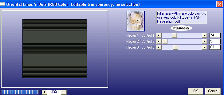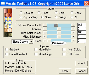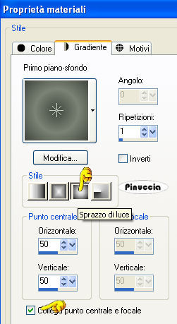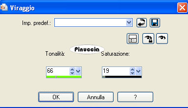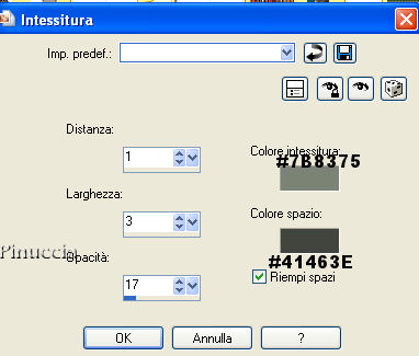 qui puoi trovare qualche risposta ai tuoi dubbi. Se l'argomento che ti interessa non è presente, ti prego di segnalarmelo. Questo tutorial è stato creato con PSP 9, ma può essere eseguito anche con le altre versioni di PSP. Occorrente: Materiale qui La cornice qui http://www.dozibaer.com/eigenesweb5-scrap/fur'n'leather/furNleather-04-Lfr.htm (la quarta cornice dall'alto della pagina). Il tube della donna è di Terry; la cornice è di Dozi; la targhetta e il bottone di Melissa Rispettate il lavoro degli autori, non cambiare il nome dei files e non cancellate il livello del watermark. Filtri: FM Tile Tools qui Bordermania qui Mosaic Toolkit qui vedi gli appunti su questo filtro qui Backgroundmaniac qui vedi gli appunti su questo filtro qui 1. Apri tutto il materiale in PSP e minimizzalo nella tua area di lavoro. Imposta il colore di primo piano con #41463E, e il colore di sfondo con #7B8375. Passa il colore di sfondo a Gradiente, con i seguenti settaggi: ![]() 2. Apri una nuova immagine trasparente 500 x 450 pixels, e riempila con il gradiente.ricorda che il gradiente è impostato come colore di sfondo, quindi per riempire devi cliccare con il tasto destro del mouse. Effetti>Plugins>Lotis Filters - Mosaic Toolkit, con i seguenti settaggi: ![]() 3. Effetti>Effetti di bordo>Aumenta. Effetti>Plugins>FM Tile Tools - Blend Emboss, con i settaggi standard. ![]() 4. Effetti>Plugins>Bordermania - Frame #2, con i seguenti settaggi: ![]() 5. Immagine>Dimensioni tela, e cambia la larghezza a 625 e l'altezza a 575 pixels, poi clicca sulla freccia al centro. ![]() 6. Effetti>effetti 3D>Sfalsa ombra, con i seguenti settaggi, colore nero. ![]() 7. Livelli>Nuovo livello raster. Riempi questo livello con il colore di primo piano.Livelli>Disponi>Porta sotto. Effetti>effetti di trama>Veneziana, con i seguenti settaggi, colore nero: ![]() 8. Effetti>Plugins>Background Maniac - Oriental Lines 's Dots, con i seguenti settaggi. ![]() 9. Nella paletta dei livelli deve essere attivo il livello scuro di sfondo. ![]() Selezione>Seleziona tutto. Selezione>modifica>Contrai, di 20 pixels. Premi sulla tastiera il tasto CANC ![]() Livelli>Nuovo livello raster. Riempi questo livello con il colore di sfondo.Effetti>Effetti di trama>Intessitura, con i seguenti settaggi, colore intessitura #7B8375, colore spazio #41463E: ![]() Mantieni selezionato. 10. Livelli>Nuovo livello raster. Riempi questo livello con il colore di primo piano.Selezione>Modifica>Contrai, di 2 pixels. Premi sulla tastiera il tasto canc .Selezione>Nessuna selezione. Livelli>Unisci>Unisci giù. Effetti>effetti 3D>Sfalsa ombra, con i settaggi usati al punto 6. ![]() 11. Posizionati sul livello superiore. Attiva il tube Terry_Marika, e vai a Modifica>copia. Torna al tuo lavoro e vai a Modifica>Incolla>Incolla come nuovo livello. Immagine>Ridimensiona, al 115%, tutti i livelli non selezionato, ricampionamento bicubica. ![]() Sposta il tube come nella tag finale.Effetti>Effetti 3D>Sfalsa ombra, con gli stessi settaggi del punto 6. (Io ho applicato l'Effetto Sfalsa ombra due volte). 12. Attiva SE_NaturalImpressions_Tag_3, e vai a Modifica>copia. Torna al tuo lavoro e vai a Modifica>Incolla>Incolla come nuovo livello. Immagine>Ridimensiona, al 50%, tutti i livelli non selezionato, bicubica. se con questo ridimensionamento, spariscono le cuciture sul lato destro della targhetta, annulla il passaggio con Modifica>Annulla azione Ridimensiona, e ripeti Immagine>Ridimensiona, al 70%, due volte. Regola>Saturazione e tonalità>Viraggio, con i seguenti settaggi. ![]() 13. Livelli>Duplica. Cambia la modalità di miscelatura del livello duplicato in Moltiplica. Chiudi tutti i livelli eccetto i due livelli della targhetta e vai a Livelli>Unisci>Unisci visibile. Rimuovi la X dai livelli nascosti, per renderli nuovamente visibili. Immagine>Ruota>Ruota per gradi, 20 gradi a sinistra. ![]() Effetti>Effetti 3D>Sfalsa ombra, con i settaggi usati al punto 6. Sposta la targhetta nell'angolo in alto a sinistra.![]() 14. Attiva SE_Always_Button_2, e vai a Modifica>copia. Torna al tuo lavoro e vai a Modifica>Incolla>Incolla come nuovo livello. Immagine>Ridimensiona, una volta al 35%, e una volta al 65%, tutti i livelli non selezionato, bicubica. Regola>Saturazione e tonalità>Viraggio, con i settaggi precedenti. Sposta il bottone sul nastro della targhetta (vedi l'esempio finale).Effetti>Effetti 3D>Sfalsa ombra, con i settaggi usati al punto 6, tranne la sfocatura a 5: ![]() Livelli>Duplica. Immagine>Rifletti. Livelli>Duplica. Immagine>Capovolgi. Livelli>Duplica. Immagine>Rifletti. 15. Attiva A-Dozi's Lea_Frame, e vai a Modifica>copia. Torna al tuo lavoro e vai a Modifica>Incolla>Incolla come nuovo livello. Immagine>Ridimensiona, 2 volte al 50%, tutti i livelli non selezionato, bicubica. Regola>Saturazione e tonalità>Viraggio, con i settaggi usati al punto 12. Sposta la cornice in alto a destra.Livelli>Duplica. Sposta la cornice in basso.non preoccuparti né della posizione né del fatto che non sono ruotate, sistemerai tutto più tardi ![]() 16. Attiva lo strumento Bacchetta magica , sfumatura e tolleranza 0,![]() e clicca all'interno della cornice in alto, per selezionarlo. Selezione>Modifica>Espandi, 2 pixels. Livelli>nuovo livello raster. Riempi questo livello con il colore di primo piano.Nella paletta dei livelli trascina questo livello sotto il livello della cornice. ![]() Mantieni selezionato. Attiva il tube "man1", e vai a Modifica>Copia. Torna al tuo lavoro e vai a Modifica>Incolla>Incolla come nuovo livello. Posiziona il tube dell'uomo all'interno della selezione.![]() Selezione>inverti. Premi sulla tastiera il tasto canc ![]() Questo livello dovrebbe trovarsi sotto il livello della cornice. 17. Attiva il livello della cornice. Effetti>Effetti 3D>Sfalsa ombra, con i settaggi usati al passo 14. ![]() Io ho applicato l'Effetto Sfalsa ombra due volte. Con il livello della cornice attivo vai a Livelli>Unisci>Unisci giù, per un totale di due volte. Questo unirà il livello 