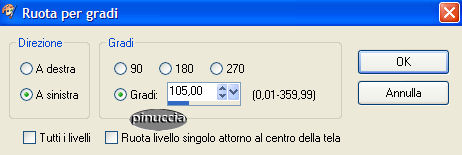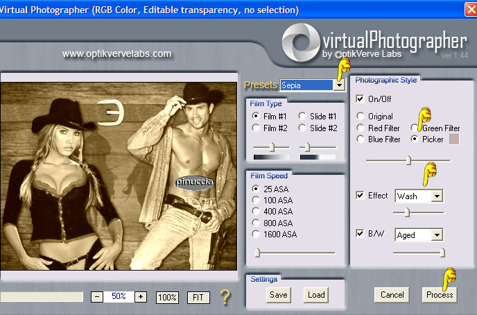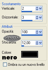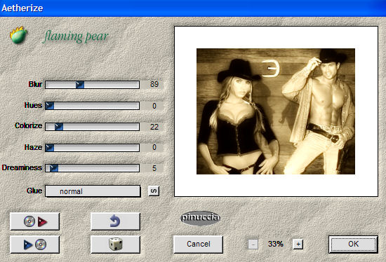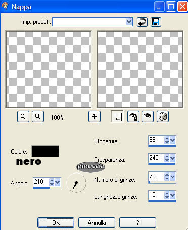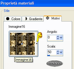 qui puoi trovare qualche risposta ai tuoi dubbi. Se l'argomento che ti interessa non è presente, ti prego di segnalarmelo. Questo tutorial è stato creato in PSP 9. Il tube della ragazza e dei cowboys a cavallo sono di Sassy Illusions il tube del cowboy è di LAP. Questo tutorial è stato dedicato da Bonnie a Maverick Queen. Occorrente: Materiale qui Filtri: Flaming Pear Aetherize OptikVerve Labs qui Trama: http://puzzle.digital-distortia.com/ qui: (clicca su Textures e scarica la Texture 09). Leather belt (cintura) http://www.dozibaer.com/eigenesweb5-scrap/fur'n'leather/furNleather-02-LE.htm qui Screws (vite) http://www.dozibaer.com/eigenesweb5-scrap/eyelets'screws/eyelets'screws'wascher-03.htm qui Font a scelta: io ho usato Pointedly Mad Per vostra comodità qui trovate trama, cintura, vite e font. qui puoi trovare qualche risposta ai tuoi dubbi. Se l'argomento che ti interessa non è presente, ti prego di segnalarmelo. 1. Apri i tubes e la trama in PSP e minimizzali per il momento nella tua area di lavoro. Imposta il colore di primo piano su #5D1B03 e il colore di sfondo su #E8B059. Passa il colore di primo piano a gradiente di primo piano/sfondo, con i seguenti settaggi: ![]() 2. Apri una nuova immagine trasparente 680 x 540 pixels. Riempila con il gradiente.Selezione>Seleziona tutto. Livelli>Nuovo livello raster. Apri Phoenix_texture09 e vai a Modifica>Copia. Torna al tuo lavoro e vai a Modifica>Incolla>Incolla nella selezione. Nella paletta dei livelli cambia la modalità di miscelatura in Luce diffusa. Mantieni selezionato. 3. Livelli>Nuovo livello raster. Apri la trama "Driftwood" e vai a Modifica>Copia. Torna al tuo lavoro e vai a Modifica>Incolla>Incolla nella selezione. Selezione>Nessuna selezione. Nella paletta dei livelli cambia la modalità di miscelatura di questo livello in Luce diffusa. 4. Livelli>Unisci>Unisci visibile. Effetti>Effetti di bordo>Aumenta. Apri il tube Sassyillusions_Montana Cowboys e vai a Modifica>Copia. Torna al tuo lavoro e vai a Modifica>Incolla>Incolla come nuovo livello. Nella paletta dei livelli cambia la modalità di miscelatura in Moltiplica e abbassa l'opacità di questo livello all'88%. 5. Apri il tube a-dozi's-kofferband01 tube. Seleziona il livello che ha la cintura con la fibbia. E' il livello "Merged" e vai a Modifica>copia. Torna al tuo lavoro e vai a Modifica>Incolla>Incolla come nuovo livello. Immagine>Ridimensiona: una volta del 65%, una volta del 90%, ricampionamento bicubica selezionato; tutti i livelli NON selezionato. ![]() Posiziona la cintura in alto (vedi schermata sotto):![]() 6. Apri il tube Sassyillusions_blonde47 e vai a Modifica>Copia. Torna al tuo lavoro e vai a Modifica>Incolla>Incolla come nuovo livello. Immagine>Rifletti. Sposta il tube a sinistra,assicurandoti che il bordo diritto del fondo del tube si appoggi al fondo della tag. ![]() 7. Effetti>Effetti 3D>Sfalsa ombra, con i seguenti settaggi, colore nero: ![]() 7. Effects/3D Effects/Drop Shadow using the settings shown below. 8. Apri il tube del cowboy e vai a Modifica>Copia. Torna al tuo lavoro e vai a Modifica>Incolla>Incolla come nuovo livello. Immagine>Ridimensiona, del 90%, ricampionamento bicubica selezionato; tutti i livelli non selezionato. ![]() Immagine>Rifletti. Spostalo sul lato destro della tag.Effetti>Effetti 3D>Sfalsa ombra, con i settaggi precedenti. A questo punto, ecco cosa dovresti avere: ![]() 9. Livelli>Unisci>Unisci visibile. Effetti>Plugins>OptikVerve Labs / Virtual Photographer, : clicca sulla freccia dei preset per aprire il menu e seleziona "Sepia" (cerca bene, perchè sono tanti e non sono in ordine alfabetico), dopo aver controllato le impostazioni clicca su "Process". ![]() 10. Effetti>Plugins>Flaming Pear / Aetherize, con i seguenti settaggi: ![]() 11. Apri il tube lookingforacowboytexttag e vai a Modifica>Copia. Torna al tuo lavoro e vai a Modifica>Incolla>Incolla come nuovo livello. Immagine>Ridimensiona, del 40%, ricampionamento bicubica selezionato; tutti i livelli non selezionato. Immagine>Ruota>Ruota per gradi, 105 gradi a sinistra. ![]() Regola>Messa a fuoco>Metti a fuoco. 12. Sposta la targhetta nell'angolo in alto a sinistra(vedi l'esempio della tag finale) o dove preferisci. Livelli>Unisci>Unisci visibile. Immagine>Aggiungi bordatura, 2 pixels, simmetriche, con il colore #110700. Immagine>Aggiungi bordatura, 25 pixels, simmetriche, con il colore #D1B67C. Seleziona il bordo con la Bacchetta magica , sfumatura e tolleranza 0.Effetti>Effetti di trama>Nappa, con i seguenti settaggi: ![]() Effetti>Effetti di bordo>Aumenta. selezione>Nessuna selezione. 13. Immagine>Aggiungi bordatura, 2 pixels, simmetriche, con il colore #110700. Apri a-dozi'sscrews-02 e seleziona una vite a scelta. Disegna una selezione (ti sarà più comodo usare l'opzione punto a punto) intorno alla vite che vuoi usare e vai a Modifica>Copia.![]() Torna al tuo lavoro e vai a Modifica>Incolla>Incolla come nuovo livello. Io l'ho ridimensionata del 60%, ricampionamento bicubica selezionato; tutti i livelli non selezionato. Comunque, il ridimensionamento più o meno dipenderà dalla vite che sceglierai. 14. Sposta la vite nell'angolo in alto a sinistra.(vedi come esempio la tag finale). Effetti>Effetti 3D>Sfalsa ombra, con i seguenti settaggi, colore nero: ![]() 15. Livelli>Duplica. Immagine>Rifletti. Livelli>Duplica. Immagine>Capovolgi. Livelli>Duplica. Immagine>Rifletti. Adesso dovresti avere una vite per ogni angolo della tua tag. Livelli>Unisci>Unisci tutto (appiattisci). 16. Attiva lo strumento Testo , per aggiungere il tuo nome.Io ho usato il font Pointedly Mad, con i seguenti settaggi: ![]() (la dimensione, ovviamente, dipende dalla lunghezza del tuo nome). Ho impostato il colore di primo piano con #110700; e il colore di sfondo usando una parte della mia tag. Se vuoi fare lo stesso passa il colore di sfondo a Motivi. Apri il menu cliccando sul triangolino a fianco del box e vedrai, oltre ai Motivi di PSP, tutte le immagini che sono aperte nel programma in que