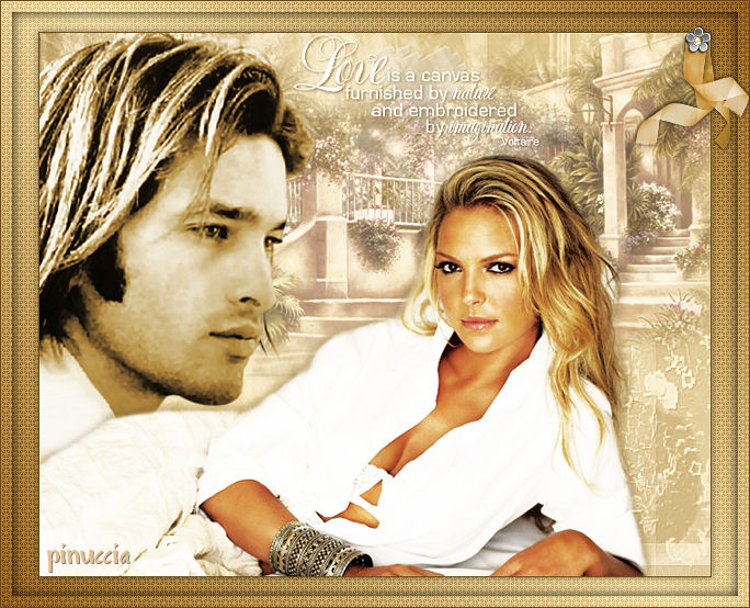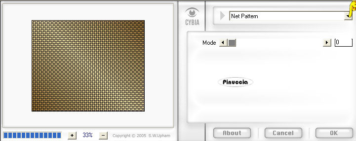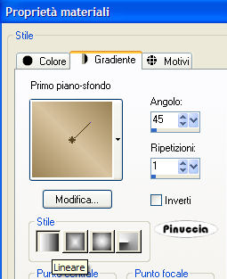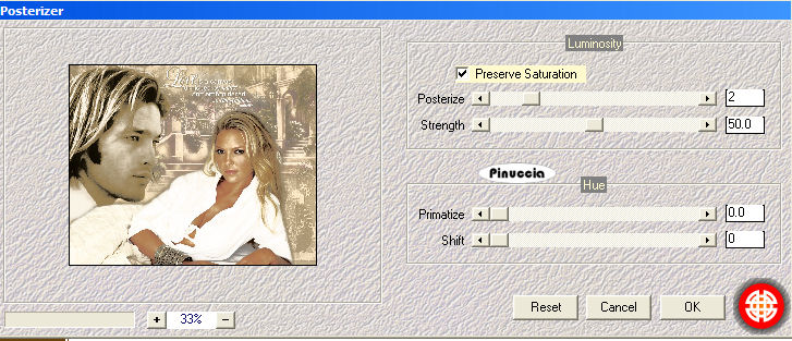 qui puoi trovare qualche risposta ai tuoi dubbi. Se l'argomento che ti interessa non è presente, ti prego di segnalarmelo. Questo tutorial è stato creato con PSP 9, ma può essere eseguito anche con le altre versioni di PSP. Occorrente: Materiale qui Il tube dell'uomo è di EmersonRose ; il tube della donna è di Paulina; il tube dell'edificio è di Gini; il tube Word art è di Melissa. Il nastro è di SOS: ricevuto attraverso un gruppo; se qualcuno conosce il nome dell'autore è pregato di farmelo sapere per dargli il giusto credito. Filtri: FM Tile Tools qui Cybia Screenworks qui Mehdi's Posterizer qui Font a scelta. 1. Apri tutto il materiale in PSP e minimizzalo nella tua area di lavoro. Imposta il colore di primo piano con #9A8254, e il colore di sfondo con #D9C4A1. Passa il colore di primo piano a Gradiente di primo piano/sfondo, stile lineare, con i seguenti settaggi. ![]() 2. Apri una nuova immagine trasparente 680 x 550 pixels. Selezione>Seleziona tutto. Attiva la trama "flowers" e vai a Modifica>Copia. Torna alla tua immagine trasparente e vai a Modifica>Incolla>Incolla nella selezione. Selezione>Nessuna selezione. Livelli>Nuovo livello raster. Riempi questo livello con il gradiente.Cambia la modalità di miscelatura di questo livello in Colore (esistente). Livelli>Unisci>Unisci visibile. Effetti>Plugins>FM Tile Tools - Blend Emboss, con i settaggi standard. ![]() 3. Attiva il tube HemingwayHouse, e vai a Modifica>Copia. Torna al tuo lavoro e vai a Modifica>Incolla>Incolla come nuovo livello. Spostalo in alto a destra, contro il bordo.![]() Abbassa l'opacità di questo livello al 68%. 4. Attiva il tube PD_Kayleigh, e vai a Modifica>Copia. Torna al tuo lavoro e vai a Modifica>Incolla>Incolla come nuovo livello. Sposta questo tube come nel mio esempio.Effetti>Effetti 3D>Sfalsa ombra, con i seguenti settaggi, colore #3A3120: ![]() 5. Attiva il tube OlivierMartinez, e vai a Modifica>Copia. Torna al tuo lavoro e vai a Modifica>Incolla>Incolla come nuovo livello. Immagine>Rifletti. Regola>Saturazione e tonalità>Viraggio: ![]() 6. Immagine>Ridimensiona, al 90%, bicubica, tutti i livelli non selezionato. ![]() Vedi quel bordo diritto in fondo al tube? Attiva lo strumento Selezione , rettangolo, (sfumatura 18),e traccia una selezione intorno al bordo del tube. Premi sulla tastiera una volta il tasto canc ![]() Posiziona questo tube nell'angolo in alto a sinistra, vedi il mio esempio.Abbassa l'opacità di questo livello al 78%. Nella paletta dei livelli trascina questo livello sotto il livello della donna. 7. Attiva il tube SE_Love e vai a Modifica>Copia. Torna al tuo lavoro e vai a Modifica>Incolla>Incolla come nuovo livello. Immagine>Ridimensiona, al 55%, bicubica, tutti i livelli non selezionato. Sposta questo tube in alto sopra il tube della donna, vedi il mio esempio.Effetti>Effetti di bordo>Traccia contorni. Effetti>Effetti 3D>Sfalsa ombra, con i seguenti settaggi, colore #3A3120. ![]() 8. Livelli>Unisci>Unisci visibile. Livelli>Duplica. Rimani posizionati sul livello duplicato, che deve essere il livello attivo. Effetti>Plugins>Mehdi>Posterizer, con i seguenti settaggi: ![]() 9. Cambia la modalità di miscelatura di questo livello (il duplicato) in Sovrapponi, e abbassa l'opacità all'80%. Livelli>Unisci>Unisci tutto (appiattisci). Immagine>Aggiungi bordatura, 1 pixel, simmetriche, con il colore #6C4919. Livelli>Innalza livello di sfondo. Immagine>Ridimensiona, al 90%, bicubica, tutti i livelli non selezionato. Effetti>Effetti 3D>Sfalsa ombra, con i seguenti settaggi, colore #3A3120. ![]() 10. Livelli>Nuovo livello raster. Livelli>Disponi>Porta sotto. Cambia il colore di primo piano con #9A7135, e il colore di sfondo con F0DDAB. Passa il colore di primo piano a Gradiente, lasciando i settaggi precedenti. Riempi il livello con questo gradiente.Livelli>Duplica. Sul livello duplicato del gradiente: Effetti>Plugins>Cybia - Screenworks, apri il menu cliccando sulla freccia del preset e seleziona Net Pattern: ![]() 11. Cambia la modalità di miscelatura di questo livello in Luce diffusa, e abbassa l'opacità al 78%. Livelli>Unisci>Unisci visibile. Livelli>Nuovo livello raster. Selezione>Seleziona tutto. Selezione>Modifica>Contrai, di 10 pixels. Effetti>Effetti 3D>Ritaglio, con i seguenti settaggi, colore nero. ![]() Selezione>Nessuna selezione. 12. Livelli>Unisci>Unisci tutto (appiattisci). Immagine>Aggiungi bordatura, 1 pixel, simmetriche, con il colore #6C4919. Attiva il tube SOScraps_Ribbons. Assicurati di essere posizionato sul livello superiore e vai a Modifica>Copia. Torna al tuo lavoro e vai a Modifica>Incolla>Incolla come nuovo livello. Immagine>Ridimensiona, al 55%, bicubica, tutti i livelli non selezionato. Immagine>Rifletti. Posiziona il nastro nell'angolo in alto a destra.Effetti>Effetti 3D>Sfalsa ombra, con i settaggi usati al punto 7. ![]() 13. Aggiungi il tuo watermark o un testo alla tag. Livelli>Unisci>Unisci tutto (appiattisci). Ridimensiona, se necessario, e salva nel formato che preferisci. ![]() Se hai problemi o dubbi, o trovi un link non funzionante, o anche soltanto per un saluto, scrivimi 7 Settembre 2007 |