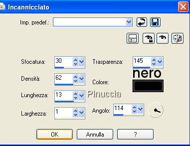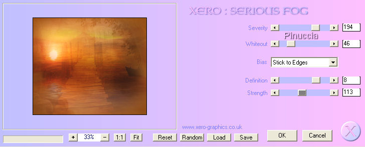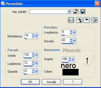 qui puoi trovare qualche risposta ai tuoi dubbi. Se l'argomento che ti interessa non è presente, ti prego di segnalarmelo. Questo tutorial è stato creato con PSP 9, ma può essere eseguito anche con le altre versioni di PSP. Occorrente: Materiale qui I tubes della coppia e della nave sono di Marcio C ; i tubes della cascata e del molo sono di Gina . Filtri: Xero - SoftMood e Serious Fog qui 1. Apri tutto il materiale in PSP e minimizzalo nella tua area di lavoro. Imposta il colore di primo piano con #844200, e il colore di sfondo con #DE9C42. Passa il colore di sfondo a Gradiente di primo piano/sfondo, stile sprazzo di luce, con i seguenti settaggi: ![]() 2. Apri una nuova immagine trasparente 680 x 580 pixels, e riempila con il gradiente.Livelli>Nuovo livello raster. Selezione>Seleziona tutto. Attiva il tube mc2846, e vai a Modifica>Copia. Torna al tuo lavoro e vai a Modifica>Incolla>Incolla nella selezione. Mantieni selezionato. 3. Livelli>Nuovo livello raster. Attiva il tube tsgina00565, e vai a Modifica>Copia. Torna al tuo lavoro e vai a Modifica>Incolla>Incolla nella selezione. Cambia la modalità di miscelatura di questo livello in Luce diffusa. Mantieni ancora selezionato. 4. Livelli>Nuovo livello raster. Attiva il tube tsgina00437, e vai a Modifica>Copia. Torna al tuo lavoro e vai a Modifica>Incolla>Incolla nella selezione. Cambia la modalità di miscelatura di questo livello in Luce Diffusa. Selezione>Nessuna selezione. Livelli>Unisci>Unisci visibile. Effetti>Plugins>Xero - Serious Fog, con i seguenti settaggi: ![]() 5. Regola>Luminosità e contrasto>Luminosità e contrasto, con i seguenti settaggi: ![]() 6. Attiva il tube mc2971, e vai a Modifica>Copia. Torna al tuo lavoro e vai a Modifica>Incolla come nuovo livello. Immagine>Ridimensiona, al 95%, tutti i livelli non selezionato, ricampionamento bicubica. ![]() Sposta questo tube sul lato sinistro della tag (vedi la tag finale).Regola>Saturazione e tonalità>Viraggio: ![]() 7. Livelli>Duplica. Cambia la modalità di miscelatura del livello duplicato in Sovrapponi, e abbassa l'opacità l'opacità al 68%. ![]() Livelli>Disponi>Sposta giù. Effetti>Plugins>Xero - SoftMood, con i seguenti settaggi: ![]() 8. Attiva il livello originale della coppia (il livello superiore). Effetti>Effetti 3D>Sfalsa ombra, con i seguenti settaggi, colore nero: ![]() 9. Livelli>Unisci>Unisci visibile. Modifica>Copia. Immagine>Aggiungi bordatura, 2 pixels, simmetriche, con il colore di primo piano (#844200). Immagine>Aggiungi bordatura, 30 pixels, simmetriche, con il colore #FFFFFF (bianco). Attiva lo strumento Bacchetta magica , tolleranza e sfumatura 0:![]() e clicca sul bordo bianco per selezionarlo. Modifica>Incolla>Incolla nella selezione. Effetti>Effetti tecniche di disegno>Pennellate, con i seguenti settaggi ![]() Mantieni selezionato. 10. Effetti>effetti di trama>Incannicciato, con i seguenti settaggi: ![]() Mantieni ancora selezionato. 11. Effetti>Effetti 3D>Ritaglio, con i seguenti settaggi: ![]() Selezione>Nessuna selezione. 12. Immagine>Aggiungi bordatura, 2 pixels, simmetriche, con il colore di primo piano (#844200). Attiva lovers_loveistext, e vai a Modifica>Copia. Torna al tuo lavoro e vai a Modifica>Incolla>Incolla come nuovo livello. Sposta il tube con il tseto nell'angolo in basso a destra.Aggiungi il tuo nome e/o il tuo watermark. Livelli>Unisci>Unisci tutto (appiattisci). Ridimensiona la tua tag, se necessario, e salva nel formato che preferisci. ![]() Se hai problemi o dubbi, o trovi un link non funzionante, o anche soltanto per un saluto, scrivimi 28 Ottobre 2007 |