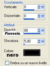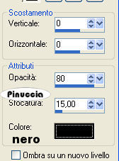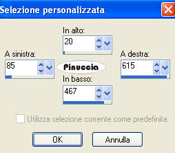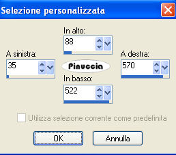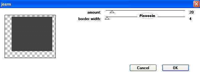 qui puoi trovare qualche risposta ai tuoi dubbi. Se l'argomento che ti interessa non è presente, ti prego di segnalarmelo. Questo tutorial è stato creato con PSP 9, ma può essere eseguito anche con le altre versioni di PSP. Occorrente: Materiale qui Il tube della donna è di Terry; il tube della coppia è di Crissydoll; la maschera è di Bonnie's Place. Per favore rispetta il lavoro degli autori e non cambiare il nome dei files. Filtro: Penta.com - Jeans qui 1. Apri tutto il materiale in PSP e minimizzalo nella tua area di lavoro. Imposta il colore di primo piano con #383838, e il colore di sfondo con il bianco: #FFFFFF. 2. Apri una nuova immagine trasparente 600 x 500 pixels, e riempila con il colore di primo piano.Livelli>nuovo livello raster. Riempi questo livello con il colore di sfondo.ricorda che, per riempire con il colore di sfondo, devi cliccare con il tasto destro del mouse. Livelli>Nuovo livello maschera>Da immagine. Apri il menu a tendina sotto la finestra di origine e troverai la lista di tutti i files presenti sul tuo PSP. Seleziona la maschera bbmask2, con i seguenti settaggi. ![]() 3. Livelli>Unisci>Unisci gruppo. Livelli>Unisci>Unisci visibile. Regola>Messa a fuoco>Metti a fuoco. Attiva il tube Us~Crissydoll~tubez, e vai a Modifica>Copia. Torna al tuo lavoro e vai a Modifica>Incolla>Incolla come nuovo livello. Regola>Saturazione e tonalità>Viraggio: ![]() 4. Immagine>Rifletti. Posiziona il tube sul lato destro della tag, facendo coincidere il bordo netto del tube con il bordo dell'immagine.Effetti>Effetti 3D>Sfalsa ombra, con i seguenti settaggi, colore nero. ![]() 5. Attiva il tube Terry_Unbelievable, e vai a Modifica>Copia. Torna al tuo lavoro e vai a Modifica>Incolla>Incolla come nuovo livello. Immagine>Ridimensiona, al 90%, tutti i livelli non selezionato, ricampionamento bicubica. ![]() Effetti>Effetti 3D>Sfalsa ombra, con i settaggi usati al punto 4. Sposta il tube sul lato sinistro della tag.![]() 6. Attiva lovethethings_overlay1, e vai a Modifica>Copia. Torna al tuo lavoro. Attiva il livello di sfondo e vai a Modifica>Incolla>Incolla come nuovo livello. Sposta l'immagine a sinistra, come nell'esempio sotto.![]() 7. Attiva lovethethings_lovetext, e vai a Modifica>Copia. Torna al tuo lavoro e vai a Modifica>Incolla>Incolla come nuovo livello. Sposta il testo al centro della tag, tra le immagini della donna e dell'uomo, vedi l'esempio finale.Immagine>Aggiungi bordatura, 2 pixels, simmetriche, con il colore #1D1D1D. Livelli>Innalza livello di sfondo. Immagine>Dimensione della tela e cambia la larghezza a 654 e l'altezza a 554 pixels, poi clicca sulla freccia al centro. ![]() 8. Immagine>Ridimensiona, al 90%, tutti i livelli non selezionato, bicubica. Effetti>Effetti 3D>Sfalsa ombra, con i seguenti settaggi, colore nero. ![]() Livelli>Nuovo livello raster. Attiva lo strumento Selezione , rettangolo, sfumatura 0,clicca sull'icona Selezione personalizzata ![]() e imposta i seguenti settaggi: ![]() 9. Riempi la selezione con il colore di primo piano.Selezione>Nessuna selezione. Effetti>Plugins>Penta.com - Jeans, con i seguenti settaggi: ![]() 10. Regola>Messa a fuoco>Metti a fuoco. Effetti>Effetti 3D>Sfalsa ombra, con i seguenti settaggi, colore nero. ![]() Livelli>Disponi>Porta sotto. Attiva il livello superiore nella paletta dei livelli. Livelli>Nuovo livello raster. Attiva nuovamente lo strumento Selezione personalizzata , con i seguenti settaggi:![]() 11. Imposta il colore di primo piano con #b3b7b6, e riempi la selezione con questo colore.Selezione>Nessuna selezione. Effetti>Plugins>Penta.com - Jean, con i settaggi precedenti. Regola>Messa a fuoco>Metti a fuoco. Effetti>Effetti 3D>Sfalsa ombra, con i settaggi usati al punto 10. ![]() Livelli>Disponi>Sposta giù. 12. Livelli>Unisci>Unisci visibile. Immagine>Ridimensiona, al 95%, tutti i livelli non selezionato, bicubica. Livelli>Duplica. Immagine>Ridimensiona, al 90%, tutti i livelli non selezionato, bicubica. Immagine>Ruota>Ruota per gradi, 15 gradi a destra. ![]() Livelli>Disponi>Sposta giù. Sposta le due immagini come nell'esempio finale.Fai attenzione che tutti gli angoli rimangano all'interno del perimetro, perchè se restano fuori dalla tag - quando più tardi ridimensionerai la tag - rimarranno tagliati. 13. Attiva SE_Always_Fabric tag, e vai a Modifica>copia. Torna al tuo lavoro e vai a Modifica>Incolla>Incolla come nuovo livello. Immagine>Ridimensiona, al 90%, tutti i livelli non selezionato, bicubica. Immagine>Ruota>Ruota per gradi, 15 gradi a sinistra. ![]() Regola>Messa a fuoco>Metti a fuoco. Effetti>Effetti 3D>sfalsa ombra, con i settaggi usati al punto 10. ![]() Posiziona la targhetta sull'angolo in alto a sinistra (vedi l'esempio finale).14. Attiva il tube "Screw", e vai a Modifica>Copia. Torna al tuo lavoro e vai a Modifica>Incolla>Incolla come nuovo livello. Immagine>Ridimensiona, al 70%, tutti i livelli non selezionato, bicubica. Posiziona la vite nell'angolo in alto a destra (vedi l'esempio finale).Livelli>Duplica, per un totale di due volte e posiziona le viti come nell'esempio finale, o dove preferisci.Livelli>Unisci>Unisci visibile. 15. Immagine>Ridimensiona, al 95%, tutti i livelli NON selezionato, bicubica. Livelli>Nuovo livello raster. Riempi il livello con il colore bianco (#ffffff).Attiva lovethethings_overlay2, e vai a Modifica>Copia. Torna al tuo lavoro e vai a Modifica>Incolla>Incolla come nuovo livello. 16. Aggiungi il tuo nome e/o il tuo watermark. Livelli>Unisci>Unisci tutto (appiattisci). Ritaglia lo spazio bianco in eccesso, ridimensiona se necessario, e salva nel formato che preferisci.![]() Se hai problemi o dubbi, o trovi un link non funzionante, o anche soltanto per un saluto, scrivimi 1 Gennaio 2008 |