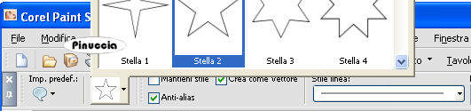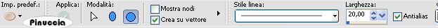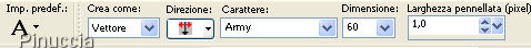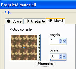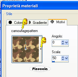 qui puoi trovare qualche risposta ai tuoi dubbi. Se l'argomento che ti interessa non è presente, ti prego di segnalarmelo. Questo tutorial è stato creato con PSP 9, ma può essere eseguito anche con le altre versioni di PSP. Occorrente: Materiale qui L'immagine di un soldato o di un vostro eroe (ho usato quella di mio figlio). Font qui Il tube della donna è di Laguna Azul 1. Apri tutto il materiale in PSP e minimizzalo nella tua area di lavoro. Imposta il colore di primo piano su Motivi. Apri il menu cliccando sulla freccia a fianco del box e seleziona il motivo Camouflage, con i seguenti settaggi. ![]() 2. Apri una nuova immagine BIANCA 640 x 640 pixels. Chiudi il colore di sfondo. Attiva lo strumento Forma Ellisse ![]() (per le versioni precedenti di PSP, Forme predefinite ),con i seguenti settaggi: modalità Cerchio; Vettore; Linea stile pieno, dimensione 20 pixels, antialias selezionato. ![]() 3. Tenendo premuto il tasto Shift (maiuscola), parti dall'angolo in alto a sinistra e traccia un cerchio di dimensioni medie. Oggetti>Allinea>Centra nella tela. ![]() Livelli>Converti in livello raster. Effetti>Effetti 3D>Sfalsa ombra, con i seguenti settaggi, colore nero: ![]() 4. Inverti i colori impostati, cliccando sulla freccia al centro delle due palette, per avere il Motivo impostato come colore di sfondo. Il colore di primo piano sarà sempre nullo. ![]() Attiva lo strumento Forme predefinite , e seleziona la Stella n. 2,crea come vettore, stile linea pieno: ![]() 5. Disegna una stella all'interno del cerchio. ![]() se necessario, usa i nodi della griglia vettoriale per adattare meglio la stella all'interno del cerchio Livelli>Converti in livello raster. Effetti>Effetti 3D>Sfalsa ombra, con i settaggi usati al punto 3. ![]() Attiva ribbon_2, e vai a Modifica>Copia. Torna al tuo lavoro e vai a Modifica>Incolla>Incolla come nuovo livello<. Immagine>Ridimensiona, all'85%, tutti i livelli non selezionato, ricampionamento bicubica. ![]() Regola>Saturazione e tonalità>Viraggio: ![]() 6. Regola>Luminosità e contrasto>Correzione Gamma, con i seguenti settaggi: ![]() in PSP X questo effetto è stato sostituito con Regola>Luminosità e contrasto>Regola con istogramma, e si utilizzano le impostazioni gamma nella finestra Regola con istogramma. Tuttavia, premendo sulla tastiera la combinazione di tasti shift (maiuscola) + G, apparirà la vecchia schermata delle versioni precedenti. 7. Sposta il nastro sopra la stella.![]() Effetti>Effetti 3D>Sfalsa ombra, con i settaggi usati al passo 3. Minimizza questa immagine per il momento. Apri una nuova immagine trasparente 155 x 175 pixels. Cambia i settaggi del motivo Camouflage portando la scala a 30. ![]() Riempi l'immagine trasparente con questo motivo.Selezione>Seleziona tutto. Selezione>Modifica>Contrai, di 7 pixels. Premi sulla tastiera il tasto CANC ![]() Mantieni selezionato. 8. Apri l'immagine che hai deciso di usare per la cornice e vai a Modifica>Copia. Torna alla cornice e vai a Modifica>Incolla>Incolla come nuovo livello. Ridimensiona, se necessario, e sistema nella selezione la parte dell'immagine che vuoi rimanga incorniciata. Selezione>Inverti. Premi sulla tastiera il tasto CANC ![]() Nella paletta dei livelli trascina questo livello sotto il livello della cornice. Attiva il livello della cornice. Effetti>Effetti 3D>Sfalsa ombra, con i seguenti settaggi, colore nero: ![]() Selezione>Nessuna selezione. Livelli>Unisci>Unisci visibile. 9. Modifica>Copia. Attiva il lavoro che hai messo da parte prima e vai a Modifica>Incolla>Incolla come nuovo livello. Effetti>Effetti 3D>Sfalsa ombra, con i settaggi usati al punto 8. Immagine>Ruota>Ruota per gradi, 15 gradi a destra. ![]() 10. Regola>Messa a fuoco>Metti a fuoco. Posiziona la cornice in basso a destra del cerchio (vedi il lavoro finale).Attiva "armytag_support our troops", e vai a Modifica>Copia. Torna al tuo lavoro e vai a Modifica>Incolla>Incolla come nuovo livello. Sposta il testo al centro della stella (vedi il lavoro finale).Attiva "armytag_tinyscrew" e vai a Modifica>Copia. Torna al tuo lavoro e vai a Modifica>Incolla>Incolla come nuovo livello. Sposta la vita nell'angolo in alto a sinistra della cornice.(vedi il lavoro finale). è così piccola che, forse, avrai difficoltà a vederla. Eventualmente, per poterla spostare più agevolmente, vai a Livelli>Visualizza>Solo corrente, sposta la vite in un punto fuori dalle immagini, Livelli>Visualizza>Tutto, e adesso potrai spostarla comodamente. 11. Chiudi il livello bianco di sfondo. Livelli>Unisci>Unisci visibile. Immagine>Ridimensiona, al 90%, tutti i livelli non selezionato, ricampionamento bicubica. Sposta la tag un po' più in alto e verso il lato destro dell'immagine.Attiva il tube la_woman_59, e vai a Modifica>Copia. Torna al tuo lavoro e vai a Modifica>Incolla>Incolla come nuovo livello. Immagine>Rifletti. Immagine>Ridimensiona, all'85%, tutti i livelli non selezionato, per un totale di 2 volte. Sposta questo tube sul lato sinistro della tag (vedi l'esempio finale).12. Effetti>Effetti 3D>Sfalsa ombra, con i seguenti settaggi, colore nero: ![]() 13. Attiva armytag_myhero text, e vaia Modifica>Copia. Torna al tuo lavoro e vai a Modifica>Incolla>Incolla come nuovo livello. Sposta il testo sotto l'immagine incorniciata.E' il momento di aggiungere il tuo nome alla tag. Questi i settaggi che ho usato per scrivere il mio nome. Font Armi; dimensione 60; Vettore, pennellata 1, antialias, colore di primo piano #D7BD84; colore di sfondo Motivo Camouflage: ![]() 14. Scrivi il tuo nome e posizionalo. Livelli>Converti in livello raster. Effetti>Effetti 3D>sfalsa ombra, con i seguenti settaggi, colore nero: ![]() Attiva il tube "Star", e vai a Modifica>copia. Torna al tuo lavoro e vai a Modifica>Incolla>Incolla come nuovo livello. Aggiungi le stelle dove preferisci. Io ho messo una stella ai lati del mio nome e sulla cornice. 15. Livelli>Unisci>Unisci tutto (appiattisci). Usa lo strumento Ritaglio per eliminare lo spazio bianco in eccesso.Ridimen