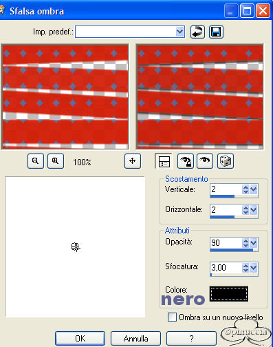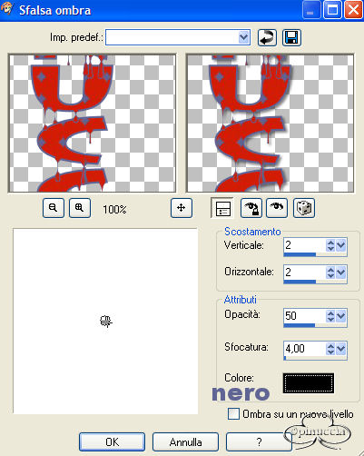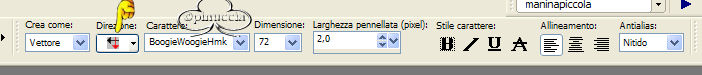 qui puoi trovare qualche risposta ai tuoi dubbi. Se l'argomento che ti interessa non è presente, ti prego di segnalarmelo. Un grande ringraziamento a Kattitude per aver permesso di usare i suoi tubes in questo tutorial (il suo sito è chiuso) Questo tutorial è stato creato usando la versione 8 di PSP, ma può essere eseguito anche con le altre versioni di PSP. Per tradurlo, l'ho eseguito con PSP 9. Occorrente: Materiale qui (se qualcuno conosce l'autore della maschera, è pregato di farmelo conoscere, così potrò dargli credito). Tube Kattitude Font a scelta. 1. Apri il tube, il pattern e la maschera in PSP; per il momento minimizzali nella tua area di lavoro. Imposta il colore di sfondo su Motivi e seleziona il Motivo Paint Tag (angolo 0, scala 100), fornito con il tutorial. ![]() Imposta il colore di primo piano con #606494. 2. Apri una nuova immagine trasparente 500 x 550 pixels. Riempi l'immagine con il Motivo impostato come colore di sfondo.Livelli>Nuovo livello maschera>Da immagine. Seleziona dalla finestra di origine la maschera Becky_Mask017, luminanza di origine selezionato, inverti i dati della maschera non selezionato. ![]() 3. Livelli>Unisci>Unisci gruppo. Effetti>Effetti 3D>Sfalsa ombra, con i seguenti settaggi, colore nero: ![]() 4. Livelli>Nuovo livello raster. Riempi questo livello con il colore di primo piano.Livelli>Nuovo livello maschera>Da immagine. Ancora una volta seleziona la maschera Becky_Mask017, luminanza di origine selezionato, inverti i dati della maschera non selezionato. 5. Livelli>Unisci>Unisci gruppo. Immagine>Rifletti. Effetti>Effetti 3D>Sfalsa ombra, con gli stessi settaggi del passo 3. Regola>Messa a fuoco>Metti a fuoco. Immagine>Ridimensiona, 80%, tutti i livelli non selezionato, tipo di ricampionamento bicubico. ![]() 6. Apri il tube Kattitudine_Kittlen e vai a Modifica>copia; puoi chiudere il tube adesso. Ritorna alla tua tag e vai a Modifica>Incolla>Incolla come nuovo livello. Effetti>Effetti 3D>Sfalsa ombra, con gli stessi settaggi del passo 3, eccetto la sfocatura a 10. ![]() Livelli>Unisci>Unisci visibile. 7. Adesso dovrai creare del testo extra per il testo. Immagine>Dimensione tela. Cambia la larghezza a 550 e clicca sulla freccia destra al centro per impostare lo spazio tutto a sinistra. ![]() 8. I colori di primo piano e sfondo devono essere gli stessi settati al passo 1. Un bel font "ciccione" sarà l'ideale per il tuo testo. Qui sotto i settaggi che ho usato io per il mio. ![]() 9. Imposta l'orientamento verticale e la crenatura a -360, per far sì che ci sia meno spazio fra le lettere. Usa i nodi vettori intorno al testo per manipolarlo, Io ho fatto il mio un po' più largo e un po' più corto. Quando sei soddisfatto vai a Livelli>Converti in livello raster. 10. Posiziona il tuo testo sul lato sinistro della tag (vedi esempio finale). Livelli>Duplica. Nascondi il livello duplicato e attiva il livello originale del testo. Effetti>Plugins/Eye Candy 4000/Drip, con i seguenti settaggi: ![]() 11. Effetti>Effetti 3D>Sfalsa ombra, con i seguenti settaggi, colore nero: ![]() 12. Togli la X dal livello duplicato del testo e attiva questo livello e applica lo stesso Effetto Sfalsa ombra del passo 11. 13. Applica il copyright alla tag. Livelli>Unisci>Unisci visibile. Selezione>Seleziona tutto. Selezione>Mobile. Selezione>Immobilizza. Immagine>Ritaglia la selezione. 14. Livelli>Unisci>Unisci tutto (appiattisci). Ridimensiona se necessario e salva nel formato che preferisci. ![]() Se hai problemi o dubbi, o trovi un link non funzionante, o anche soltanto per un saluto, scrivimi. Luglio 2006 |