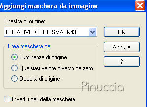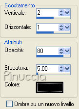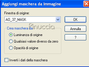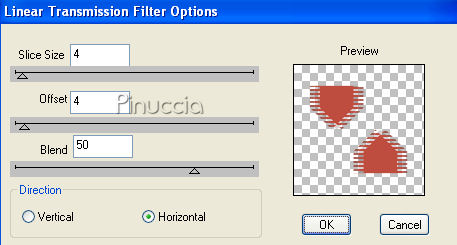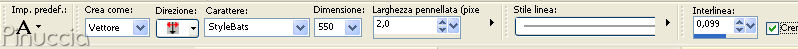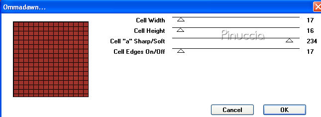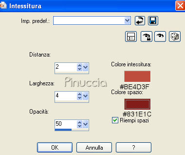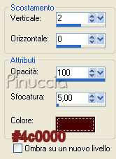 qui puoi trovare qualche risposta ai tuoi dubbi. Se l'argomento che ti interessa non è presente, ti prego di segnalarmelo. Questo tutorial è stato creato con PSP 9, ma può essere eseguito anche con le altre versioni di PSP. Occorrente: Un tube a scelta. Il resto del materiale qui Il tube della donna è di Terry Font Style Bats qui Filtri: Dsb Flux qui Toadies - Ommadawn qui 1. Apri le maschere in PSP e minimizzale nella tua area di lavoro. Le troverai nella lista delle maschere, quando ti serviranno. Apri il font e minimizzalo nella tua area di lavoro. Lo troverai nella lista dei font disponibili, quando ti servirà. Imposta il colore di primo piano con #831E1C, e il colore di sfondo con #BE4D3F. Apri una nuova immagine BIANCA 600 x 600 pixels. 2. Livelli>Nuovo livello raster. Riempi il livello con il colore di sfondo.ricorda che, per riempire con il colore di sfondo, devi cliccare con il tasto destro del mouse. Livelli>Nuovo livello raster. Riempi con il colore di primo piano.Livelli>Nuovo livello maschera>Da immagine, apri il menu sotto la finestra di origine e vedrai la lista dei files aperti in PSP. Seleziona la maschera A0_37_mask, luminanza di origine selezionato, inverti dati maschera non selezionato, e clicca OK. ![]() 3. Livelli>Unisci>Unisci gruppo. Livelli>Unisci>Unisci giù. Effetti>Effetti di bordo>Aumenta. Effetti>Plugins>Toadies - Ommadawn, con i seguenti settaggi: ![]() Effetti>Effetti di bordo>Aumenta. 4. Livelli>Nuovo livello maschera>Da immagine: dal menu sotto la finestra di origine seleziona la maschera Creative Desires Mask43 e clicca OK: ![]() 5. Livelli>Unisci>Unisci gruppo. Effetti>Effetti 3D>Sfalsa ombra, con i seguenti settaggi, colore #4c0000. ![]() Abbassa l'opacità di questo livello all'82%. 6. Attiva lo strumento Testo font Style Bats, con i seguenti settaggi:![]() se stai usando PSP X, dovrai regolare la dimensione, perchè nelle due versioni i pixels non corrispondono; più o meno il corrispondente settaggio dovrebbe essere intorno ai 740 pixels. 7. Clicca sulla tag con il tasto sinistro del mouse per far apparire il box del testo; scrivi il numero "5" e clicca Applica. Oggetti>Allinea>Centra nella tela. Livelli>converti in livello raster. Immagine>Dimensione tela, cambia larghezza e altezza a 650 e clicca sulla freccia al centro. ![]() 8. Attiva il livello del font. Livelli>Duplica. Posizionati sul livello originale del testo. Effetti>Plugins>DSB Flux - Linear Trasmission: ![]() 9. Effetti>Effetti 3D>Sfalsa ombra, con i settaggi usati al passo 5. Attiva il livello duplicato del testo. Effetti>Effetti di trama>Intessitura, con i seguenti settaggi, colore intessitura #BE4D3F; colore spazio #831E1C; riempi spazi selezionato. ![]() 10. Effetti>Effetti 3D>Sfalsa ombra, con i settaggi usati al passo 5. Attiva il tube che hai deciso di usare e vai a Modifica>copia. Torna al tuo lavoro e vai a Modifica>Incolla>Incolla come nuovo livello. Sposta il tube come mostrato nella schermata:![]() 11. Effetti>Effetti 3D>Sfalsa ombra, con i seguenti settaggi, colore nero: ![]() 12. Attiva il tube perfectioninred_ribbonheart, e vai a Modifica>Copia. Torna al tuo lavoro e vai a Modifica>Incolla>Incolla come nuovo livello. Sposta il tube sulla forma del testo in alto a sinistra, vedi l'esempio finale.Cambia la modalità di miscelatura di questo livello in Moltiplica. Attiva perfectioninred_text, e vai a Modifica>Copia. Torna al tuo lavoro e vai a Modifica>Incolla>Incolla come nuovo livello. Sposta il testo sopra il nastro, vedi l'esempio finale.Cambia la modalità di miscelatura di questo livello in Moltiplica. 13. Aggiungi il tuo nome alla tag. Questi i settaggi che ho usato per scrivere il mio nome. font Onyx Bt, dimensione 110; vettore, bold, antialias, pennellata 2; colore di primo piano piano #831E1C; colore di sfondo #BE4D3F. 14. Scrivi il tuo nome nel box del testo e clicca Applica. Immagine>Ruota>ruota per gradi, 90 gradi a sinistra: ![]() Posiziona il testo sotto la forma a sinistra, vedi il mio esempio. Livelli>Converti in livello raster. Effetti>Effetti di trama>Intessitura, con i settaggi precedenti. Effetti>Effetti 3D>Sfalsa ombra, con i seguenti settaggi, colore nero: ![]() 15. Opzionale: Livelli>Nuovo livello raster. Aggiungi alcuni effetti pennello. Nella paletta dei livelli trascina questo livello sopra il livello con il filtro ommadawn. Livelli>Unisci>Unisci tutto (appiattisci). Ritaglia lo spazio bianco in eccesso, ridimensiona se necessario, e salva nel formato che preferisci.![]() Se hai problemi o dubbi, o trovi un link non funzionante, o anche soltanto per un saluto, scrivimi 13 Febbraio 2008 |