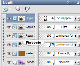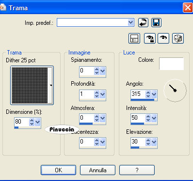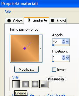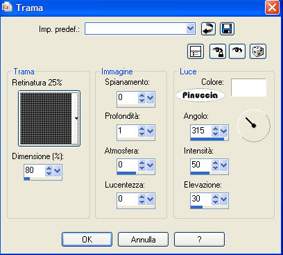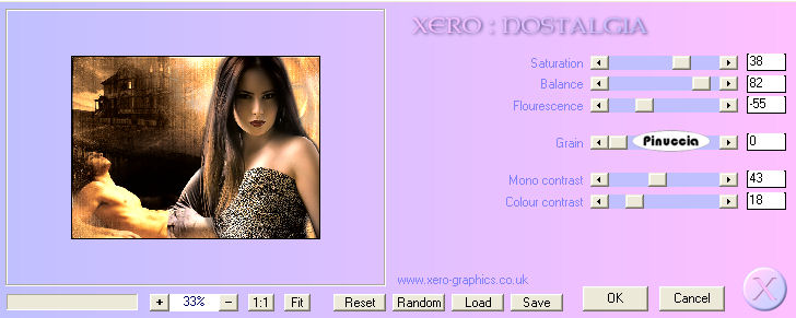 qui puoi trovare qualche risposta ai tuoi dubbi. Se l'argomento che ti interessa non è presente, ti prego di segnalarmelo. Questo tutorial è stato creato con PSP 9, ma può essere eseguito anche con le altre versioni di PSP. Materiale qui e qui Il tube della donna è di Terry il tube dell'uomo e della casa è di Monique. Filtro: Xero - Nostalgia qui 1. Apri tutto il materiale in PSP e minimizzalo nella tua area di lavoro. Metti la trama dither25 pct.bmp nella cartella Trame di PSP. Attiva Texture9. Duplicala con Shift+D, e chiudi l'originale, che potrai usare in altre occasioni. 2. Imposta il colore di primo piano con #965E2B, e il colore di sfondo con #391F08. Attiva la Trama Texture9, che sarà la base del tuo lavoro. Livelli>Nuovo livello raster. Riempi il nuovo livello con il colore di primo piano.Cambia la modalità di miscelatura di questo livello in Colore (esistente). 3. Attiva il tube Monique42_3190, e vai a Modifica>Copia. Torna al tuo lavoro e vai a Modifica>Incolla>Incolla come nuovo livello. Sposta questo tube nell'angolo in alto a sinistra.Cambia la modalità di miscelatura in Luminanza (Esistente), e abbassa l'opacità al 76%. 4. Attiva il tube Monique42_3179, e vai a Modifica>Copia. Torna al tuo lavoro e vai a Modifica>Incolla>Incolla come nuovo livello. Sposta questo tube, come nell'esempio.![]() Livelli>Duplica, per un totale di 2 volte. Posizionati sul livello del tube originale e cambia la modalità di miscelatura in Luminanza (Esistente). Posizionati sul livello della prima copia e cambia la modalità di miscelatura in Filtra. Posizionati sul livello della seconda copia e cambia la modalità di miscelatura in Sovrapponi, e abbassa l'opacità al 42%. ![]() 5. Attiva il tube Terry_Sensual+Stare, e vai a Modifica>Copia. Torna al tuo lavoro e vai a Modifica>Incolla>Incolla come nuovo livello. Immagine>Ridimensiona, al 95%, tutti i livelli non selezionato, ricampionamento bicubica. ![]() Posiziona questo tube sul lato destro della tag.Livelli>Duplica. Immagine>Rifletti. Livelli>Disponi>Sposta giù. Sposta il tube duplicato dietro il tube originale,in modo che sia visibile soltanto una piccola parte del viso, vedi l'esempio sotto. Cambia la modalità di miscelatura del livello duplicato in Luce netta, e abbassa l'opacità intorno al 34%. ![]() ![]() 6. Posizionati sul livello superiore (il livello originale del tube). Effetti>Effetti 3D>Sfalsa ombra, con i seguenti settaggi, colore nero. ![]() io ho applicato l'effetto due volte. 7. Livelli>Unisci>Unisci visibile. Livelli>Duplica. Sul livello duplicato: Effetti>Plugins>Xero - Nostalgia, con i seguenti settaggi: ![]() 8. Livelli>Unisci>Unisci visibile. Immagine>Ridimensiona, al 90%, tutti i livelli non selezionato, ricampionamento bicubica. Selezione>Seleziona tutto. Selezione>Mobile. Selezione>Immobilizza. Livelli>Nuovo livello raster. Riempi questo livello con il colore #391F08.Selezione>Modifica>Contrai, di 2 pixels. Premi sulla tastiera il tasto canc ![]() Selezione>Nessuna selezione. Livelli>Unisci>Unisci giù. Effetti>Effetti 3D>Sfalsa ombra, con i seguenti settaggi, colore nero: ![]() 9. Il colore di primo piano dovrebbe essere impostato su #965E2B. Cambia il colore di sfondo con #F0A75D. Passa il colore di sfondo a Gradiente, con i seguenti settaggi: ![]() 10. Livelli>Nuovo livello raster. Riempi il nuovo livello con il gradiente.Effetti>Effetti di trama>/Trama, apri il menu delle trame e seleziona la trama Retinatura 25%, che dovrebbe essere standard di PSP. Se non la trovi, puoi usare la trama Dither 25, che trovi nel materiale: ![]() ![]() 11. Livelli>Disponi>Porta sotto. Attiva "remembering overlay" e vai a Modifica>Copia. Torna al tuo lavoro e vai a Modifica>Incolla>Incolla come nuovo livello. Abbassa l'opacità di questo livello intorno al 65%. Attiva il tube knop_hanger. Posizionati sul livello del cuore (Raster 1) e vai a Modifica>Copia. ![]() Torna al tuo lavoro e vai a Modifica>Incolla>Incolla come nuovo livello. Sposta il tube nell'angolo in alto a sinistra.(attenzione, non sul bordo, vedi l'esempio). ![]() Cambia la modalità di miscelatura di questo livello in Moltiplica, e abbassa l'opacità al 70%. Livelli>Unisci>Unisci tutto (appiattisci). Immagine>Aggiungi bordatura, 1 pixel, simmetriche, con il colore #391F08. 12. Attiva il testo remembering text, e vai a Modifica>Copia. Torna al tuo lavoro e vai a Modifica>Incolla>Incolla come nuovo livello. Posiziona il testo come nel mio esempio, o come preferisci.Livelli>Unisci>Unisci tutto (appiattisci). Aggiungi il tuo watermark o un testo alla tag. Ridimensiona, se necessario, e salva nel formato che preferisci. ![]() Se hai problemi o dubbi, o trovi un link non funzionante, o anche soltanto per un saluto, scrivimi 17 Settembre 2007 |