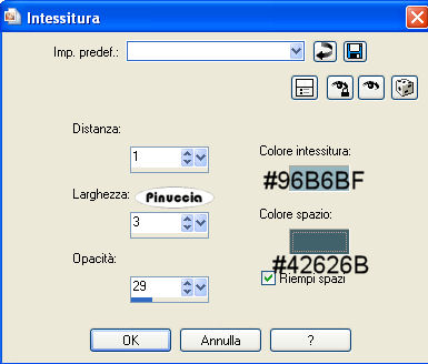 qui puoi trovare qualche risposta ai tuoi dubbi. Se l'argomento che ti interessa non è presente, ti prego di segnalarmelo. Questo tutorial è stato creato con PSP 9, ma può essere eseguito anche con le altre versioni di PSP. Occorrente: Il tube di una donna a scelta. Il resto del materiale qui Il tube Timepiece è di Marcio C; i tubes della donne sono di Hanne e Nightangel. 1. Imposta il colore di primo piano con #42626B, e il colore di sfondo con #96B6BF. 2. Apri tutto il materiale in PSP e minimizzalo tranne la trama Texture13. Fai due copie della trama, premendo sulla tastiera la combinazione di tasti shift(maiuscola)+D. Chiudi l'originale, per un uso futuro. Minimizza una copia e attiva la seconda copia, che sarà la base del tuo lavoro. Livelli>Nuovo livello raster. Riempi questo livello con il colore di primo piano,e cambia la modalità di miscelatura di questo livello in Colore (esistente). 3. Attiva il tube mc2189, e vai a Modifica>copia. Torna al tuo lavoro e vai a Modifica>Incolla>Incolla come nuovo livello. Sposta il tube a destra (vedi il mio esempio).![]() Cambia la modalità di miscelatura in Luminanza (esistente), e abbassa l'opacità al 24%. 4. Attiva il tube della donna e vai a Modifica>copia. Torna al tuo lavoro e vai a Modifica>Incolla>Incolla come nuovo livello. Se necessario, ridimensiona il tube e spostalo sul lato destro della tag.Effetti>Effetti 3D>Sfalsa ombra, con i seguenti settaggi, colore nero: ![]() 5. Attiva runningoutoftime_overlaysmall, e vai a Modifica>Copia. Torna al tuo lavoro e vai a Modifica>Incolla>Incolla come nuovo livello. Sposta il tube nell'angolo in basso a sinistra (vedi l'esempio).![]() 6. Attiva runningoutoftime_hearts, e vai a Modifica>Copia. Torna al tuo lavoro e vai a Modifica>Incolla>Incolla come nuovo livello. Sposta i cuori in modo che sembrino appesi sotto il disegno del quadrato nella striscia a sinistra.Attiva runningoutoftime_text, e vai a Modifica>Copia. Torna al tuo lavoro e vai a Modifica>Incolla>Incolla come nuovo livello. Sposta il testo come mostrato nella tag finale.7. Livelli>Unisci>Unisci visibile. Immagine>Ridimensiona, al 90%, tutti i livelli non selezionato, ricampionamento bicubica. ![]() Effetti>Effetti 3D>Sfalsa ombra, con i settaggi precedenti. 8. Livelli>Nuovo livello raster. Livelli>Disponi>Porta sotto. Selezione>Seleziona tutto. Attiva la copia della trama che hai duplicato e minimizzato all'inizio del tutorial. Attiva lo strumento Selezione , rettangolo, sfumatura 0,e traccia una selezione della trama escludendo la parte scura. ![]() Modifica>Copia. 9. Torna al tuo lavoro e vai a Modifica>Incolla>Incolla nella selezione. Selezione>Nessuna selezione. Livelli>Nuovo livello raster. Riempi questeo livello con il colore di primo piano,e cambia la modalità di miscelatura di questo livello in Colore (esistente). Livelli>Unisci>Unisci giù. 10. Livelli>Duplica. Cambia la modalità di miscelatura del livello duplicato in Filtra. Chiudi il livello della tag e attiva il livello duplicato dello sfondo. Livelli>Unisci>Unisci visibile. Effetti>Effetti di trama>Intessitura, con i seguenti settaggi: colore intessitura #96B6Bf; colore spazio #42626B; riempi spazi selezionato. ![]() 11. Attiva runningoutoftime_overlay, e vai a Modifica>Copia. Torna al tuo lavoro e vai a Modifica>Incolla>Incolla come nuovo livello. Rimuovi la x dal livello della tag per renderlo nuovamente visibile. Livelli>Unisci>Unisci tutto (appiattisci). Immagine>Aggiungi bordatura, 2 pixels, simmetriche, con il colore #42626B. 12. Aggiungi il tuo nome e/o il tuo watermark, ridimensiona se necessario, e salva nel formato che preferisci. ![]() ![]() Se hai problemi o dubbi, o trovi un link non funzionante, o anche soltanto per un saluto, scrivimi 25 Gennaio 2008 |