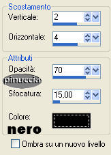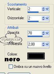 qui puoi trovare qualche risposta ai tuoi dubbi. Se l'argomento che ti interessa non è presente, ti prego di segnalarmelo. Questo tutorial è stato creato usando la versione 8 di Psp, ma può essere eseguito anche con le altre versioni. Per tradurlo, l'ho eseguito con PSP X. Occorrente: Filtri: FM Tile Tools qui Dsb Flux qui Tube della donna qui Tube e accessori a scelta Il resto del materiale qui (questo file comprende i cuori e la tag "I love shopping"). Gli altri accessori sono stati da House of Lime e Blue Vinyl Fonts (siti non più in rete) La trama http://puzzle.digital-distortia.com/ qui (clicca su Textures, quindi scarica "Phoenix_texture 12": è quella al centro della prima fila). Font a scelta. 1. Apri tutto il materiale (tube della donna, trama e accessori) in PSP e, per il momento, minimizzalo nella tua area di lavoro. Imposta il colore di primo piano su #82A144 e il colore di sfondo su #E04999. 2. Apri una nuova immagine trasparente 272 x 272 pixels. Riempila con il colore di primo piano.Livelli>Nuovo livello raster. Selezione>Seleziona tutto. Apri la trama "Phoenix_texture12" e vai a Modifica>Copia. Torna al tuo lavoro e vai a Modifica>Incolla>Incolla nella selezione. Selezione>Nessuna selezione. Cambia la modalità di miscelatura di questo livello in Luminanza (esistente). 3. Livelli>Unisci>Unisci visibile. Effetti>Plugins>FM Tile Tools - Blend emboss, con i settaggi standard. ![]() 4. Immagine>Aggiungi bordatura, 2 pixels, simmetriche, con il colore di sfondo #E04999. Per il momento, minimizza questo quadrato nella tua area di lavoro. 5. Apri una nuova immagine trasparente 272 x 272 pixels. Riempila con il colore di sfondo.Livelli>Nuovo livello raster. Selezione>Seleziona tutto. Apri la trama "Phoenix_texture12" e vai a Modifica>Copia. Torna al tuo lavoro e vai a Modifica>Incolla>Incolla nella selezione. Selezione>Nessuna selezione. Cambia la modalità di miscelatura di questo livello in Luminanza (esistente). 6. Livelli>Unisci>Unisci visibile. Effetti>Plugins>FM Tile Tools - Blend emboss, con i settaggi standard. Immagine>Aggiungi bordatura, 2 pixels, simmetriche, con il colore di primo piano #82A144. Minimizza per il momento anche questo quadrato. 7. Apri una nuova immagine trasparente 700 x 550 pixels. Attiva il primo quadrato che hai creato (quello verde) e vai a Modifica>Copia. Torna al tuo lavoro e vai a Modifica>Incolla>Incolla come nuovo livello. Immagine>Ridimensiona, del 70%, tutti i livelli non selezionato, ricampionamento bicubica: ![]() Sposta questo quadro sul lato sinistro dell'immagine, in alto8. Apri il secondo quadrato che hai fatto e vai a Modifica>Copia. Torna al tuo lavoro e vai a Modifica>Incolla>Incolla come nuovo livello. Immagine>Ridimensiona, dell'85%, tutti i livelli non selezionato, ricampionamento bicubica. Sposta questo quadrato sul lato sinistro e posizionalo sotto quello verde:![]() 9. Posizionati sul quadrato superiore (quello verde). Livelli>Duplica. Immagine>Capovolgi. Effetti>Effetti 3D>Sfalsa ombra, con i seguenti settaggi, colore nero: e applica l'Effetto a tutti e tre i livelli dei quadrati: ![]() 10. La schermata sotto mostra come dovrebbero apparire i quadrati a questo punto. ![]() 11. Livelli>Unisci>Unisci visibile. Livelli>Duplica. Attiva il livello originale dei quadrati uniti e vai a: Effetti>Plugins>dsb flux / Linear Transmission, con i seguenti settaggi: ![]() 12. Effetti>Effetti 3D>Sfalsa ombra, con i seguenti settaggi, colore nero: ![]() Livelli>Unisci>Unisci visibile. 13. Livelli>Duplica. Immagine>Rifletti. Posiziona il livello dei quadrati in modo che si uniscano al centro, come mostrato nella schermata: ![]() 14. Apri il tube della donna e vai a Modifica>Copia. Torna alla tua tag e vai a Modifica>Incolla>Incolla come nuovo livello. Posizionala al centro sullo sfondo dei quadrati.Effetti>Effetti 3D>Sfalsa ombra, con i seguenti settaggi, colore nero: ![]() 15. Apri il tube dei cuori e vai a Modifica>Copia. Torna al tuo lavoro e vai a Modifica>Incolla>Incolla come nuovo livello. Sposta i cuori nell'angolo in alto a destra.Apri il tube "loveshopping_bb" e vai a Modifica>Copia. Torna al tuo lavoro e vai a Modifica>Incolla>Incolla come nuovo livello. Sposta il tube nel quadrato rosa a destra della donna.16. Apri il tube del cappello e vai a Modifica>Copia. Torna al tuo lavoro e vai a Modifica>Incolla>Incolla come nuovo livello. Spostalo nel quadrato in basso a destra.Apri il tube della borsetta e vai a Modifica>Copia. Torna al tuo lavoro e vai a Modifica>Incolla>Incolla come nuovo livello. Spostalo nel quadrato in alto a sinistra.(Se stai usando accessori differenti, posizionali a tuo piacimento.) 17. Apri il tube del rossetto e vai a Modifica>Copia. Torna al tuo lavoro e vai a Modifica>Incolla>Incolla come nuovo livello. Spostalo nel quadrato in basso a sinistra.18. E' il momento di aggiungere il testo. Qui sotto ci sono i settaggi che ho usato per il mio. Font Mumm 12 Days SV, dimensione 72, vettore, pennellata 1; colore di primo piano #82A144, colore di sfondo #E04999: ![]() 19. Io ho scritto il mio testo in posizione verticale e ho aggiunto un leggero Effetto Sfalsa ombra. Livelli>Unisci>Unisci tutto (appiattisci). Ridimensiona, se necessario, e salva nel formato che preferisci. ![]() ![]() Se hai problemi o dubbi, o trovi un link non funzionante, o anche soltanto per un saluto, scrivimi. Novembre 2006 |