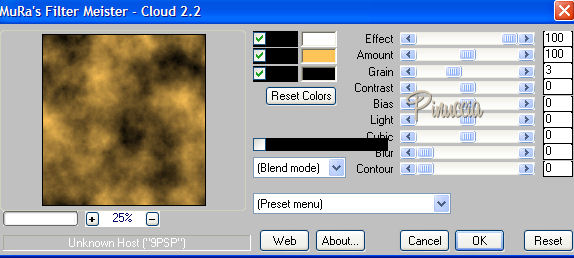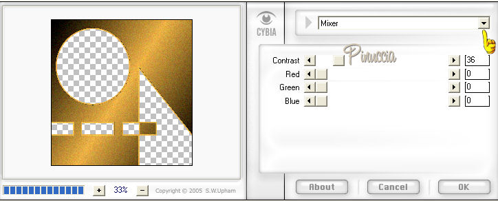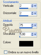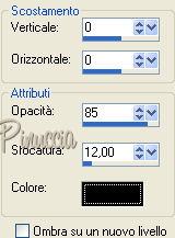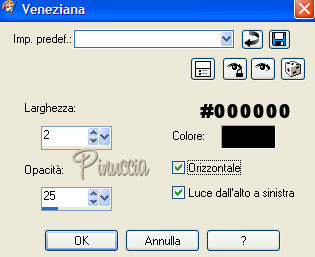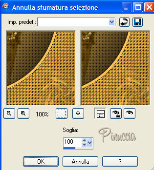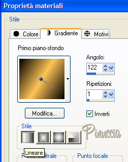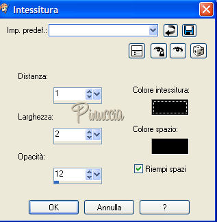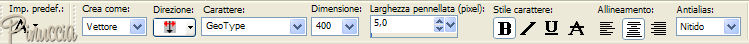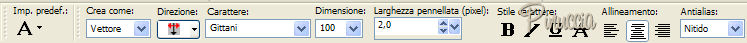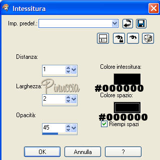 qui puoi trovare qualche risposta ai tuoi dubbi. Se l'argomento che ti interessa non è presente, ti prego di segnalarmelo. Questo tutorial è stato creato con PSP 9, ma può essere eseguito anche con le altre versioni di PSP. Occorrente: Materiale qui I tubes che ho usato sono di Crystal e di Alexandre Marques. Font GeoType qui Font Gittani qui Filtri: Mura's Meister - Cloud qui Cybia's Mezzy qui 1. Apri tutto il materiale in PSP e minimizzalo per il momento nella tua area di lavoro. Imposta il colore di primo piano con #FFC457 e il colore di sfondo con #000000. Apri una nuova immagine trasparente 650 x 680 pixels. 2. Attiva lo strumento Testo , con i seguenti settaggi![]() 3. Scrivi la lettera "w" minuscola. Oggetti>Allinea>Centra nella tela. Usa i nodi del vettore per ingrandire l'immagine. ![]() Livelli>Converti in livello raster. Attiva lo strumento Bacchetta magica ![]() ![]() e clicca sulla parte nera della tag per selezionarla. Assicurati che siano selezionate tutte le parti nere. Vedi il piccolo quadrato in fondo alla tag sulla destra? ![]() Devi selezionare anche questo. Livelli>Nuovo livello raster. Passa il colore di primo piano a Gradiente, con i seguenti settaggi: ![]() 4. Riempi il nuovo livello con il gradiente.Mantieni selezionato. Effetti>Plugins>Cybia - Mezzy, con i seguenti settaggi: ![]() Regola>Messa a fuoco>Metti a fuoco. Mantieni ancora selezionato. 5. Effetti>Effetti di trama>Intessitura, con i seguenti settaggi: ![]() Selezione>Nessuna selezione. 6. Attiva il livello Raster 2 (il livello con il font). Clicca con la bacchetta magica sul bordo giallo della tag.Effetti>Effetti di trama>Veneziana, con i seguenti settaggi. ![]() Mantieni selezionato. 7. Effetti>Effetti 3D>Smusso a incasso, con i seguenti settaggi: ![]() Selezione>Nessuna selezione. 8. Livelli>Unisci>Unisci visibile. Con la bacchetta magica e le precedenti impostazioni,clicca all'interno della parte rotonda sullo sfondo. Selezione>Modifica>Espandi di 2 pixels. Livelli>Nuovo livello raster. Livelli>Disponi>Sposta giù. Riempi questo livello con il gradiente.Effetti>Effetti di trama>Intessitura, con i seguenti settaggi, colore nero: ![]() Mantieni selezionato. 9. Attiva il tube che hai deciso di usare e vai a Modifica>copia. Torna al tuo lavoro e vai a Modifica>Incolla>Incolla come nuovo livello. Sposta la parte di tube che deve rimanere all'interno del cerchio.Selezione>Inverti. Con il livello del tube attivo, premi sulla tastiera il tasto CANC ![]() Selezione>Nessuna selezione. Cambia la modalità di miscelatura di questo livello in Luminanza (esistente), e abbassa l'opacità al 58%. 10. Attiva il livello superiore, che dovrebbe essere il livello di sfondo uniti. ![]() Effetti>Effetti 3D>Sfalsa ombra, con i seguenti settaggi, colore nero: ![]() 11. Livelli>Nuovo livello raster. Attiva lo strumento Pennello ,e applica sulla tag alcuni pennelli a tua scelta. Se vuoi usarli, ho incluso nello zip del materiale i files psp di alcuni dei pennelli che ho utilizzato. Puoi copiarli e incollarli come nuovo livello, oppure esportarli come pennelli personalizzati. come fare vedi qui Quando hai finito di aggiungere i pennelli, vai a Livelli>Unisci>Unisci visibile. Aggiungi il tuo nome o un testo alla tag. Questi i settaggi che ho usato per il mio nome. ![]() Font Gittani, dimensione 100, pennellata 2, vettore, antialias colore di primo piano #FFC457; colore di sfondo nero #000000. 12. Livelli>Converti in livello raster. Posiziona il testo come mostrato nell'esempio. Effetti>Effetti 3D>sfalsa ombra, con i settaggi che preferisci. Questi i settaggi che ho usato io: ![]() Livelli>unisci>Unisci visibile. Selezione>Seleziona tutto. Selezione>Mobile. Selezione>immobilizza. Selezione>Modifica>Annulla sfumatura, soglia 100. ![]() 13. Livelli>Nuovo livello raster. I colori impostati come colore di primo piano e colore di sfondo dovrebbero essere quelli usati al passo 1. Effetti>Plugins>Mura's Meister - Cloud: ![]() 14. Selezione>Nessuna selezione. Cambia la modalità di miscelatura di questo livello in Sovrapponi, (o, se preferisci, usa un'altra modalità a tua scelta), e abbassa l'opacità all'80%. Attiva nuovamente il tuo tube e vai a Modifica>copia. Torna al tuo lavoro e vai a Modifica>Incolla>Incolla come nuovo livello. Immagine>Rifletti. Sposta questo tube sul lato destro della tag.Effetti>Effetti 3D>Sfalsa ombra, con i seguenti settaggi, colore nero. ![]() 15. Livelli>Unisci>unisci visibile. Selezione>Seleziona tutto. Selezione>Mobile. Selezione>Immobilizza. Immagine>Ritaglia la selezione. Livelli>Unisci>Unisci tutto (appiattisci). Ridimensiona, se necessario, è salva nel formato che preferisci. ![]() ![]() Se hai problemi o dubbi, o trovi un link non funzionante, o anche soltanto per un saluto, scrivimi 10 Settembre 2007 |