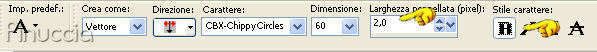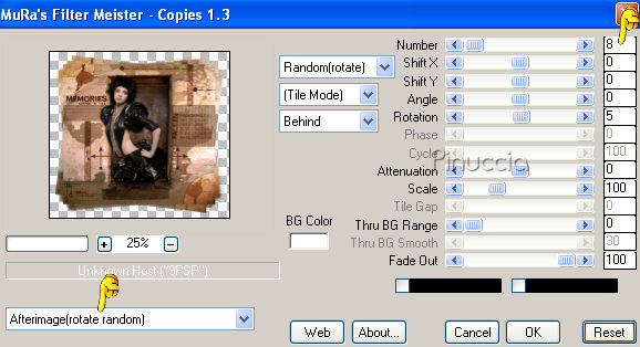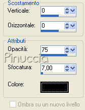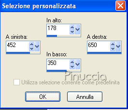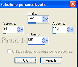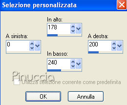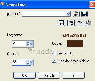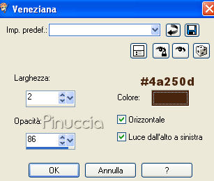 qui puoi trovare qualche risposta ai tuoi dubbi. Se l'argomento che ti interessa non è presente, ti prego di segnalarmelo. Questo tutorial è stato creato con PSP 9, ma può essere eseguito anche con le altre versioni di PSP. Occorrente: Materiale qui Tube a scelta. I tubes che ho usato per i miei esempi sono di Jet e di Nightangel. L'immagine è di http://www.fontplay.com/freephotos/index.htm Free Photos Apri il font e minizzalo nella tua area di lavoro; lo troverai nella lista dei font disponibili, quando ti servirà. Filtro Mura's Meister - Copies qui 1. Apri tutto il materiale in PSP e minimizzalo nella tua area di lavoro. Imposta il colore di primo piano con #4A250D, e il colore di sfondo con il bianco (#ffffff). Apri una nuova immagine trasparente 650 x 600 pixels. 2. Selezione>Seleziona tutto. Attiva msfreefoto0003, e vai a Modifica>Copia. Torna alla tua immagine trasparente e vai a Modifica>Incolla>Incolla nella selezione. Selezione>Nessuna selezione. Attiva il tube che hai deciso di usare per la tua tag e vai a Modifica>Copia. Torna al tuo lavoro e vai a Modifica>Incolla>Incolla come nuovo livello. Immagine>Ridimensiona, se e quanto necessario, per adattare il tube alla porta. Effetti>Effetti 3D>Sfalsa ombra, con i seguenti settaggi, colore nero: ![]() Io ho applicato l'Effetto Sfalsa ombra al tube due volte. 3. Nella paletta dei livelli attiva il livello dello sfondo. Attiva lo strumento Selezione , rettangolo, sfumatura 0,clicca su Selezione personalizzata ,e imposta i seguenti settaggi. ![]() 4. Selezione>Innalza selezione a livello. Effetti>Effetti di trama>Veneziana, con i seguenti settaggi. ![]() Mantieni selezionato. 5. Effetti>Effetti 3D>Sfalsa ombra, con i seguenti settaggi, colore nero. ![]() Selezione>Nessuna selezione. Cambia la modalità di miscelatura di questo livello in Scurisci. 6. Attiva nuovamente il livello di sfondo. Selezione personalizzata con i seguenti settaggi:![]() 7. Selezione>Innalza selezione a livello. Effetti>Effetti di trama>Veneziana, con i seguenti settaggi. ![]() 8. Effetti>Effetti 3D>Sfalsa ombra, con i settaggi usati al passo 5. Selezione>Nessuna selezione. Cambia la modalità di miscelatura di questo livello in Scurisci. 9. Attiva nuovamente il livello di sfondo. Ancora Selezione personalizzata , con i seguenti settaggi.![]() 10. Selezione>Innalza selezione a livello. Effetti>Effetti 3D>Sfalsa ombra, con i settaggi usati al passo 5. Selezione>Nessuna selezione. Cambia la modalità di miscelatura di questo livello in Moltiplica. Livelli>Duplica. Sposta il livello duplicato nell'angolo in alto a destra, vedi l'esempio sotto.![]() 11. Attiva lo strumento Selezione , e cambia la selezione a Cerchio.Attiva il livello di sfondo. Parti dall'angolo in alto a sinistra, al punto 0,0, e arriva fino al punto 134,134: vedi l'esempio sotto. ![]() Selezione>Innalza selezione a livello. Effetti>Effetti 3D>Sfalsa ombra, con i settaggi usati al punto 5. Selezione>Nessuna selezione. Cambia la modalità di miscelatura di questo livello in Sovrapponi. Livelli>Duplica. Immagine>Rifletti. Immagine>Capovolgi. 12. Attiva il tube trappedintime_memories e vai a Modifica>Copia. Torna al tuo lavoro e vai a Modifica>Incolla>Incolla come nuovo livello. Sposta il tube in alto a sinistra, sotto il cerchio, vedi il mio esempio.Cambia la modalità di miscelatura di questo livello in Moltiplica. 13. Attiva il tube trappedintime_pain, e vai a Modifica>Copia. Torna al tuo lavoro e vai a Modifica>Incolla>Incolla come nuovo livello. Sposta il tube nell'angolo in basso a sinistra, vedi il mio esempio.Attiva il tube trappedintime_double arrows, e vai a Modifica>Copia. Torna al tuo lavoro e vai a Modifica>Incolla>Incolla come nuovo livello. Sposta le freccie sul lato sinistro della tag, vedi il mio esempio.Livelli>Duplica. Immagine>Rifletti. 14. Attiva il tube trappedintime_fallen, e vai a Modifica>Copia. Torna al tuo lavoro e vai a Modifica>Incolla>Incolla come nuovo livello. Sposta questo tube nella sezione con l'effetto Veneziana, a destra (vedi il mio esempio.Attiva il tube trappedintime_dashcircle, e vai a Modifica>Copia. Torna al tuo lavoro e vai a Modifica>Incolla>Incolla come nuovo livello. Sposta questo tube in alto a destra, sopra la porta (vedi il mio esempio).Livelli>Duplica. Sposta il duplicato a destra, fuori dal bordo, vedi l'esempio sotto:![]() 15. Livelli>Unisci>Unisci visibile. Immagine>Ridimensiona, all'85%, tutti i livelli NON selezionato, ricampionamento bicubica. Livelli>Duplica. Posizionati sul livello originale della tag (il livello inferiore). Effetti>Plugins>Mura's Meister - Copies, con i seguenti settaggi: ![]() 16. Effetti>Effetti 3D>Sfalsa ombra, con i settaggi usati al passo 5. Abbassa l'opacità di questo livello al 62%. Attiva il livello del duplicato (che dovrebbe essere il livello superiore). Effetti>Effetti 3D>Sfalsa ombra, con i settaggi usati al passo 5. Livelli>Unisci>Unisci visibile. Livelli>Nuovo livello raster. Riempi il nuovo livello con il bianco (#ffffff).Livelli>Disponi>Porta sotto. 17. E' il momento di scrivere un testo o il tuo nome. Imposta il colore di primo piano con #4A250D e il colore di sfondo con #995325. Questi i settaggi usati per il mio testo: Font CBX-ChippyCircles; dimensione 60 pixels, vettore, Bold, antialias, pennellata 2: ![]() 18. Scrivi il testo e posizionalo. Livelli>Converti in livello raster. Effetti>Effetti 3D>Sfalsa ombra, con i settaggi precedenti. Io ho applicato l'Effetto Sfalsa ombra due volte. 19. Livelli>Unisci>Unisci tutto (appiattisci). Ridimensiona, se necessario, e salva nel formato che preferisci. ![]() ![]() Se hai problemi o dubbi, o trovi un link non funzionante, o anche soltanto per un saluto, scrivimi 17 Ottobre 2007 |
