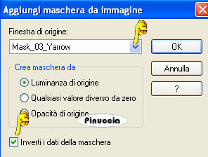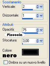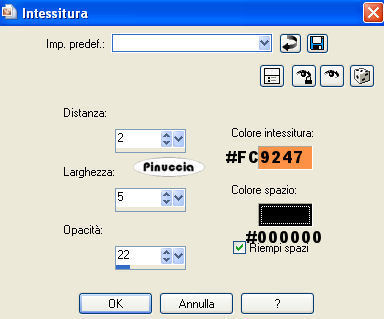 qui puoi trovare qualche risposta ai tuoi dubbi. Se l'argomento che ti interessa non è presente, ti prego di segnalarmelo. Questo tutorial è stato creato con PSP 9, ma può essere eseguito anche con le altre versioni di PSP. Occorrente: Materiale qui Il tube della donna è di Terry 1. Apri tutto il materiale in PSP e minimizzalo nella tua area di lavoro. Imposta il colore di primo piano con #FC9247, e il colore di sfondo con il nero: #000000. Apri una nuova immagine trasparente 320 x 545 pixels. 2. Riempi l'immagine trasparente con il colore di primo piano.Livelli>Nuovo livello raster. Riempi questo livello con il colore di sfondo.ricorda che, per riempire con il colore di sfondo, devi cliccare con il tasto destro del mouse Livelli>Nuovo livello maschera>Da immagine. Apri il menu a tendina sotto la finestra di origine. Troverai tutti i files aperti in PSP. Seleziona la maschera Mask_03_Yarrow, con i seguenti settaggi: ![]() 3. Livelli>Unisci>Unisci gruppo. Livelli>Unisci>Unisci visibile. Attiva il tube Terry_Lady+Boxer, e vai a Modifica>Copia. Torna al tuo lavoro e vai a Modifica>Incolla>Incolla come nuovo livello. Sposta il tube a destra, in modo che il bordo netto del braccio coincida con il bordo dell'immagine.![]() Effetti>Effetti 3D>Sfalsa ombra, con i seguenti settaggi, colore nero: ![]() 4. Livelli>Unisci>Unisci tutto (appiattisci). Immagine>Aggiungi bordatura, 2 pixels, simmetriche, con il colore #000000. Livelli>Innalza livello di sfondo. Immagine>Dimensione tela, cambia larghezza e altezza a 650 pixels, e clicca sulla freccia al centro. ![]() 5. Attiva lo strumento Selezione , cerchio, sfumatura 0, antialias.Posiziona il mouse al centro dell'immagine (1), hai due ../../strumenti in aiuto: il righello (2) e la posizione del mouse nella barra inferiore del programma (3). Quando sei perfettamente al centro, nei punti x:325,y:325 disegna un cerchio. ![]() Se, partendo dal centro, tieni premuto contemporaneamente il tasto CTRL avrai un cerchio perfetto. ![]() Livelli>Nuovo livello raster. Riempi questo livello con il colore di primo piano.Livelli>Nuovo livello raster. Riempi questo livello con il colore di sfondo.Selezione>Nessuna selezione. Livelli>Nuovo livello maschera>Da immagine. Seleziona nuovamente la maschera Mask_03_Yarrow, con gli stessi settaggi. Livelli>Unisci>Unisci gruppo. Livelli>Unisci>Unisci giù. 6. Attiva lo strumento Bacchetta magica , tolleranza 10, sfumatura 0,e clicca sui quadrati arancio del cerchio. ![]() Effetti>Effetti di trama>Intessitura, con i seguenti settaggi: colore intessitura #FC9247, colore spazio #000000 ![]() 7. Selezione>Nessuna selezione. Selezione>seleziona tutto. Selezione>mobile. Selezione>immobilizza. Livelli>Nuovo livello raster. Riempi questo livello con il colore di sfondo.Selezione>Modifica>Contrai, di 2 pixels. Premi sulla tastiera il tasto CANC ![]() Selezione>Nessuna selezione. Livelli>Unisci>Unisci giù. Effetti>Effetti 3D>Sfalsa ombra, con i seguenti settaggi, colore nero: ![]() 8. Livelli>Disponi>Porta sotto. Attiva il livello superiore della paletta dei livelli. Effetti>Effetti 3D>Sfalsa ombra con gli stessi settaggi usati per il livello del cerchio. ![]() Io ho applicato l'Effetto Sfalsa ombra a questo livello per un totale di 2 volte. Attiva il tube wannafight_bigboy, e vai a Modifica>copia. Torna al tuo lavoro e vai a Modifica>Incolla>Incolla come nuovo livello. Immagine>Ridimensiona, al 95%, tutti i livelli non selezionato, ricampionamento bicubica. ![]() Posiziona questo tube sul lato destro della tag.9. Attiva il tube wannafight_bringiton, e vai a Modifica>copia. Torna al tuo lavoro e vai a Modifica>Incolla>Incolla come nuovo livello. Sposta questo testo sul lato sinistro della tag.(vedi l'esempio finale). Attiva il tube wannafight_acquainted, e vai a Modifica>Copia. Torna al tuo lavoro e vai a Modifica>Incolla>Incolla come nuovo livello. Posiziona il testo sotto il braccio della donna sul lato destro della tag.(vedi l'esempio finale). 10. Livelli>Nuovo livello raster. Riempi questo livello con il colore bianco #FFFFFF.Livelli>Disponi>Porta sotto. Attiva wannafight_overlay1, e vai a Modifica>Copia. Torna al tuo lavoro e vai a Modifica>Incolla>Incolla come nuovo livello. Posiziona l'immagine come mostrato nella schermata sotto:![]() 11. Attiva wannafight_overlay2, e vai a Modifica>Copia. Torna al tuo lavoro e vai a Modifica>Incolla>Incolla come nuovo livello. Spostalo come nella schermata sotto.![]() 12. Attiva il livello di sfondo bianco. Attiva wannafight_overlay3, e vai a Modifica>Copia. Torna al tuo lavoro e vai a Modifica>Incolla>Incolla come nuovo livello. Nascondi il livello bianco di sfondo e vai a Livelli>Unisci>Unisci visibile. Immagine>Ridimensiona, al 90%, tutti i livelli non selezionato, ricampionamento bicubica. Aggiungi il tuo testo o il tuo nome alla tag. Sotto i settaggi che ho usato per scrivere il mio nome. Font Boxtop, dimensione 64 pixels, vettore, bold, antialias, pennellata 3, colore di primo piano #FC2947; colore di sfondo #000000. 13. Livelli>Converti in livello raster. Effetti>Effetti 3D>Sfalsa ombra, con i seguenti settaggi, colore nero. ![]() Livelli>Unisci>Unisci tutto (appiattisci). Ritaglia lo spazio bianco in eccesso, ridimensiona se necessario, e salva nel formato che preferisci.![]() Se hai problemi o dubbi, o trovi un link non funzionante, o anche soltanto per un saluto, scrivimi 1 Gennaio 2008 |