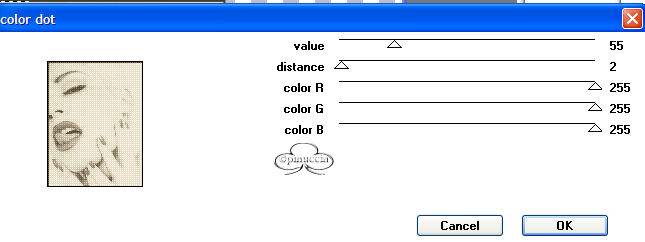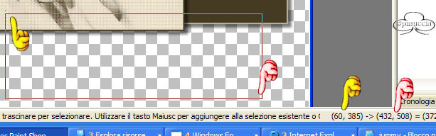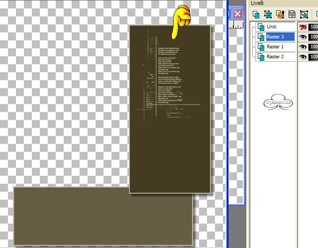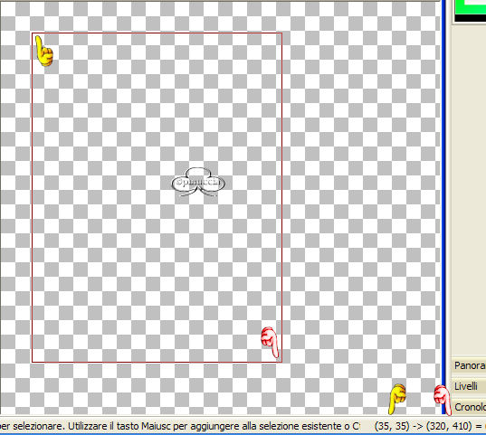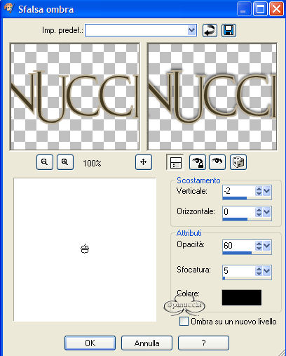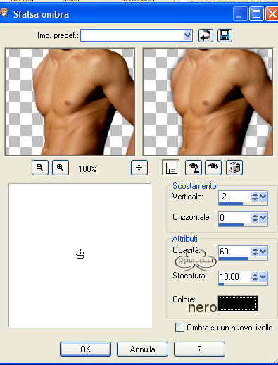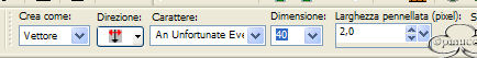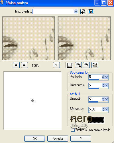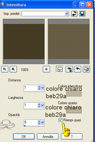 qui puoi trovare qualche risposta ai tuoi dubbi. Se l'argomento che ti interessa non è presente, ti prego di segnalarmelo. Questo tutorial è stato creato usando PSP 8. Occorrente: Penta.com - Color dot qui Materiale:qui Font a scelta. 1. Apri tutto il materiale fornito nello zip e minimizzalo per il momento. Apri una nuova immagine trasparente 500 x 550 pixels. Imposta il colore di primo piano con #453B22 e il colore di sfondo con #BEB29A. 2. Attiva lo strumento Selezione , rettangolo, aggiungi, sfumatura 0,![]() disegna un rettangolo sull'immagine. Io sono partita al punto 35,35 (manina gialla) e ho tracciato il rettangolo fino al punto 320,410 (manina rossa). ![]() Riempi la selezione con il colore scuro di primo piano.3. Livelli>Nuovo livello raster. Selezione>Modifica>Contrai di 2 pixels. Riempi questo livello con il colore chiaro di sfondo.Mantieni selezionato. Livelli>Nuovo livello raster. Apri il tube della donna e vai a Modifica>Copia. Torna al tuo lavoro e vai a Modifica>Incolla>Incolla nella selezione. Cambia la modalità di miscelatura in Luminanza (esistente) e abbassa l'opacità del livello al 60%. ![]() Livelli>Unisci>unisci visibile. Mantieni selezionato. 4. Effetti>Plugins>Penta.com - Color dot, usando i seguenti settaggi: ![]() 5. Regola>Messa a fuoco>Metti a fuoco. Selezione>Nessuna selezione. Effetti>Effetti 3D>Sfalsa ombra, usando i seguenti settaggi: ![]() 6. Livelli>Nuovo livello raster. Attiva lo strumento Selezione e disegna un rettangolo vicino al rettangolo che hai appena fatto.Io sono partita a 300,50 fino a 470,400. ![]() Riempi la selezione con il colore chiaro di sfondo.Selezione>Modifica>Contrai di 2 pixels. Riempi con il colore scuro di primo piano. Selezione>Nessuna selezione. Livelli>Disponi>Sposta giù. Effetti>Effetti 3D>Sfalsa ombra, con gli stessi settaggi del passo 5. (NOTA: se decidi di spostare i rettangoli sulla sinistra, fai attenzione che l'ombra non rimanga tagliata). 7. Livelli>Nuovo livello raster. Attiva lo strumento selezione e disegna un altro rettangolo nella parte inferiore della tag. Io sono partita al punto 60,385 fino a 432,508. ![]() Riempi la selezione con il colore chiaro di sfondo.Selezione>Modifica>Contrai - 2 pixels. Riempi con il colore scuro di primo piano.Mantieni selezionato. 8. Effetti>effetti di trama>Intessitura, con i seguenti settaggi: ![]() 9. Selezione>Nessuna selezione. Effetti>Effetti 3D>Sfalsa ombra, con i settaggi precedenti. Livelli>Disponi>Sposta sotto. Nascondi il livello della tag. Dovrebbe essere il primo rettangolo che hai fatto con il grafico della donna. Attiva il livello del rettangolo di centro, che dovrebbe essere quello con il colore verde scuro senza l'effetto intessitura, sul lato destro dell'immagine. 10. Apri il file "yummy accents tube" e posizionati sul livello 3. Modifica>Copia e minimizza il tube per il momento perchè ti servirà ancora. Torna al tuo lavoro e vai a Modifica>incolla>incolla come nuovo livello. Posizionalo in alto sul rettangolo (vedi tag finale).![]() 11. Ritorna al file "Yummy accents tube" e posizionati su uno dei livelli delle frecce e vai a Modifica>Copia. Adesso puoi chiudere il tube. Torna al tuo lavoro e vai a Modifica>Incolla>Incolla come nuovo livello. Ridimensiona il livello della freccia all'85%, tutti i livelli non selezionato, tipo di ricampionamento: bicubica. ![]() Posiziona la freccia sotto il tube del testo sul rettangolo verde scuro (vedi tag di esempio).12. Livelli>Duplica. Immagine>Rifletti. Immagine>Capovolgi. Ridimensiona questa freccia dell'85%, tutti i livelli NON selezionato, ricampionamento: bicubica. ![]() Sposta la freccia vicino alla prima freccia (vedi tag finale).13. Togli la x dal livello superiore, per attivarlo; se tutto è a posto vai a Livelli>Unisci>Unisci visibile. Apri il tube dell'uomo e vai a Modifica>Copia. Puoi chiuderlo perchè non ti servirà più. Torna al tuo lavoro e vai a Modifica>Incolla>Incolla come nuovo livello. Immagine>Rifletti. Se stai usando il file fornito nello zip, dovrai ridimensionarlo. Io l'ho ridotto due volte dell'85% e una volta del 95%: ridimensiona tutti i livelli NON selezionato. ricampionamento: bicubica. ![]() 14. Posiziona il tube nel rettangolo con l'immagine della donna.Cambia la modalità di miscelatura di questo livello in Luminanza (esistente). Effetti>Effetti 3D>Sfalsa ombra, con i seguenti settaggi: ![]() 15. Livelli>Unisci>unisci visibile. Apri il file "text accent tube" e vai a Modifica>Copia (adesso puoi chiuderlo). Torna alla tua tag e vai a Modifica>Incolla>incolla come nuovo livello. Immagine>Ridimensiona del 45%, tutti i livelli NON selezionato, ricampionamento bicubica. Posizionalo sul rettangolo accanto all'immagine dell'uomo.Io l'ho spostato sull'angolo destro in alto vicino alla sua testa. Cambia la modalità di miscelatura in Luminanza (esistente) e abbassa l'opacità al 64%. ![]() 16. Livelli>Unisci>unisci visibile. Adesso è il momento di aggiungere il tuo nome alla tag; sotto ci sono i settaggi che ho usato per il mio nome. Ho scelto il font An Unfortunate Event. Ho invertito i colori, cosicchè il colore di primo piano è adesso il mio colore di sfondo e il mio colore di sfondo è diventato il mio colore di primo piano. ![]() 17. Scrivi il testo, posizionalo e, quando è tutto ok, nella paletta dei livelli converti il livello vettore in livello raster. Effetti>Effetti 3D>Sfalsa ombra, con questi settaggi. ![]() Io ho applicato lo sfalsa ombra due volte. Livelli>Unisci>unisci visibile. 18. Selezione>Seleziona tutto. Selezione>Mobile. Selezione>Immobilizza. Immagine>Ritaglia la selezione. Livelli>Unisci>Unisci tutto (appiattisci). Ridimensiona se necessario e salva nel formato che preferisci. ![]() Se hai problemi o dubbi, o trovi un link non funzionante, o anche soltanto per un saluto, scrivimi. Aprile 2006 |