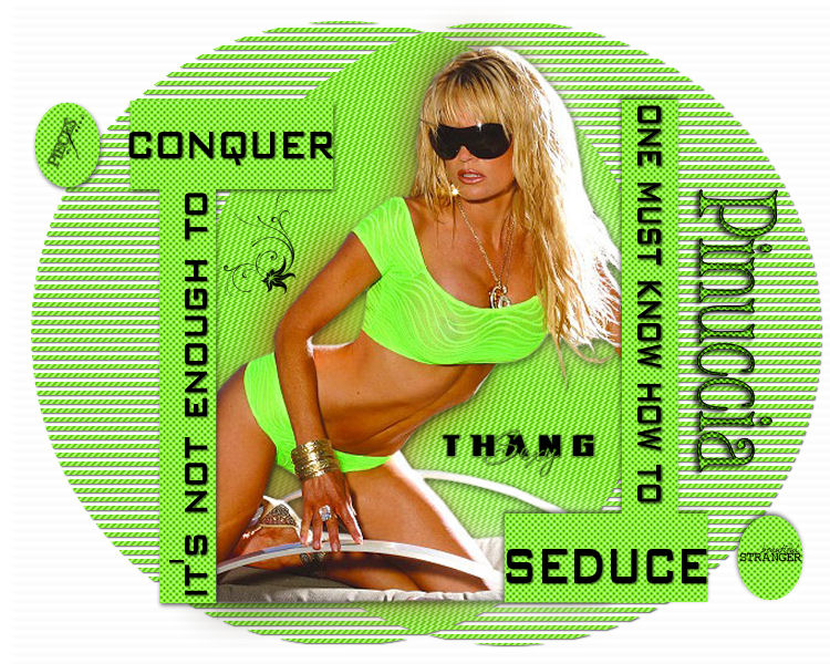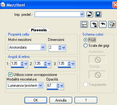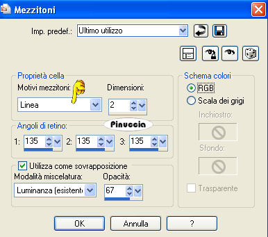 qui puoi trovare qualche risposta ai tuoi dubbi. Se l'argomento che ti interessa non è presente, ti prego di segnalarmelo. Questo tutorial è stato creato con PSP 9, ma può essere eseguito anche con le altre versioni di PSP. Occorrente: Materiale qui Il tube della donna è di Cristaldor. Font Kryptonian qui Filtro Dsb Flux qui 1. Apri tutto il materiale in PSP e minimizzalo nella tua area di lavoro. Imposta il colore di sfondo con #8BF03A, e chiudi il colore di primo piano. Apri una nuova immagine BIANCA 750 x 600 pixels. 2. Attiva il tube C25FEM84, e vai a Modifica>Copia. Torna alla tua immagine bianca e vai a Modifica>Incolla>Incolla come nuovo livello. Livelli>Duplica. Attiva il livello originale del tube. Regola>Sfocatura>Sfocatura gaussiana, raggio 20. ![]() Cambia la modalità di miscelatura di questo livello in Moltiplica. Attiva il livello della copia del tube. Effetti>Effetti 3D>Sfalsa ombra, con i seguenti settaggi, colore nero: ![]() 3. Attiva lo strumento Testo ,e seleziona il font Kryptonian, con i seguenti settaggi: dimensione 400 pixels, vettore, pennellata 0, antialias: Scrivi, in carattere minuscolo, la lettera "y" e clicca Applica. Posiziona la forma a sinistra del tube, poi "tira" il nodo superiore centrale della griglia vettoriale per allungare la forma. ![]() Livelli>Converti in livello raster. 4. Con il livello della forma attivo, vai a Effetti>Effetti artistici>Mezzitoni, con i seguenti settaggi: ![]() 5. Effetti>Effetti 3D>Sfalsa ombra, con i seguenti settaggi. ![]() Livelli>Duplica. Immagine>Rifletti. Immagine>Capovolgi. Sposta la forma duplicata come mostrato nella schermata sotto.![]() 6. Attiva lo strumento Selezione , cerchio:![]() Posiziona il mouse all'incrocio x:375;y:300, e disegna un cerchio grande come nell'esempio sotto. ![]() Mantieni selezionato. 7. Livelli>Nuovo livello raster. Riempi il nuovo livello con il colore di sfondo.ricorda che, per riempire con il colore di sfondo, devi cliccare con il tasto destro del mouse. ![]() Selezione>Nessuna selezione. Nella paletta dei livelli trascina questo livello sopra il livello bianco di sfondo. Effetti>Effetti artistici>Mezzitoni, con i settaggi precedenti, ma cambiando la proprietà dei motivi in Linea. ![]() Effetti>Plugins>Dsb Flux - Linear Transmission, con i seguenti settaggi. ![]() 8. Effetti>Effetti 3D>Sfalsa ombra, con i seguenti settaggi, colore nero: ![]() 9. Attiva zeestag_text1, e vai a Modifica>copia. Torna al tuo lavoro e vai a Modifica>Incolla>Incolla come nuovo livello. Posiziona il testo sulla striscia verticale a sinistra, vedi l'esempio finale.Attiva zeestag_text2, e vai a Modifica>copia. Torna al tuo lavoro e vai a Modifica>Incolla>Incolla come nuovo livello. Posiziona il testo sulla striscia orizzontale a sinistra, vedi l'esempio finale.10. Attiva zeestag_text3, e vai a Modifica>copia. Torna al tuo lavoro e vai a Modifica>Incolla>Incolla come nuovo livello. Posiziona il testo sulla striscia verticale a destra, vedi l'esempio finale.Attiva zeestag_text4, e vai a Modifica>copia. Torna al tuo lavoro e vai a Modifica>Incolla>Incolla come nuovo livello. Posiziona il testo sulla striscia orizzontale a destra, vedi l'esempio finale.Attiva zeestag_text5, e vai a Modifica>copia. Torna al tuo lavoro e vai a Modifica>Incolla>Incolla come nuovo livello. Posiziona il testo vicino al tube, vedi il mio esempio.11. Aggiungi, a tuo piacimento, degli pennelli extra o di testo sui cerchi (sia i piccoli che il grande). E' il momento di aggiungere il tuo nome alla tag. Sotto i settaggi usati per scrivere il mio nome. Font Sebastian, dimensione 80 pixels, pennellata 1, antialias, colore di primo piano #000000, colore di sfondo #8BF03A. ![]() Io ho applicato l'Effetto Mezzitoni la proprietà dei motivi Arrotondata, come al punto 4. Effetti>Effetti 3D>Sfalsa ombra, con i seguenti settaggi, colore nero, due volte: ![]() 12. Immagine>Ruota>Ruota per gradi, 90 gradi a destra e posiziona il testo come nel mio esempio. Livelli>Unisci>Unisci tutto (appiattisci). Ridimensiona, se necessario, e salva nel formato che preferisci. ![]() Se hai problemi o dubbi, o trovi un link non funzionante, o anche soltanto per un saluto, scrivimi 1 Gennaio 2008 |
