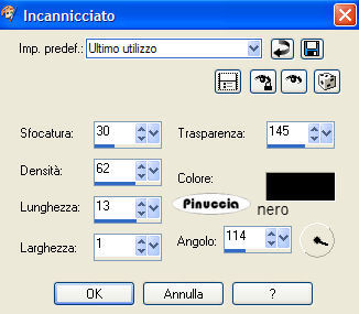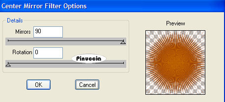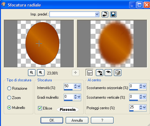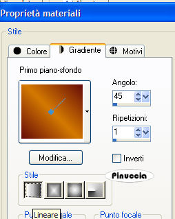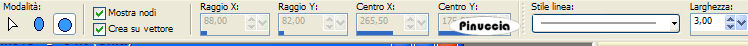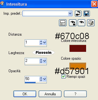 qui puoi trovare qualche risposta ai tuoi dubbi. Se l'argomento che ti interessa non è presente, ti prego di segnalarmelo. Il tube dell'Angelo è di Sassy Illusions ; il tube Stars and Moon è di JosDZigns Il testo usato in questo tutorial è stato fatto usando pennelli di lilbrokenangel. Questo tutorial è stato scritto con PSP 9, ma può essere eseguito anche con le altre versioni di PSP. Filtro: Dsb Flux qui Trama http://www.xtreme-psp.co.uk/Textures/textures.html qui (la seconda trama della prima riga). Tube Glitter e Stars http://www.ccountry.net/~gmimlost/JosDZigns.html (sul disegno del Globo clicca sulla scritta Enter; vai in fondo alla pagina successiva e clicca "Page 2"; qui clicca su Danglies. Quando appare la pagina Glitter and Stars, preleva il primo file). Materiale qui Font a scelta. 1. Apri il materiale e la trama in PSP, e minimizzali nella tua area di lavoro. Apri una nuova immagine trasparente 600 x 650 pixels. Imposta il colore di primo piano con #670C08, e il colore di sfondo con il nero: #000000. 2. Riempi l'immagine trasparente con il colore di sfondo.per riempire con il colore di sfondo, devi cliccare con il tasto destro del mouse. Livelli>Nuovo livello raster. Riempi il nuovo livello con il colore di primo piano.Livelli>Nuovo livello maschera>Da immagine. Apri il menu a tendina sotto la finestra di origine e seleziona la trama Ms_Texture_02: Luminanza di origine selezionato; inverti dati della maschera NON selezionato: ![]() 3. Livelli>Unisci>Unisci gruppo. Livelli>Unisci>Unisci visibile. Effetti>Effetti di bordo>Aumenta di più. Apri il tube SassyIllusions_FantasyBeauty e vai a Modifica>Copia. Torna al tuo lavoro e vai a Modifica>Incolla>Incolla come nuovo livello. Sposta il tube in basso a destra.![]() 4. Regola>Messa a fuoco>Maschera di contrasto, con i seguenti settaggi. ![]() 5. Cambia il colore di sfondo con #D57901, e passa il colore a Gradiente di primo piano/sfondo, con i seguenti settaggi: ![]() ![]() 6. Attiva il livello di sfondo (uniti). Attiva lo strumento Forme - Ellisse ![]() con i seguenti settaggi: ![]() Per chi usa versioni precedenti alla PSP 9 senza la forma Ellisse: attiva lo strumento Forme predefinite e seleziona Ellisse.7. Disegna un cerchio all'esterno dell'angelo, partendo dall'angolo in alto a sinistra della tag. ti consiglio di partire dal punto esterno che hai scelto per iniziare la forma: ![]() e poi di allargare la forma quanto necessario: ![]() Livelli>Converti in livello raster. Effetti>Effetti di trama>Intessitura, con i seguenti settaggi: colore intessitura #670C08; colore spazio #D57901; riempi spazi selezionato: ![]() 8. Effetti>Effetti 3D>Sfalsa ombra, con i seguenti settaggi, colore nero, 2 volte. ![]() 9. Livelli>Duplica. Attiva il livello originale del cerchio. Regola>Sfocatura>Sfocatura radiale, con i seguenti settaggi: ![]() Per chi usa versioni precedenti senza la Sfocatura Radiale: Regola>Sfocatura>Sfocatura gaussiana, raggio 30. 10. Effetti>Plugins>Dsb Flux - Center Mirror, con i seguenti settaggi: ![]() Abbassa l'opacità di questo livello al 50%. Effetti>Effetti di bordo>Aumenta. 11. Attiva lo strumento Forme Rettangolo , con i seguenti settaggi:![]() per le versioni precedenti di PSP: attiva lo strumento Forme Predefinite e seleziona Rettangolo.Disegna un rettangolo sul lato sinistro della tag. Il mio punto di partenza è stato 0,105 fino a 200,185. ![]() per vedere il rettangolo, togli momentaneamente (ricordati poi di riaprirli) la visibilità ai livelli che stanno sopra questo livello. 12. Livelli>Converti in livello raster. Questo livello del rettangolo dovrebbe trovarsi sopra il livello del cerchio con il Center Mirror, e sotto il livello del cerchio. Effetti>Effetti di trama>Intessitura, con i settaggi precedenti. ![]() Effetti>Effetti 3D>Sfalsa ombra, con i settaggi usati al punto 8. ![]() Livelli>Duplica. Immagine>Capovolgi. Dovresti avere questo: ![]() 13. Attiva il livello superiore del cerchio. Apri il file "brokenangel_text" e vai a Modifica>Copia. Torna al tuo lavoro e vai a Modifica>Incolla>Incolla come nuovo livello. Posiziona il testo a sinistra del cerchio, vedi l'esempio finale.Cambia la modalità di miscelatura di questo livello in Moltiplica, e abbassa l'opacità all'80%. 14. Apri il tube Glitter and Stars. Attiva il livello Black/Gold Moon/Stars e vai a Modifica>Copia. Torna al tuo lavoro e vai a Modifica>Incolla>Incolla come nuovo livello. Immagine>Ridimensiona, al 45%, bicubica, tutti i livelli non selezionato. ![]() Sposta questo tube sul lato sinistro della tag.Nella paletta dei livelli trascina questo livello sotto quelli dei rettangoli. ![]() Cambia la modalità di miscelatura di questo livello in Filtra. Regola>Messa a fuoco>Metti a fuoco. 15. Apri il tube "brokenangel_lonely text" e vai a Modifica>Copia. Torna al tuo lavoro e vai a Modifica>Incolla>Incolla come nuovo livello. Posiziona questo testo sul rettangolo in alto (vedi la tag finale).Apri il tube "brokenangel_pain text" e vai a Modifica>Copia. Torna al tuo lavoro e vai a Modifica>Incolla>Incolla come nuovo livello. Sposta questo testo sul rettangolo in basso (vedi la tag finale).16. Immagine>Aggiungi bordatura, 2 pixels, simmetriche, con il colore #D57901. Modifica>Copia (in questo modo avrai la tua tag in memoria). Immagine>Aggiungi bordatura, 30 pixels, simmetriche, con il colore #FFFFFF. Seleziona il bordo bianco con la bacchetta magica , sfumatura e tolleranza 0:![]() Modifica>Incolla>Incolla nella selezione. Mantieni selezionato. Regola>Sfocatura>Sfocatura gaussiana, raggio 30. ![]() Effetti>effetti di trama>Incannicciato, con i seguenti settaggi: ![]() Effetti>Effetti di bordo>Aumenta. Selezione>Nessuna selezione. 17. Apri il tube "brokenangel_corner overlay" e vai a Modifica>Copia. Torna al tuo lavoro e vai a Modifica>Incolla>Incolla come nuovo livello. E' già correttamente posizionato. Livelli>Unisci>Unisci tutto (appiattisci). Immagine>Aggiungi bordatura, 1 pixel, simmetriche, con il colore #D57901. Aggiungi un testo 