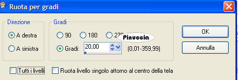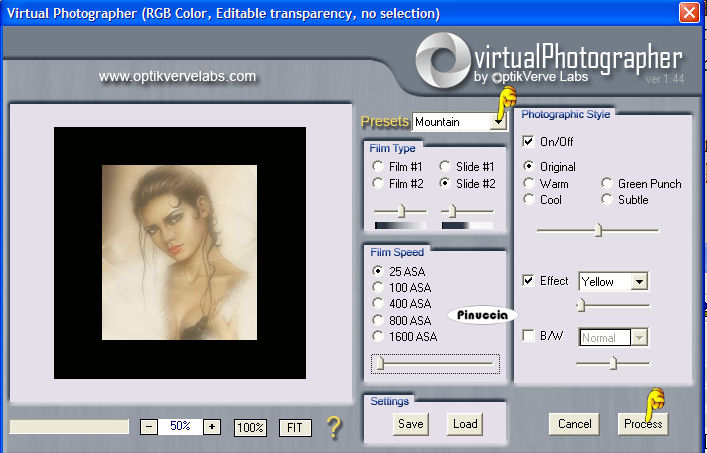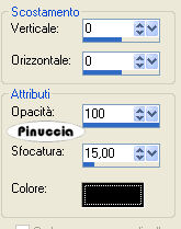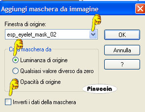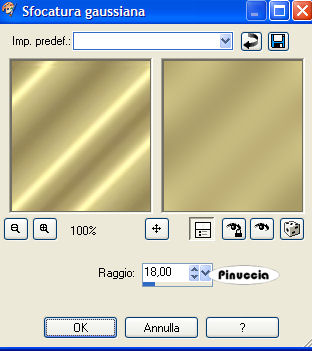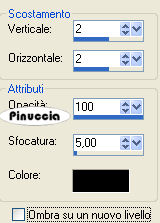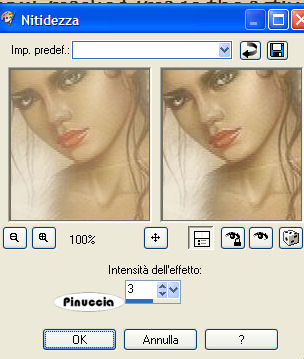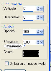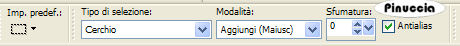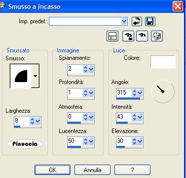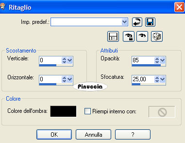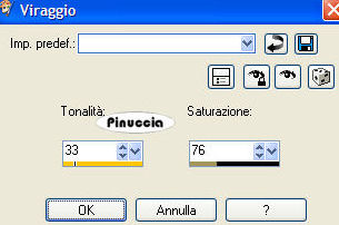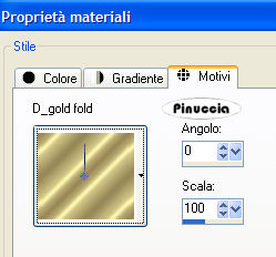 qui puoi trovare qualche risposta ai tuoi dubbi. Se l'argomento che ti interessa non è presente, ti prego di segnalarmelo. Questo tutorial è stato scritto con PSP 8, ma può essere eseguito anche con le altre versioni di PSP. Per tradurlo, l'ho eseguito con PSP 9. Occorrente: materiale qui La maschera usata per questo tutorial viene da Esp Concepts Un ringraziamento anche a Michelle che ha permesso del suo delizioso tube della farfalla per questo tutorial. La farfalla che si trova nello zip è stata ridimensionata, non è nella sua dimensione originale. Filtri: Xero - Porcelain qui Virtual Photographer qui Font a scelta. 1. Apri tutto il materiale in PSP. Con shift+D fai una copia dell'immagine e dei tubes e chiudi gli originali. Per il momento, minimizza tutto. Imposta il colore di primo piano con il nero (#000000). Imposta il colore di sfondo su Motivi. Apri il menu cliccando sulla freccia a fianco del box e seleziona il motivo goldfold, con i seguenti settaggi: ![]() 2. Apri una nuova immagine trasparente 500 x 500 pixels. Riempi l'immagine trasparente con il colore di primo piano.Livelli>Nuovo livello raster. Riempi il nuovo livello con il pattern oro.Regola>Sfocatura>Sfocatura gaussiana, raggio 18. ![]() 3. Livelli>Nuovo livello maschera>Da immagine, apri il menu sotto la finestra di origine e seleziona esp_eyelet_mask_02.jpg, con i seguenti settaggi: ![]() Livelli>Elimina, e rispondi sì alla finestra con la domanda "Unire la maschera nel livello corrente?". ![]() 4. Effetti>Effetti 3D>Sfalsa ombra, con i seguenti settaggi, colore nero: ![]() 5. Livelli>Unisci>Unisci gruppo. Livelli>Unisci>Unisci visibile. Regola>Messa a fuoco>Metti a fuoco. Attiva lo strumento Selezione , cerchio, con i seguenti settaggi.![]() Posiziona il cursore al centro dell'immagine (250x;250y) e traccia un cerchio all'interno della maschera: ![]() Osserva la linea scura della selezione: è il punto dove dovresti fermarti. 6. Premi sulla tastiera il tasto canc. ![]() Non deselezionare. Selezione>Modifica>Espandi, di 2 pixels. Riempi la selezione con il motivo oro.Selezione>Modifica>Contrai, di 4 pixels. Premi sulla tastiera il tasto CANC. Mantieni selezionato. 7. Selezione>Inverti. Effetti>Effetti 3D>Sfalsa ombra, con i seguenti settaggi, colore nero: ![]() Selezione>Nessuna selezione. 8. Attiva il grafico incluso nel materiale (beautyseengraphic) e vai a Modifica>Copia. Torna al tuo lavoro e vai a Modifica>Incolla>Incolla come nuovo livello. Livelli>Disponi>Sposta giù. 9. Effetti>Plugins>Optikverve Labs>Virtual Photographer, apri il menu delle impostazioni e seleziona il preset Mountain, quindi clicca Process. ![]() Regola>Luminosità e contrasto>Nititezza, intensità dell'effetto 3. ![]() 10. Effetti>Plugins>Xero - Porcelain, con i seguenti settaggi: ![]() 11. Livelli>Unisci>Unisci tutto (appiattisci). Attiva il tube del fiore (eyeletmaskflower). Immagine>Ridimensiona, al 35%, ricampionamento bicubica. Regola>Saturazione e tonalità>Viraggio ![]() 12. Modifica>Copia (adesso puoi chiudere il tube del fiore perchè non ti servirà più). Torna al tuo lavoro e vai a Modifica>Incolla>Incolla come nuovo livello. Sposta il fiore in alto, come si vede nella schermata:![]() 13. Effetti>Effetti 3D>Sfalsa ombra, con i seguenti settaggi, colore nero ![]() 14. Livelli>Duplica. Immagine>Rifletti. Nascondi il livello inferiore e attiva uno dei due livelli del fiore. Livelli>Unisci>Unisci visibile. Livelli>Duplica. Immagine>Capovolgi. Livelli>Unisci>Unisci visibile. 15. Attiva il tube della farfalla (butterflygemmic). Regola>Saturazione e Tonalità>Viraggio, con i settaggi precedenti. ![]() Modifica>Copia (adesso puoi chiudere il tube della farfalla, perchè non ti servirà più). Torna al tuo lavoro e vai a Modifica>Incolla>Incolla come nuovo livello. Sposta la farfalla tra i due fiore in basso.Effetti>Effetti 3D>Sfalsa ombra, con gli stessi settaggi usati per il fiore: ![]() Immagine>Ruota>Ruota per gradi, 20 gradi a destra. ![]() Regola>Messa a fuoco>Metti a fuoco. 16. Livelli>Unisci>Unisci tutto (appiattisci). Immagine>Aggiungi bordatura, 3 pixels, simmetriche, con il colore bianco. Seleziona il bordo con la bacchetta magica (tolleranza e sfumatura 0),e riempilo con il motivo oro.Effetti>Effetti 3D>Smusso a incasso, con i seguenti settaggi: ![]() 17. Selezione>Inverti. Effetti>Effetti 3D>Ritaglio, con i seguenti settaggi, colore nero. ![]() Selezione>Nessuna selezione. 18. E' ora di aggiungere il testo. Livelli>Nuovo livello raster. Chiudi il colore di primo piano. Colore di sfondo dovrebbe essere ancora impostato con il motivo oro. Sotto i settaggi che ho usato per la mia tag: Font LoversQuarrel , dimensione 48, mobile, bold, nitido. ![]() Scrivi il tuo testo e posizionalo. Effetti>effetti 3D>Sfalsa ombra, con i seguenti settaggi, colore nero. ![]() Per scrivere il mio nome ho cambiato la dimensione a 60. 19. Livelli>Unisci>Unisci tutto (appiattisci). Ridimensiona la tag, se necessario usando il ricampionamento bicubica e salva nel formato che preferisci. ![]() ![]() Se hai problemi o dubbi, o trovi un link non funzionante, o anche soltanto per un saluto, scrivimi 21 Marzo 2007 |