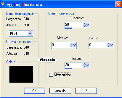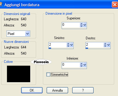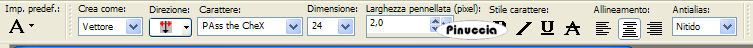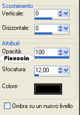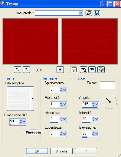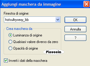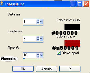 qui puoi trovare qualche risposta ai tuoi dubbi. Se l'argomento che ti interessa non è presente, ti prego di segnalarmelo. Questo tutorial è stato scritto con PSP 8, ma può essere eseguito anche con le altre versioni di PSP. Per tradurlo, l'ho eseguito con PSP 9. Occorrente: Materiale qui Il tube è di NightAngel. Font Pass the Chex qui 1. Apri il materiale in PSP e minimizzalo nella tua area di lavoro. Imposta il colore di primo piano con #A50001, e il colore di sfondo con il nero (#000000). 2. Apri una nuova immagine trasparente 640 x 500 pixels. Riempi l'immagine trasparente con il colore di primo piano.Livelli>Nuovo livello raster. Riempi il nuovo livello con il colore di sfondo.per riempire con il colore di sfondo clicca con il tasto destro del mouse. Livelli>Nuovo livello maschera>Da disco. Apri il menu a tendina sotto la Finestra di origine, e seleziona la maschera hotsultrysexy_bb, con i seguenti settaggi: ![]() 3. Livelli>Unisci>Unisci gruppo. NON andare ancora a Livelli>Unisci>Unisci visibile. Dovresti avere due livelli, e il livello superiore nero deve essere quello attivo. Effetti>Effetti di trama>Intessitura, con i seguenti settaggi: ![]() 4. Facoltativo: Applica un leggero effetto di trama al livello rosso della maschera. Sotto l'effetto che ho usato io: ![]() Livelli>Unisci>Unisci visibile. Attiva il tube e vai a Modifica>Copia. Torna al tuo lavoro e vai a Modifica>Incolla>Incolla come nuovo livello. Immagine>Ridimensiona, due volte all'85% e una volta al 95%, tutti i livelli non selezionato, ricampionamento bicubica. ![]() Posiziona il tube come mostrato nell'esempio finale.Effetti>Effetti 3D>Sfalsa ombra, con i seguenti settaggi, colore nero. ![]() 5. Attiva il tube "hot and sultry screws" e vai a Modifica>Copia. Torna al tuo lavoro e vai a Modifica>Incolla>Incolla come nuovo livello. Livelli>Unisci>Unisci visibile. 6. Immagine>Aggiungi bordatura, simmetriche, non selezionato, con il colore nero (#000000): ![]() 7. Attiva lo Strumento Bacchetta magica ![]() (modalità Aggiungi, tolleranza e sfumatura 0). e clicca sui bordi per selezionarli. Effetti>Effetti di trama>Intessitura, con gli stessi settaggi del passo 3. Selezione>Nessuna selezione. 8. Immagine>Aggiungi bordatura, simmetriche non selezionato, con il colore nero (#000000). ![]() 9. Aggiungi delle decorazioni o dei pennelli alla tag, come preferisci. Io ho aggiunto delle frecce usando i pennelli di Leo da Jigsaw Puzzle. 10. E' il momento di aggiungere il testo alla tag. Nella schermata sotto i settaggi che ho usato io per la mia tag. ![]() Colore di primo piano #A50001; colore di sfondo nero #000000. 11. Scrivi il tuo testo e posizionalo sulla tag. Livelli>Converti in livello raster. Effetti>Effetti 3D>SFalsa ombra, con i seguenti settaggi,colore nero. ![]() 12. Livelli>Unisci>Unisci tutto (appiattisci). Ridimensiona, se necessario, e salva nel formato che preferisci. ![]() Se hai problemi o dubbi, o trovi un link non funzionante, o anche soltanto per un saluto, scrivimi. 11 Aprile 2007 |