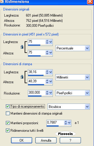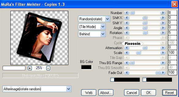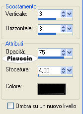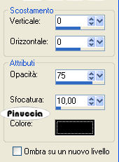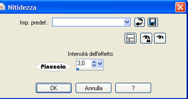 qui puoi trovare qualche risposta ai tuoi dubbi. Se l'argomento che ti interessa non è presente, ti prego di segnalarmelo. Questo tutorial è stato creato con PSP 9, ma può essere eseguito anche con le altre versioni di PSP. Per tradurlo, l'ho eseguito con PSP X. Occorrente: Materiale qui La foto è stata ricevuta tramite un gruppo di grafica; l'artista o il fotografo è sconosciuto. Font a scelta. Dozi's dangling alpha http://www.dozibaer.com/eigenesweb5-scrap/alphas2/katzerl's-alphas2-page-04.htm qui Filtro Mura's Meister - Copies qui 1. Apri tutto il materiale in PSP. Minimizza tutto, tranne la foto che userai per la tag. Shift+D per duplicare la foto. Chiudi l'originale e continua a lavorare sulla copia. Immagine>Ridimensiona, al 75%, tutti i livelli selezionato, ricampionamento bicubica. ![]() se vuoi usare altre immagini, dovrai ridimensionarle secondo la loro misura. 2. Imposta il colore di primo piano con il bianco #ffffff, e il colore di sfondo con il nero #000000. ![]() Immagine>Aggiungi bordatura, 25 pixels, simmetriche, con il colore di sfondo. per riempire con il colore di sfondo, devi cliccare con il tasto destro del mouse Livelli>Innalza livello di sfondo. Immagine>Dimensione tela. Cambia la larghezza a 750 pixels e l'altezza a 700 pixel, poi clicca sulla freccia al centro per distribuire equamente lo spazio. ![]() 3. Livelli>Nuovo livello raster. Riempi questo livello con il colore bianco di primo piano.Livelli>Disponi>Sposta sotto. Attiva il livello dell'immagine. ![]() Immagine>Ridimensiona, al 90%, tutti i livelli non selezionato, ricampionamento bicubica. ![]() Livelli>Duplica, per avere un'altra copia del livello. Attiva il livello originale. Immagine>Ruota>Ruota per gradi, 15 gradi a destra, tutti i livelli non selezionato. ![]() 4. Il livello ruotato dell'immagine dovrebbe essere ora il tuo livello attivo. Effetti>Plugins>Mura's Meister - Copies, con i seguenti settaggi: ![]() 5. Abbassa l'opacità di questo livello al 50%. ![]() Attiva il tube napier_dotaccent e vai a Modifica>Copia. Torna al tuo lavoro e vai a Modifica>Incolla>Incolla come nuovo livello. Sposta questo tube nell'angolo in alto a sinistra dell'immagine ruotata,(vedi l'esempio). ![]() 6. Immagine>Ruota>Ruota per gradi, ruota l'angolo punteggiato 15 gradi a sinistra, tutti i livelli non selezionato: ![]() 7. Livelli>Duplica. Immagine>Rifletti. Immagine>Capovolgi. Adesso dovresti avere un angolo punteggiato nell'angolo in basso a destra della tua immagine ruotata. ![]() Attiva il tube napier_squares e vai a Modifica>Copia. Torna al tuo lavoro e vai a Modifica>Incolla>Incolla come nuovo livello. Sposta questo tube nell'angolo in basso a sinistra.Livelli>Duplica. Immagine>Capovolgi. Immagine>Rifletti. ![]() 8. Attiva il livello superiore della foto. ![]() Effetti>Effetti 3D>Sfalsa ombra, con i seguenti settaggi, colore nero. ![]() 9. Apri il tube napier_alonetext e vai a Modifica>Copia. Torna al tuo lavoro e vai a Modifica>Incolla>Incolla come nuovo livello. Sposta il testo all'interno della foto,vedi l'esempio finale. Apri il tube dangling alpha (il n. 5 della serie). Attiva lo strumento Selezione e seleziona il ciondolo con il cuore.Modifica>Copia. Torna al tuo lavoro e vai a Modifica>Incolla>Incolla come nuovo livello. Immagine>Ridimensiona, una volta al 35%, e una volta al 55%, tutti i livelli non selezionato. Regola>Messa a fuoco>Metti a fuoco. Effetti>Effetti 3D>Sfalsa ombra, con i settaggi precedenti. 10. Apri il tube napier_diamond e vai a Modifica>Copia. Torna al tuo lavoro e vai a Modifica>Incolla>Incolla come nuovo livello. Sposta questo tube al centro dell'anello del ciondolo.11. Aggiungi il tuo nome e posizionalo sul lato sinistro della tag. Io ho usato il font TrapperJohn , dimensione 60, vettore, antialias selezionato. colore di sfondo nero: dovrai regolare la dimensione, a seconda della lunghezza del testo e della versione di PSP che stai usando. I pixels di PSP 9 sono differenti dai pixels di PSP X. Su questa differenze, vedi alcuni appunti in fondo a questa pagina Livelli>Converti in livello raster. Effetti>Effetti 3D>Sfalsa ombra, con i seguenti settaggi, colore nero: ![]() 12. Elimina il livello bianco di sfondo. Livelli>Unisci>Unisci visibile. Regola>Luminosità e contrasto>Nitidezza, 3. ![]() Selezione>Seleziona tutto. Selezione>Mobile. Selezione>Immobilizza. Immagine>Ritaglia la selezione. Livelli>Unisci>Unisci tutto (appiattisci). Ridimensiona l'immagine, se vuoi, e salva nel formato che preferisci. ![]() Se hai problemi o dubbi, o trovi un link non funzionante, o anche soltanto per un saluto, scrivimi 28 Giugno 2007 |