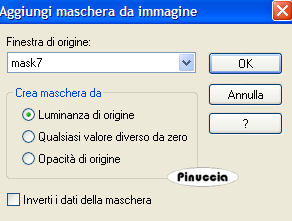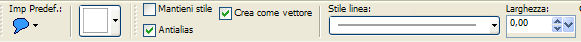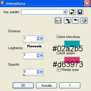 qui puoi trovare qualche risposta ai tuoi dubbi. Se l'argomento che ti interessa non è presente, ti prego di segnalarmelo. Questo tutorial è stato scritto con PSP 8, ma può essere eseguito anche con le altre versioni di PSP. Occorrente: Materiale qui Il tube è di NightAngel Font a scelta. Nota: Per questo tutorial ho usato la maschera "Mask7". Non ne conosco l'autore. Se è tua, fammelo sapere, in modo che possa darti credito. 1. Apri il materiale in PSP e minimizzalo nella tua area di lavoro. Imposta il colore di primo piano con #02A2B5, e il colore di sfondo con #D63973. 2. Apri una nuova immagine trasparente 640 x 560 pixels, e riempila con il colore di sfondo.per riempire con il colore di sfondo, devi cliccare con il tasto destro del mouse Livelli il nuovo livello con il colore di primo piano.3. Livelli>Nuovo livello maschera>Da immagine. Seleziona Mask7 dal menu a tendina sotto la finestra di origine. ![]() 4. Livelli>Unisci>Unisci gruppo. Livelli>Unisci>Unisci visibile. Inverti i colori nella paletta dei materiali, cliccando sulla freccia tra le due palette. Avrai così il blu impostato come colore di sfondo e il rosa come colore di primo piano. Chiudi il colore di primo piano (cliccando sul piccolo cerchio attraversato da una linea). ![]() Attiva lo strumento Forme predefinite , con i seguenti settaggi:![]() 5. Disegna, in alto, una lunga striscia attraverso la tag. Io ho fatto la mia larga circa 30 pixels, partendo da circa 0,30 e giù fino 640,60. ![]() Livelli>Converti in livello raster. Effetti>Effetti di trama>Intessitura, con i seguenti settaggi: ![]() Effetti>Effetti 3D>Sfalsa ombra, con i seguenti settaggi, colore nero: ![]() 7. Livelli>Duplica. Immagine>Ruota>Ruota per gradi, 90 gradi a sinistra, tutti i livelli non selezionato. ![]() 8. Attiva lo strumento Spostamento e sposta la striscia duplicata sul lato sinistro della tag.Posizionala a circa 35 pixels dal bordo sinistro. ![]() Attiva il tube polkadots_circle accent e vai a Modifica>Copia. Torna al tuo lavoro e vai a Modifica>Incolla>Incolla come nuovo livello. Sposta il tube sull'angolo superiore sinistro sopra la striscia.![]() 9. Attiva la Bacchetta magica e clicca al centro del cerchio per selezionarlo.Effetti>Effetti di trama>Intessitura, con i settaggi usati al passo 5. Selezione>Nessuna selezione. 10. Attiva il tube Brunette_Jeans_Girl_na e vai a Modifica>Copia. Torna al tuo lavoro e vai a Modifica>Incolla>Incolla come nuovo livello. Immagine>Ridimensiona, all'85%, tutti i livelli non selezionato, ricampionamento bicubica. ![]() 11. Effetti>Effetti 3D>Sfalsa ombra, con i settaggi precedenti. Attiva il livello di sfondo (il livello della maschera). Attiva polkadots_paper1 e vai a Modifica>Copia. Torna al tuo lavoro e vai a Modifica>Incolla>Incolla come nuovo livello. Posiziona la carta in modo che l'angolo sinistro si trovi sotto la striscia laterale.![]() Effetti>Effetti 3D>Sfalsa ombra, con i settaggi precedenti. 12. Attiva polkadots_paper2 e vai a Modifica>Copia. Torna al tuo lavoro e vai a Modifica>Incolla>Incolla come nuovo livello. Sposta questa carta sopra la carta blu.![]() Effetti>Effetti 3D>Sfalsa ombra, con i settaggi precedenti. 13. Attiva nuovamente il livello di sfondo. Attiva il tube the polkadots_tag e vai a Modifica>Copia. Torna al tuo lavoro e vai a Modifica>Incolla>Incolla come nuovo livello. Posiziona l'etichetta in alto in modo che i cordini rimangano sotto la striscia superiore.![]() Aggiungi il tuo nome alla tag. Io ho usato come colore di sfondo #02A2B5. 14. Livelli>Unisci>Unisci tutto (appiattisci). Immagine>Aggiungi bordatura, 3 pixels, simmetriche, con il colore bianco (#FFFFFF). Attiva la Bacchetta magica (tolleranza e sfumatura 0),e clicca sul bordo bianco per selezionarlo. Riempi la selezione con il colore #02A2B5.Mantieni selezionato. 15. Effetti>Effetti 3D>Smusso a incasso, con i seguenti settaggi: ![]() 16. Selezione>Nessuna selezione. Ridimensiona, se necessario, e salva nel formato che preferisci. ![]() Se hai problemi o dubbi, o trovi un link non funzionante, o anche soltanto per un saluto, scrivimi. 15 Aprile 2007 |