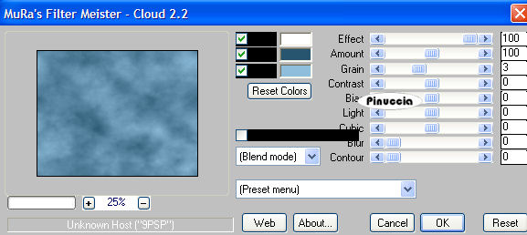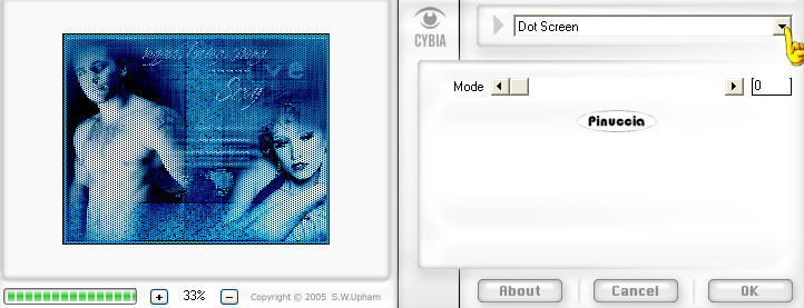 qui puoi trovare qualche risposta ai tuoi dubbi. Se l'argomento che ti interessa non è presente, ti prego di segnalarmelo. Il tube dell'uomo è di Monique42; il tube della donna è di JoLuvsDogs Questo tutorial è stato creato con PSP 9, ma può essere eseguito anche con le altre versioni di PSP. Occorrente: Filtri: Mura's Meister - Cloud qui Mura's Seamless qui Cybia Screenwork qui FM Tile Tools qui Materiale qui Font a scelta. 1. Apri tutto il materiale in PSP e minimizzalo nella tua area di lavoro. Imposta il colore di primo piano con #27556F, e il colore di sfondo con #8FBEDC. Apri una nuova immagine trasparente 700 x 550 pixels. 2. Riempi l'immagine trasparente con il colore di sfondo.per riempire con il colore di sfondo, devi cliccare con il tasto destro del mouse. Livelli>nuovo livello raster. Riempi il nuovo livello con il colore di primo piano.Livelli>Nuovo livello maschera. Apri il menu sotto la finestra di origine e seleziona la maschera c~mask36, con i seguenti settaggi: Luminanza di origine selezionato; inverti dati maschera non selezionato: ![]() 3. Livelli>Unisci>Unisci gruppo. Livelli>Unisci>Unisci visibile. Effetti>Plugins>FM Tile Tools - Blend Emboss, con i settaggi standard. ![]() 4. Apri il tube redglamour, e vai a Modifica>Copia. Torna al tuo lavoro e vai a Modifica>Incolla>Incolla come nuovo livello. Sposta questo tube nell'angolo in basso a destra.(vedi la tag finale). Cambia la modalità di miscelatura di questo livello in Luminanza (esistente). Apri il tube di Monique e vai a Modifica>Copia. Torna al tuo lavoro e vai a Modifica>Incolla>Incolla come nuovo livello. Immagine>Ridimensiona, al 120%, bicubica, tutti i livelli non selezionato. ![]() Posiziona l'uomo sul lato sinistro della tag.Cambia la modalità di miscelatura di questo livello in Luminanza (esistente). Livelli>Duplica. Cambia la modalità di miscelatura di questo duplicato in Filtra. ![]() un consiglio: collega i due livelli. In questo modo, se volessi spostare il tube, il duplicato si sposterà insieme al tube originale, ![]() 5. Livelli>nuovo livello raster. Attiva lo strumento Selezione , rettangolo, sfumatura 0,e traccia un rettangolo al centro della tag tra i due tubes (vedi la tag finale). ![]() Passa il colore di sfondo a Gradiente, con i seguenti settaggi: ![]() 6. Riempi la selezione con il gradiente.ricorda che il gradiente è impostato come colore di sfondo, quindi per riempire devi cliccare con il tasto destro del mouse. Selezione>Nessuna selezione. Cambia la modalità di miscelatura di questo livello in Luce diffusa. Effetti>Plugins>Cybia - Screenwork, apri il menu cliccando sulla freccia indicata dalla manina e seleziona Crescent Wave, con i seguenti settaggi: ![]() 7. Effetti>Effetti 3D>Sfalsa ombra, con i seguenti settaggi, colore nero: ![]() Io ho applicato questo Effetto due volte. 8. Duplica il livello della striscia (Livelli>Duplica), Immagine>Ruota>Ruota per gradi, 90 gradi a destra, tutti i livelli non selezionato. ![]() Sposta questa striscia in fondo alla tag con il bordo destro appoggiato al bordo destro della tag,e il bordo inferiore appoggiato al bordo inferiore della tag. ![]() Livelli>Duplica. Immagine>Rifletti. ![]() 9. Livelli>Nuovo livello raster. Effetti>Plugins>Mura's Meister - Copies, con i seguenti settaggi: ![]() 10. Effetti>Plugins>Mura's Seamless - Shift at Zigzag, con i seguenti settaggi: ![]() 11. Cambia la modalità di miscelatura del livello delle nuvole in Luce diffusa, e abbassa l'opacità al 66%. Livelli>Unisci>Unisci visibile. Regola>Messa a fuoco>Metti a fuoco. Livelli>Duplica. Cambia la modalità di miscelatura di questo duplicato in Rafforza, e abbassa l'opacità al 68%. Apri il tube "thingabout men_text" e vai a Modifica>Copia. Torna al tuo lavoro e vai a Modifica>Incolla>Incolla come nuovo livello. Sposta il testo in alto.Cambia la modalità di miscelatura di questo livello in Luminanza (esistente). 12. Immagine>Aggiungi bordatura, 1 pixel, simmetriche, con il colore #00003D. Immagine>Aggiungi bordatura, 7 pixels, simmetriche, con il colore #17A1CC. Seleziona questo bordo con la bacchetta magica ![]() ![]() Effetti>Plugins>Cybia - Screenworks, apri il menu dei preset e seleziona Dot Screen. ![]() Selezione>Nessuna selezione. 13. Immagine>Aggiungi bordatura, 1 pixel, simmetriche, con il colore #00003D. Apri il secondo tube di testo "thingaboutmen_text2" e vai a Modifica>Copia. Torna al tuo lavoro e vai a Modifica>Incolla>Incolla come nuovo livello. Sposta questo tube sul rettangolo in basso (vedi l'esempio della tag finale).Aggiungi il tuo testo o il nome nella striscia in basso. Sotto i settaggi che ho usato per il mio nome. ![]() Se non hai il font clicca qui 14. Quando hai scritto il tuo nome, vai a Livelli>Converti in livello raster. Aggiungi un Effetto Sfalsa ombra al testo, a tua scelta. Io ho usato questo: ![]() Cambia la modalità di miscelatura di questo livello in Sovrapponi. Livelli>Unisci>Unisci tutto (appiattisci). Salva nel formato che preferisci. ![]() Se hai problemi o dubbi, o trovi un link non funzionante, o anche soltanto per un saluto, scrivimi 5 Agosto 2007 |
