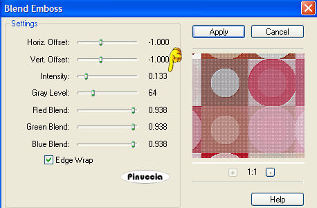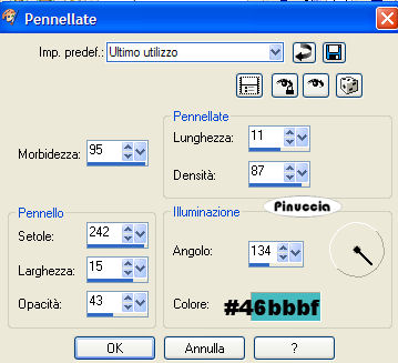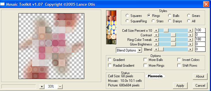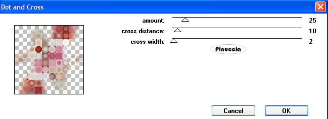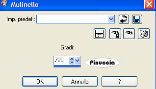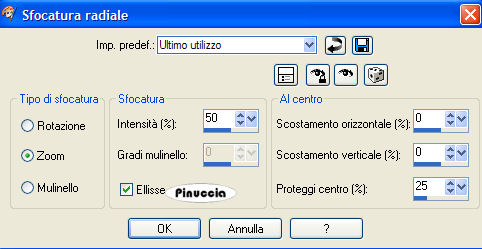 qui puoi trovare qualche risposta ai tuoi dubbi. Se l'argomento che ti interessa non è presente, ti prego di segnalarmelo. Questo tutorial è stato scritto con PSP X, ma può essere eseguito anche con le altre versioni di PSP. Occorrente: Materiale qui Il tube è di Serena (grazie Serena per aver permesso l'uso dei tuoi tubes). Filtri: FM Tile Tools qui Photo-Plugins - Soft Focus qui Penta.com - dot and cross qui Lotis Filters - Mosaic Toolkit qui 1. Apri il tuo materiale in psp. Minimizza, per il momento, il tube "overlay". Metti il file "edge mask 04" nella cartella Cornici-immagine di PSP. Fai una copia del tube della donna con shift+D e chiudi l'originale, che potrai usare in altre occasioni. 2. Attiva il tube della donna e cancella il livello del watermark. Immagine>Dimensione tela, 680x680 pixels, e clicca sulla freccia al centro: ![]() Livelli>Nuovo livello raster. Riempi il nuovo livello con il colore #FFFFFF.Livelli>Disponi>Porta sotto. 3. Con il livello del tube attivo, vai a Livelli>Duplica. Nascondi il livello duplicato e attiva il livello originale del tube. Effetti>Effetti di distorsione>Mulinello, raggio 720. ![]() 4. Regola>Sfocatura>Sfocatura radiale, con i seguenti settaggi. ![]() 5. Con lo strumento Spostamento , posiziona il tube sul lato sinistro della tag.Livelli>Duplica. Immagine>Rifletti. Immagine>Capovolgi. Livelli>Unisci>Unisci giù. Effetti>Sfocatura>Sfocatura radiale, con i settaggi precedenti. 6. Effetti>Effetti tecniche di disegno>Pennellate, con i seguenti settaggi: Nota: questo potrebbe sembrare un passaggio inutile, ma aiuta a migliorare l'aspetto della tag. ![]() 7. Effetti>Plugins>Lotis Filters - Mosaic Toolkit, con i seguenti settaggi: ![]() 8. Effetti>Plugins>Penta.com - Dot and Cross, con i seguenti settaggi: ![]() 9. Effetti>Plugins>FM Tile Tools - Blend Emboss, con i settaggi standard, eccetto il valore Intensity che deve essere impostato su 0.133. ![]() 10. Attiva il tube wickedlysexy_overlay e vai a Modifica>Copia. Torna al tuo lavoro e vai a Modifica>Incolla come nuovo livello. Togli la X dal livello del duplicato per renderlo nuovamente visibile. Effetti>Effetti 3D>Sfalsa ombra, con i seguenti settaggi, colore nero: ![]() 11. Livelli>Unisci>Unisci visibile. Effetti>Plugin Filters>Photo-Plugins - Soft Focus, con i seguenti settaggi: ![]() 12. E' il momento di aggiungere il tuo nome alla tag. Imposta il colore di primo piano con il bianco #ffffff e il colore di sfondo con #C86D6A. Attiva lo strumento Testo e seleziona il font.Nella schermata sotto i settaggi che ho usato per il mio testo. ![]() dovrai regolare la dimensione, a seconda della lunghezza del testo e della versione di PSP che stai usando. 13. Scrivi il tuo nome o il testo che preferisci, quindi clicca Applica. Immagine>Ruota per gradi, 90 gradi a sinistra. ![]() 14. Livelli>Converti in livello raster. Posiziona il tuo testo, vedi la tag finale.Effetti>Effetti 3D>Sfalsa ombra, con i seguenti settaggi,colore nero. ![]() 15. Livelli>Unisci>Unisci visibile. Immagine>Cornice-immagine, seleziona Edge Brush 04, con i seguenti settaggi: ![]() 16. Livelli>Unisci>Unisci tutto (appiattisci). Ridimensiona, se necessario, e salva nel formato che preferisci. ![]() Se hai problemi o dubbi, o trovi un link non funzionante, o anche soltanto per un saluto, scrivimi 11 Aprile 2007 |