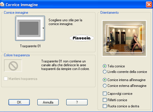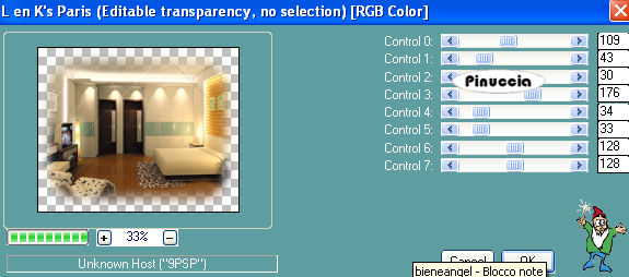 qui puoi trovare qualche risposta ai tuoi dubbi. Se l'argomento che ti interessa non è presente, ti prego di segnalarmelo. Questo tutorial è stato scritto e tradotto con PSP X2, ma può essere eseguito anche con le altre versioni di PSP. Per tradurlo, ho usato PSP X. Un ringraziamento agli artisti che hanno creato il materiale usato in questo tutorial. Occorrente: Materiale qui 1. Apri una nuova immagine trasparente 550 x 450 pixels, e riempila con il colore #b3a586.2. Livelli>Nuovo livello raster. Selezione>Seleziona tutto. Apri "1517 home 6 AR" e vai a Modifica>Copia. Torna al tuo lavoro e vai a Modifica>Incolla nella selezione. Selezione>Deseleziona. Livelli>Unisci>Unisci visibile. Livelli>Duplica. Chiudi il livello duplicato e attiva il livello inferiore. Effetti>Plugins>Jeux de lignes - Entrelacement: ![]() Riapri e attiva il livello superiore. Effetti>Plugins>L & K's Paris: ![]() Abbassa l'opacità al 90%. Livelli>Unisci>Unisci tutto. 3. Apri il tube della donna "reto%20zen3", e vai a Modifica>copia. Immagine>Ridimensiona, una volta al 50% e una volta al 90%, tutti i livelli non selezionato. Posiziona la donna sul letto.4. Apri il tube dell'uomo e vai a Modifica>Copia. Torna al tuo lavoro e vai a Modifica>Incolla come nuovo livello. Immagine>Rifletti. Immagine>Ridimensiona, al 60%, tutti i livelli non selezionato. Posiziona il tube come nel mio esempio.Regola>Rimozione disturbo fotocamera digitale. Effetti>Effetti 3D>Sfalsa ombra, con i seguenti settaggi. ![]() 5. Immagine>Cornice immagine: seleziona la cornice Trasparente 1: ![]() 6. Apri il tube di testo "MaryAlice Love is WordArt", e vai a Modifica>Copia. Torna al tuo lavoro e vai a Modifica>Incolla come nuovo livello. Immagine>Ridimensiona, al 35%, tutti i livelli non selezionato. Posiziona il testo come nel mio esempio.Aggiungi il tuo nome e/o il tuo watermark e salva in formato jpg. ![]() Se hai problemi o dubbi, o trovi un link non funzionante, o anche soltanto per un saluto, scrivimi. 2 Maggio 2008 |