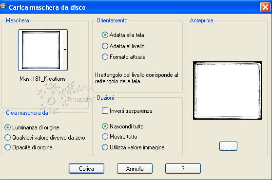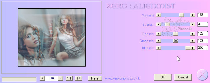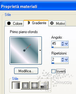qui puoi trovare qualche risposta ai tuoi dubbi. Se l'argomento che ti interessa non è presente, ti prego di segnalarmelo. Questo tutorial è stato creato con PSP X2, ma può essere eseguito anche con le altre versioni di PSP, anche se viene usato un effetto non presente nelle versioni fino alla X. Per tradurlo, ho usato PSP X. Il materiale usato per questo tutorial è stato reperito in diversi siti della rete. Per favore, rispetta il lavoro degli autori, e non alterare il materiale. Occorrente: Materiale qui Filtri: Xero - Alien Mist qui Filters Unlimited qui Andrew's Filters 1 qui I filtri Factory Gallery per essere usati devono prima essere convertiti. Come fare vedi qui Si usano importandoli in Filters Unlimited (come fare vedi qui) ma possono funzionare anche da soli 1. Apri una nuova immagine trasparente 700 x 600 pixels. Imposta il colore di primo piano con #527b84, e il colore di sfondo con #fff7ff. Passa il colore di primo piano a Gradiente lineare: ![]() Riempi l'immagine trasparente con il gradiente.Apri il tube Suzi Sgai SS_1358 e vai a Modifica>copia. Torna al tuo lavoro e vai a Modifica>Incolla come nuovo livello. Effetti>Effetti di immagine>Motivo unico, con i settaggi standard. ![]() Regola>Sfocatura>Sfocatura gaussiana, raggio 30. ![]() Abbassa l'opacità di questo livello al 53%. Livelli>Unisci>Unisci visibile. Effetti>Plugins>Filters Unlimited 2.0 - Andrew's Filter 1 - Breaking Away: ![]() 2. Livelli>Duplica. Immagine>Rifletti. Immagine>Capovolgi. Abbassa l'opacità di questo livello al 50%. Duplica l'immagine usando sulla tastiera la combinazione di tasti maiuscola+D e minimizza la copia. Continua a lavorare sull'originale. Modifica>Incolla come nuovo livello (il tube SS_1358 dovrebbe essere ancora in memoria; se così non fosse copialo nuovamente). Sposta il tube a destra.Livelli>Disponi>Sposta giù. Apri il tube Suzi Sgai SS_1356 e vai a Modifica>Copia. Torna al tuo lavoro e vai a Modifica>Incolla come nuovo livello. Immagine>Rifletti. Immagine>Ridimensiona, all'85%, tutti i livelli non selezionato. Sposta il tube a sinistra, vedi il mio esempio.Livelli>Unisci>Unisci visibile. Effetti>Plugins>Xero - Alien Mist: ![]() Modifica>Copia. 3. Attiva l'immagine che hai duplicato prima. Livelli>Nuovo livello raster. Riempi il livello con il gradiente.Livelli>Carica/Salva maschera>Carica maschera da disco. Cerca e carica la maschera Mask181_Kreations: ![]() Livelli>Unisci>Unisci gruppo. Effetti>Effetti 3D>Sfalsa ombra, con i seguenti settaggi, colore nero. ![]() Modifica>Incolla come nuovo livello. Immagine>Ridimensiona, al 90%, tutti i livelli non selezionato. ![]() Apri il file con il testo "imagen43". Questo file ha due testi su due livelli separati. Uno alla volta attiva il livello e vai a Modifica>Copia. Torna al tuo lavoro e vai a Modifica>Incolla come nuovo livello. Posiziona i due testi come nel mio esempio.Immagine>Aggiungi bordatura, 4 pixels, simmetriche, con il colore #fff7ff. Aggiungi il tuo nome e/o il tuo watermark e salva in formato jpg. ![]() Se hai problemi o dubbi, o trovi un link non funzionante, o anche soltanto per un saluto, scrivimi. 15 Giugno 2009 |