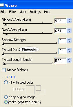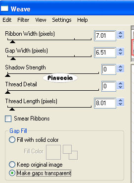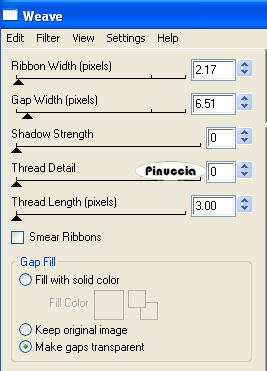 qui puoi trovare qualche risposta ai tuoi dubbi. Se l'argomento che ti interessa non è presente, ti prego di segnalarmelo. Questo tutorial è stato scritto e tradotto con PSP X, ma può essere eseguito anche con le altre versioni di PSP. Il materiale usato per questo tutorial è stato preso da differenti siti, per favore rispetta il lavoro degli autori e non cambiare il nome dei files. Occorrente: Materiale qui Filtri: L & K - Frederiek qui FM Tile Tools - Blend Emboss qui Xero - Porcelain qui Eye Candy 4000 qui Ti servirà anche Animation Shop qui ![]() 1. Imposta il colore di primo piano con #efdfc7, e il colore di sfondo con #6181bc. Apri una nuova immagine trasparente 580 x 450 pixels, e riempila con il colore di primo piano #efdfc7.Livelli>Nuovo livello raster. Riempi con il colore di sfondo #6181bc.Cambia la modalità di miscelatura di questo livello in Luminanza (esistente). Effetti>Plugins>L&K Frederiek: ![]() 2. Apri il tube IoM Graphics_LandScape e vai a Modifica>Copia. Torna al tuo lavoro e vai a Modifica>Incolla come nuovo livello. Sposta il tube a sinistra.Attiva lo strumento Puntatore ![]() deformazione se stai usando PSP 9,e "tira" il tube per riempire tutta l'altezza della tela. ![]() 3. Cambia la modalità di miscelatura di questo livello in Luminanza (Esistente). Effetti>Plugins>FM TIle Tools - Blend Emboss, con i settaggi standard. ![]() Apri il tube con le nuvole ryp_cloud_05. Attiva lo strumento Selezione a mano libera ![]() seleziona una nuvola e vai a Modifica>Copia. Torna al tuo lavoro e vai a Modifica>Incolla come nuovo livello. Posiziona la nuvola in alto, vedi il mio esempio.Ripeti il passaggio per aggiungere altre nuvole e, quando hai finito, chiudi i tre livelli inferiori e vai a Livelli>Unisci>Unisci visibile. Effetti>Plugins>FM Tile Tools - Blend Emboss, con i settaggi standard. Cambia la modalità di miscelatura di questo livello in Luminanza (Esistente), e abbassa l'opacità al 70%. Apri il tube Mariel abstract06t e vai a Modifica>Copia. Torna al tuo lavoro e vai a Modifica>Incolla come nuovo livello. Sposta il tube a destra (vedi il mio esempio).Livelli>Duplica. Immagine>Rifletti. Livelli>Unisci>Unisci giù. Cambia la modalità di miscelatura di questo livello in Luminanza (esistente). Apri il tube aclis_angel_angela e vai a Modifica>Copia. Torna al tuo lavoro e vai a Modifica>Incolla come nuovo livello. Immagine>Rifletti. Posiziona il tube in basso.Attiva il livello delle nuvole. Livelli>Disponi>Porta in alto. Apri il file di testo Wordart-childrenAngelse vai a Modifica>Copia. Torna al tuo lavoro e vai a Modifica>Incolla come nuovo livello. Posiziona il testo in alto a destra.Immagine>Aggiungi bordatura, 3 pixels, simmetriche, con il colore #7c6a5a. Immagine>Aggiungi bordatura, 30 pixels, simmetriche, con il colore #f8e8d0. Seleziona questo bordo con la bacchetta magica ![]() Effetti>Plugins>L&K Frederiek, con i settaggi precedenti. Selezione>Deseleziona. Immagine>Aggiungi bordatura, 3 pixels, simmetriche, con il colore #7c6a5a. Effetti>Plugins>Xero - Porcelain, con i settaggi standard. ![]() Aggiungi il tuo nome e/o il tuo watermark. 4. Animazione. Attiva lo strumento Selezione a mano libera , da punto a punto,e seleziona il cerchio tra le mani dell'angelo, pressappoco come nell'esempio. ![]() Livelli>Duplica, 3 volte. Avrai un totale di 4 livelli. Attiva il livello della prima copia. Effetti>Eye Candy 4000 - HBS Noise, con i settaggi standard. Ripeti l'Effetto HBS Noise, sui livelli della seconda e della terza copia, con gli stessi settaggi, ma cliccando ogni volta su Random Seed. Attiva nuovamente il livello della prima copia. Effetti>Plugins>Eye Candy 4000 - Weave, con i seguenti settaggi: ![]() 5. Attiva il livello della seconda copia. Ripeti l'Effetto Weave cambiando il settaggio di Ribbon Width con 5.67 e Thread length con 5.30. ![]() Attiva il livello della terza copia. Ripeti l'Effetto Weave cambiando il settaggio di Ribbon Width con 7.01 e Thread Length con 8.01. ![]() Salva il lavoro in formato pspimage. 6. Apri Animation Shop e cerca il file che hai appena salvato. Modifica>Seleziona tutto. Animazione>Proprietà fotogramma, e imposta la velocità a 15. ![]() Controlla il risultato cliccando su Visualizza e salva in formato gif.![]() Se hai problemi o dubbi, o trovi un link non funzionante, o anche soltanto per un saluto, scrivimi. 28 Marzo 2009 |