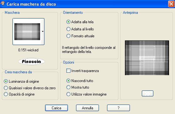 qui puoi trovare qualche risposta ai tuoi dubbi. Se l'argomento che ti interessa non è presente, ti prego di segnalarmelo. Questo tutorial è stato scritto e tradotto con PSP X, ma può essere eseguito anche con le altre versioni di PSP. Un ringraziamento agli artisti che hanno creato il materiale usato in questo tutorial. Occorrente: Materiale qui Metti la Maschera nella cartella Maschere. Apri il font e minimizzalo nella tua area di lavoro. Lo troverai nella lista dei font disponibili quando ti servirà. Filtri: Nirvana-Sinfinity (nello zip). 1. Apri una nuova immagine trasparente 580 x 460 pixels, e riempila con il colore bianco.Effetti>Plugins>Nirvana - Sinfinity: ![]() 2. Livelli>Nuovo livello raster. Riempi con il colore #d6d7dc.Livelli>Carica/Salva maschera>Carica maschera da disco. Cerca e carica la maschera 0151-wicked: ![]() 3. Livelli>Unisci>Unisci gruppo. Effetti>Effetti di bordo>Aumenta, 2 volte. Effetti>Effetti 3D>Sfalsa ombra: ![]() Ripeti l'Effetto Sfalsa ombra, cambiando verticale e orizzontale con -1. Apri il tube Hanne-beauty e vai a Modifica>copia. Torna al tuo lavoro e vai a Modifica>Incolla come nuovo livello. Immagine>Ridimensiona, all'85%, tutti i livelli non selezionato. Sposta il tube a destra.Apri il tube Marif-misted_decor0175, e vai a Modifica>copia. Torna al tuo lavoro e vai a Modifica>Incolla come nuovo livello. Immagine>Ridimensiona, all'80%, tutti i livelli non selezionato. Sposta il tube a sinistra.Apri bw_wordart_kiss. Immagine>Ridimensiona, al 20%. Modifica>Copia. Torna al tuo lavoro e vai a Modifica>incolla come nuovo livello. Sposta il testo dove preferisci, o come nel mio esempio.Regola>Messa a fuoco>Metti a fuoco. Effetti>Effetti 3D>sfalsa ombra, con i settaggi precedenti. 4. Immagine>Aggiungi bordatura, 2 pixels, simmetriche, con il colore bianco. Immagine>Aggiungi bordatura, 20 pixels, simmetriche, con un colore qualsiasi. Seleziona questo bordo con la bacchetta magica ![]() ![]() Livelli>Nuovo livello raster. Riempi la selezione con il bianco.Effetti>Plugins>Nirvana - Sinfinity, con i settaggi precedenti. Livelli>Nuovo livello raster. Riempi con il bianco.Abbassa l'opacità di questo livello al 40%. Selezione>Deseleziona. Livelli>Unisci>Unisci visibile. Immagine>Aggiungi bordatura, 2 pixels, simmetriche, con il colore bianco. Aggiungi il tuo nome e/o il tuo watermark e salva in formato jpg. Per il mio testo ho usato il font AlfonsoWhitehead (nello zip), con il colore di sfondo #d6d7dc. Effetti>Effetti 3D>sfalsa ombra, con i seguenti settaggi: ![]() Salva in formato jpg. ![]() Se hai problemi o dubbi, o trovi un link non funzionante, o anche soltanto per un saluto, scrivimi. 14 Luglio 2008 |